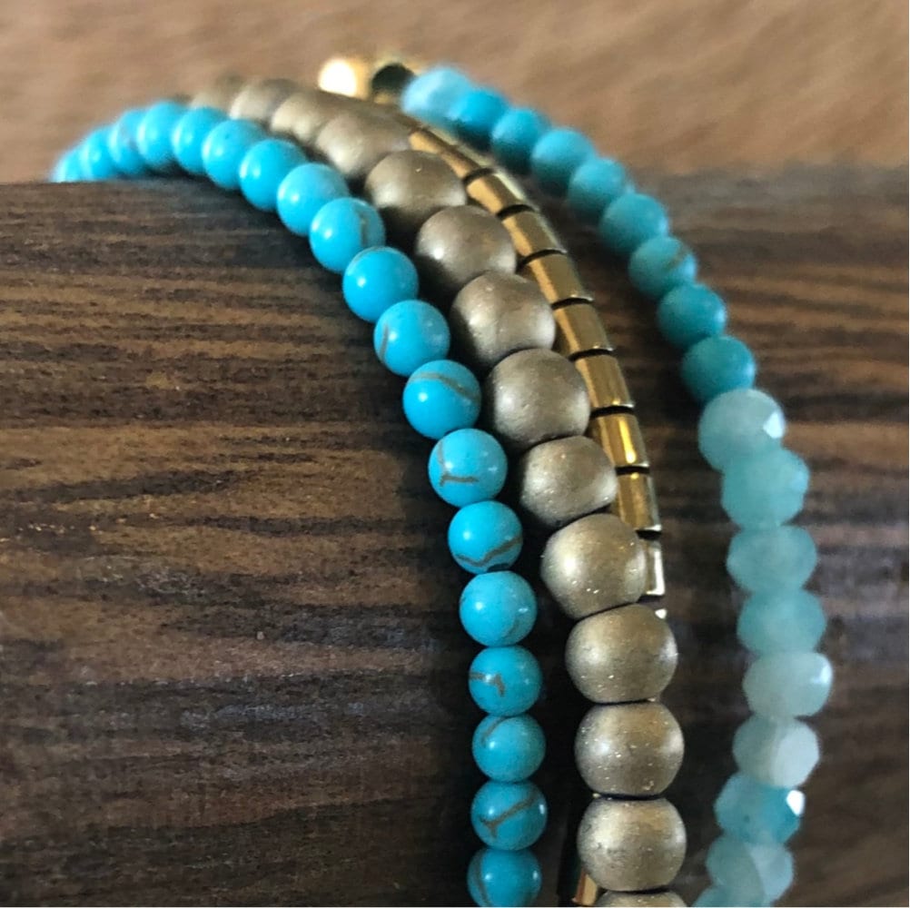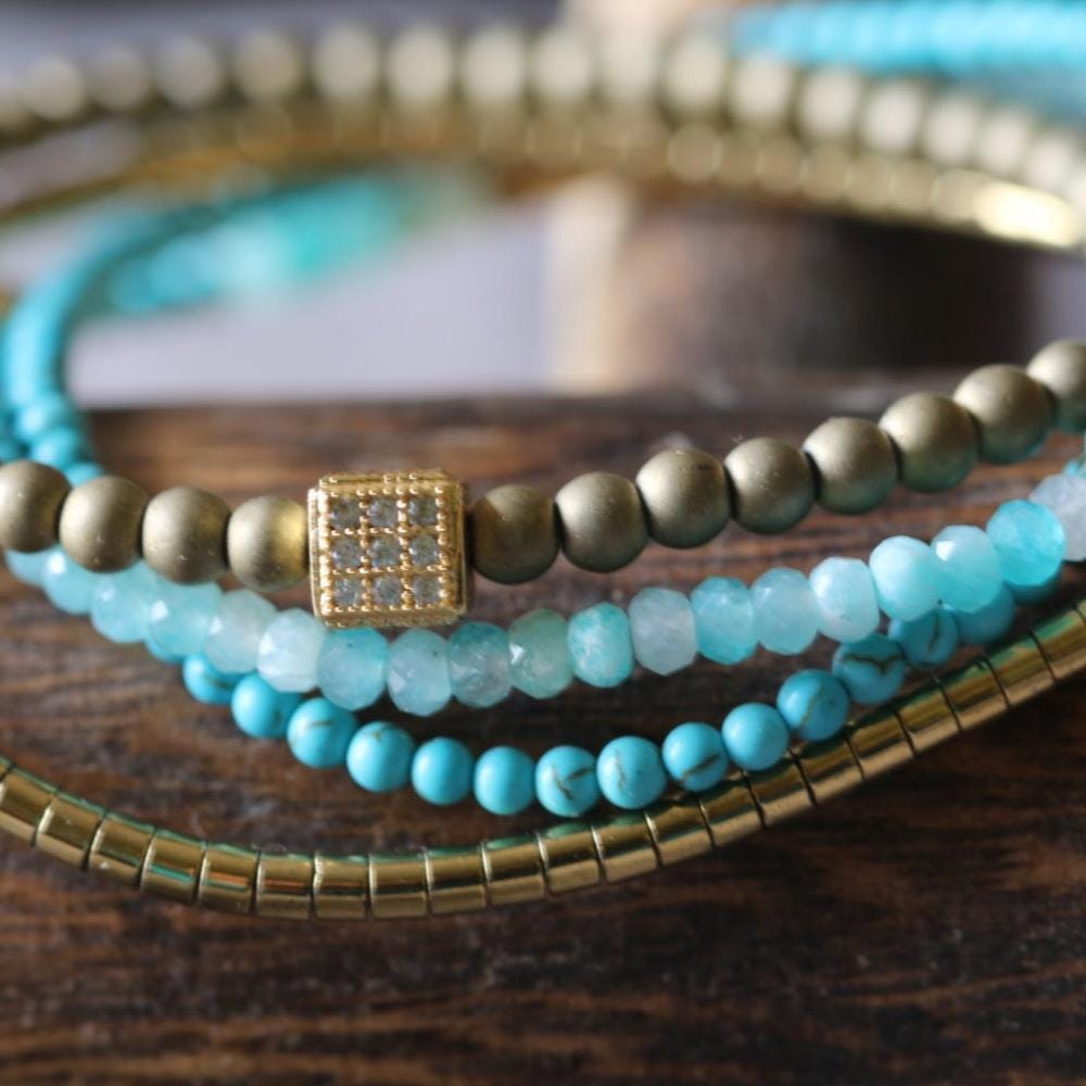 Materials: Amazonite beads, Turquoise beads, Hematite beads, Elastic cord, Gemstone sorting, Stretch bracelet, base Polishing cloth Quality control check, Tiny 2mm stones, Gold tone accents, Hand stringing work, Color matched beads, magnet closure, square bead.