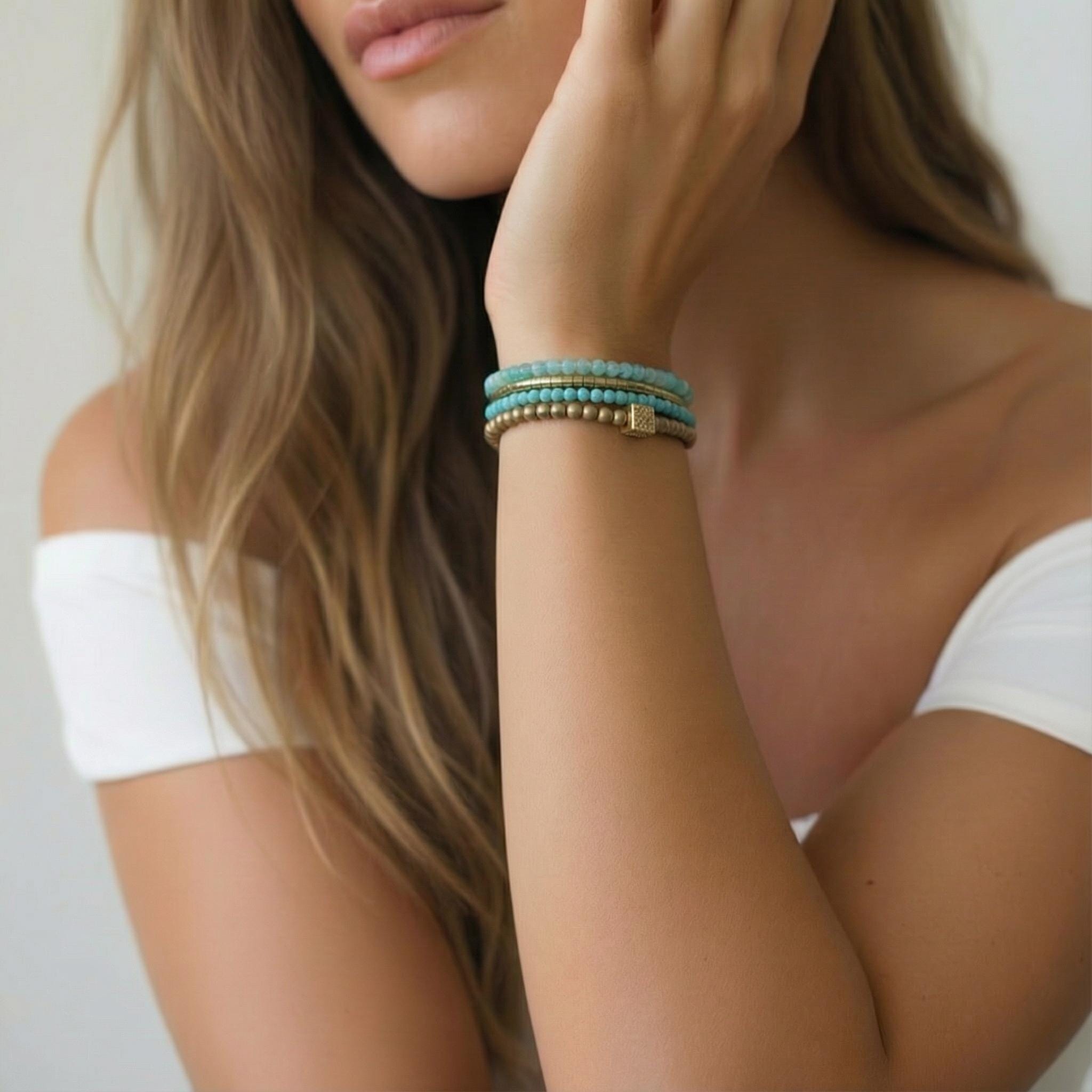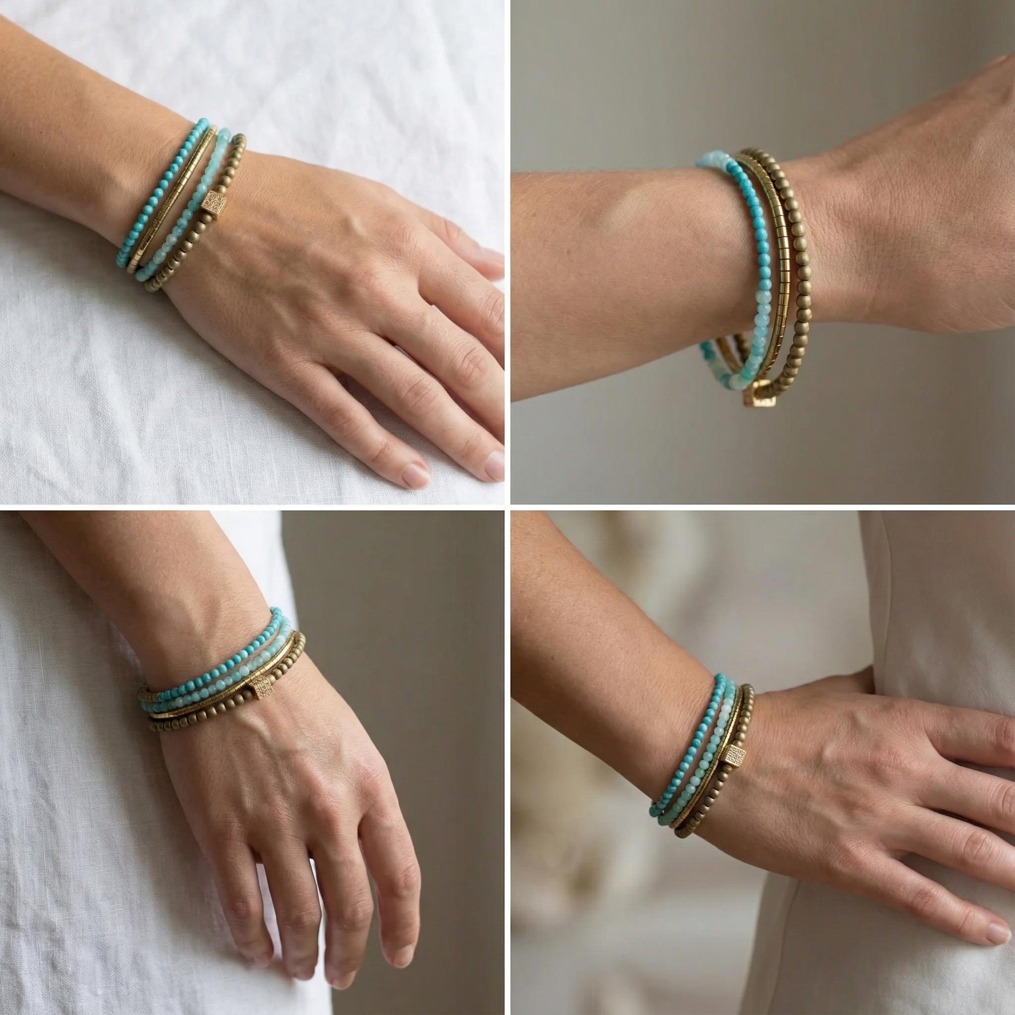 Bring a soft, effortless glow to your style with this turquoise and gold wrap bracelet, handcrafted from tiny Amazonite, Turquoise, and Hematite beads. The delicate 2–3 mm stones create a natural layered look that wraps beautifully around the wrist, giving you the feel of multiple bracelets in one lightweight, comfortable piece.