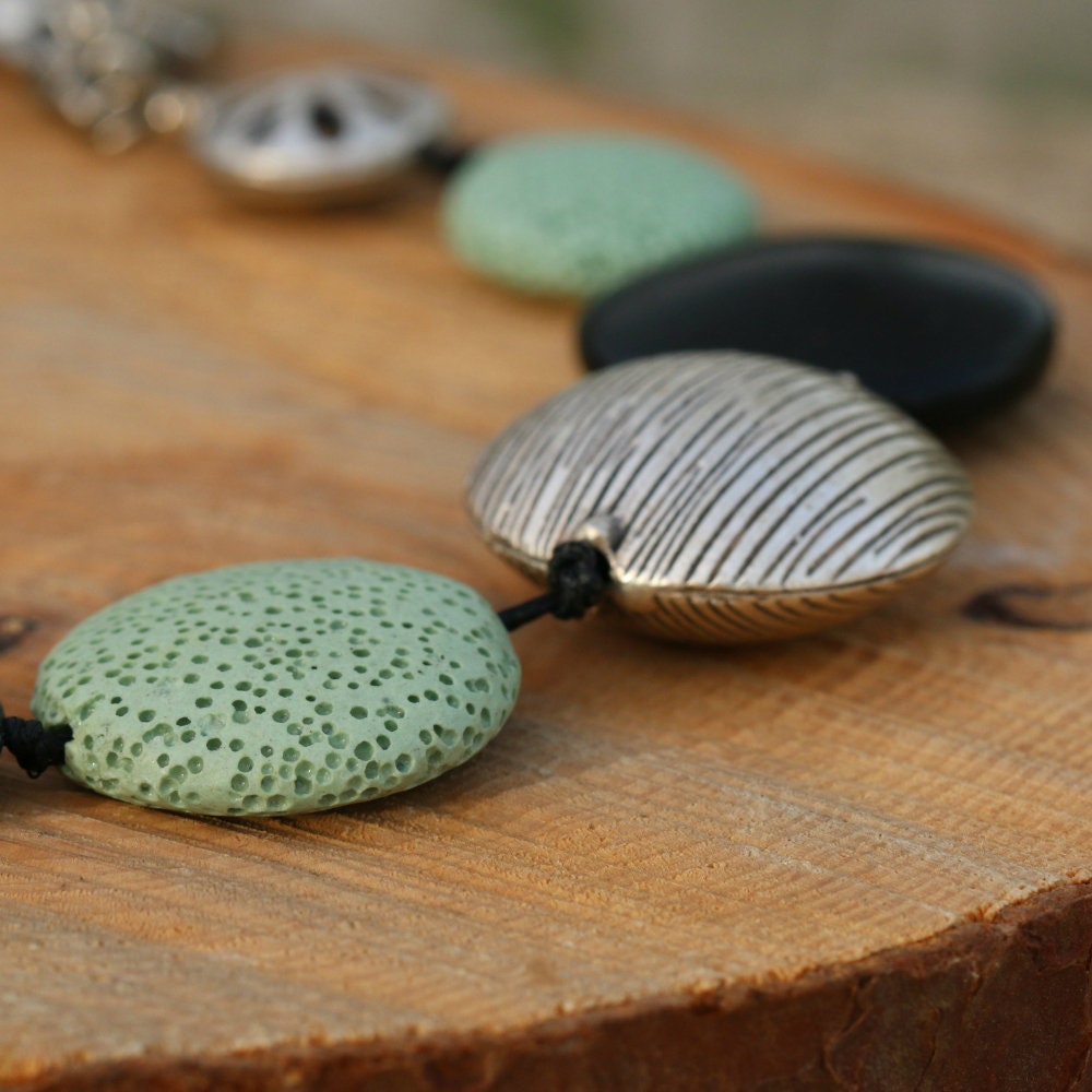 Materials: onyx beads, zebra jasper bead, lava beads, silver plated beads, green agate beads, leather cord.