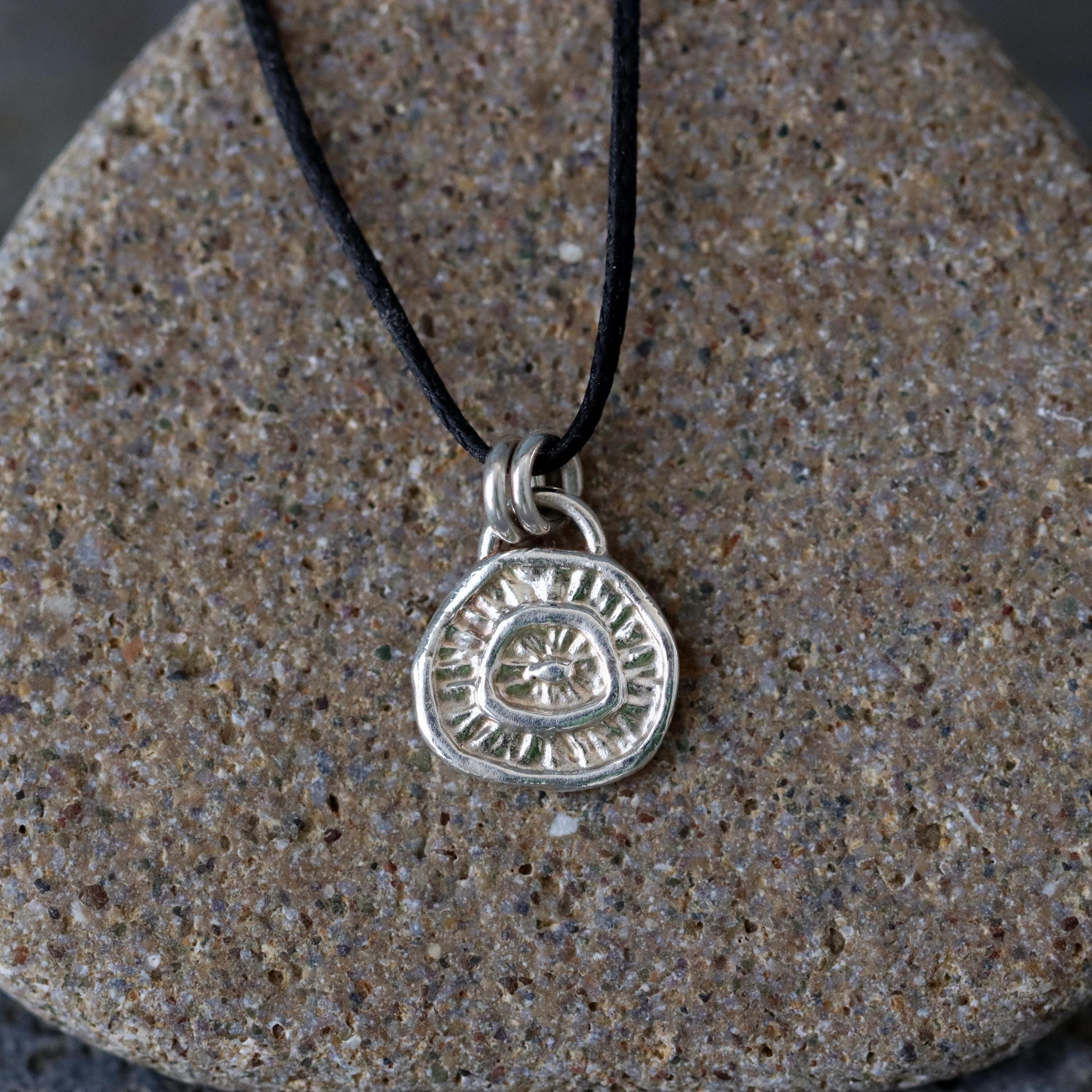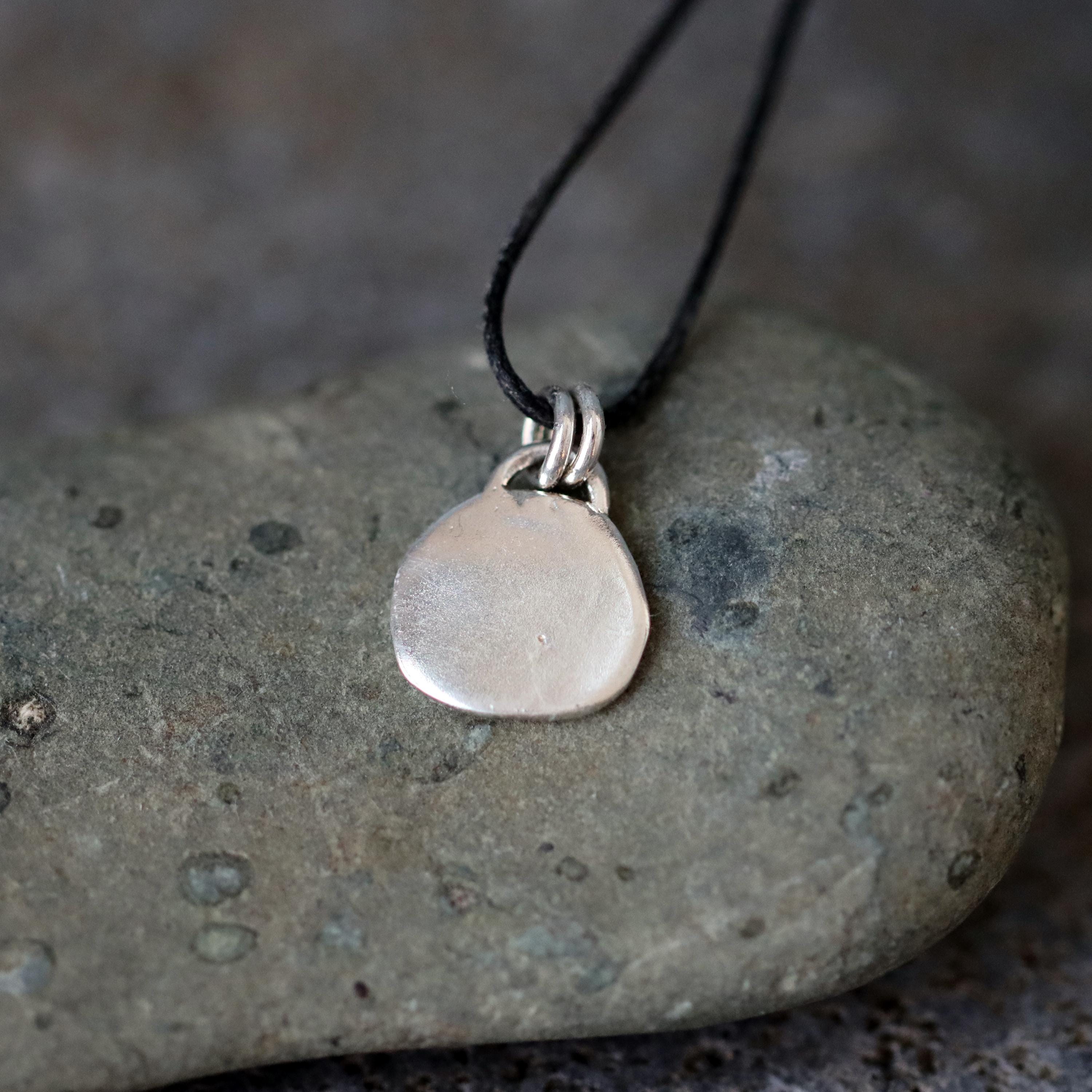 The softly rounded coin shape and textured surface give it the feeling of an ancient relic—something discovered rather than designed. With its cool silver sheen and timeless simplicity, this pendant is a daily reminder of the harmony between nature and craft.