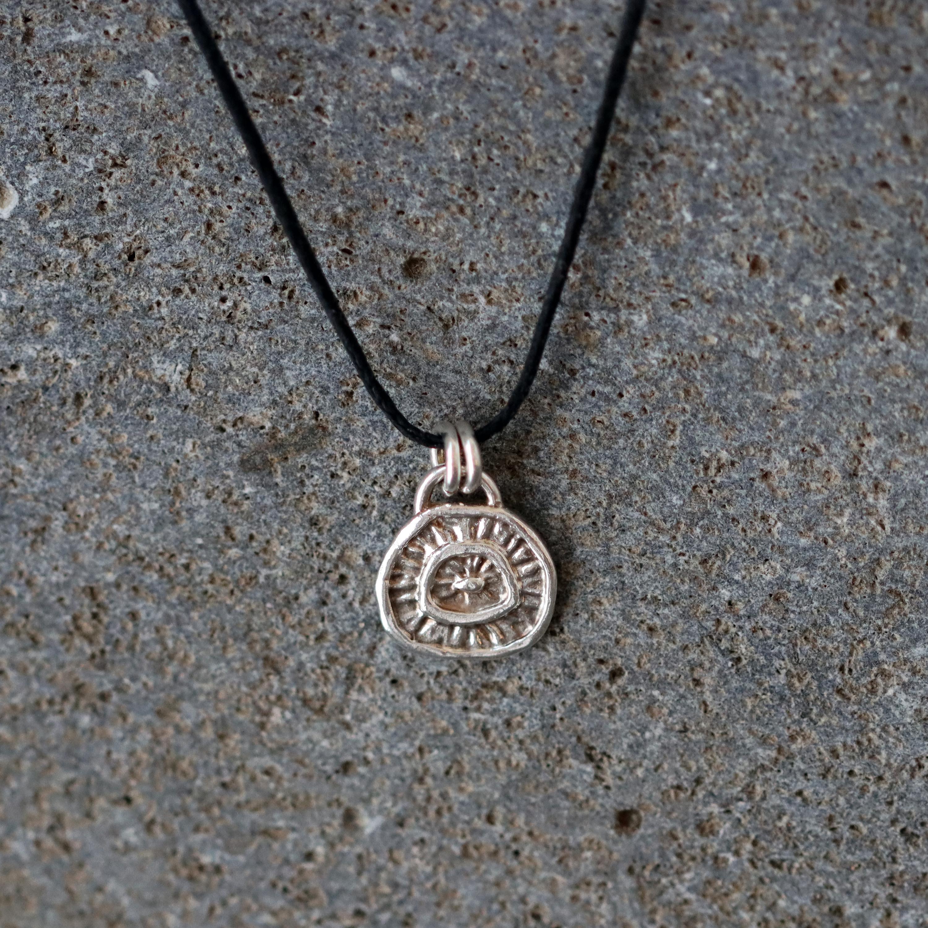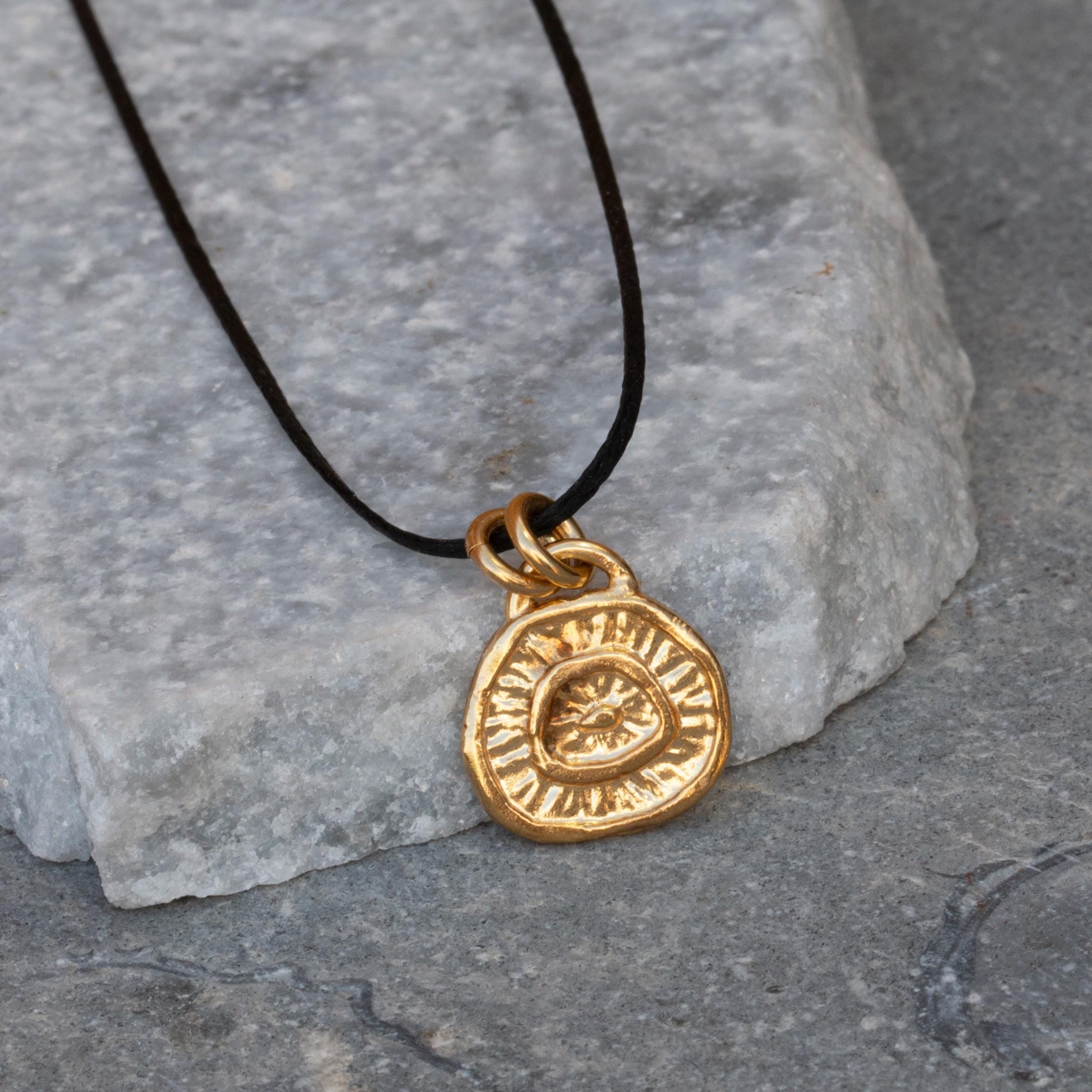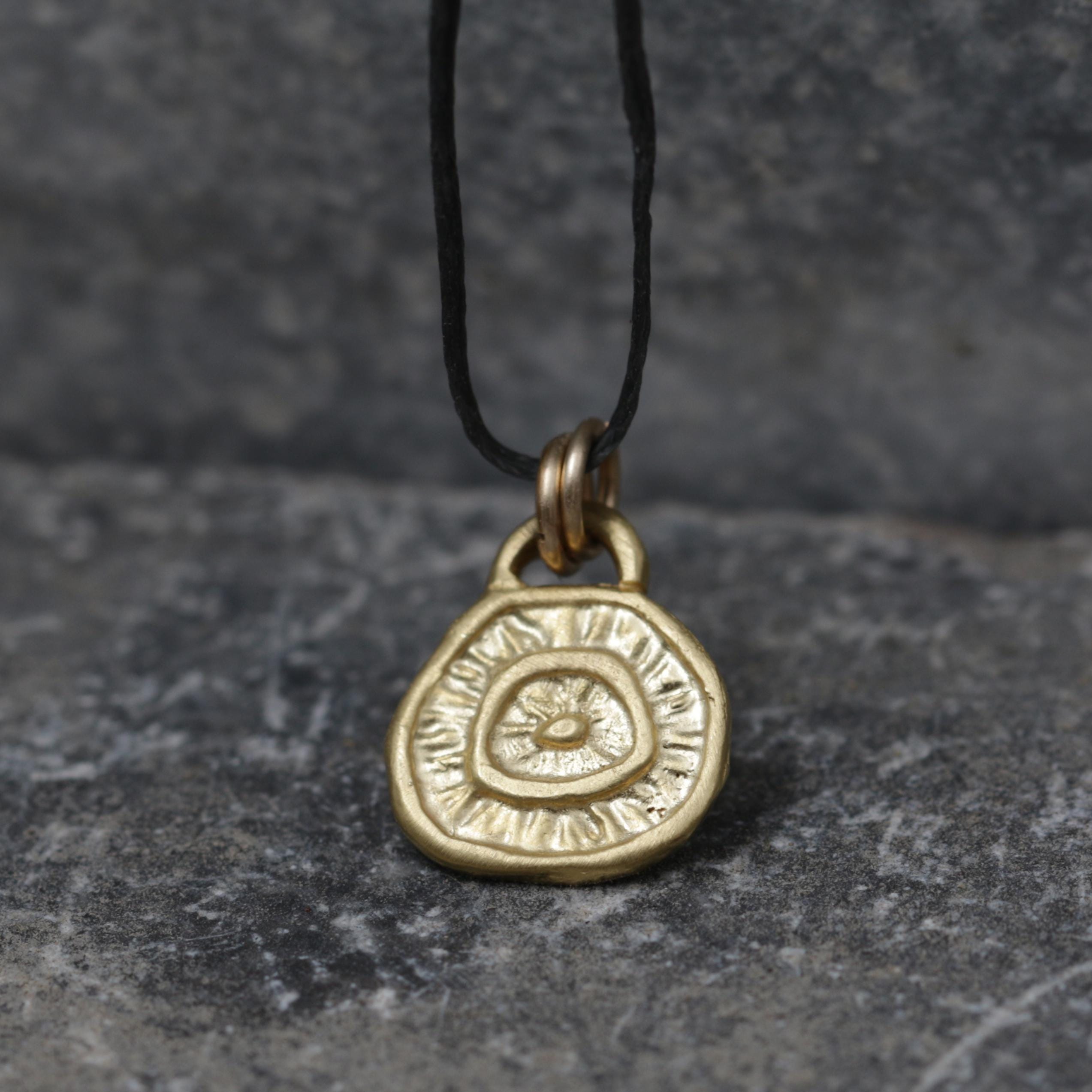 The coin-shaped pendant carries a soft, tactile surface, created through an intuitive handmade process that makes every piece truly one of a kind. Its warm golden tone glows softly against the skin, making it perfect for everyday wear or meaningful gifting.