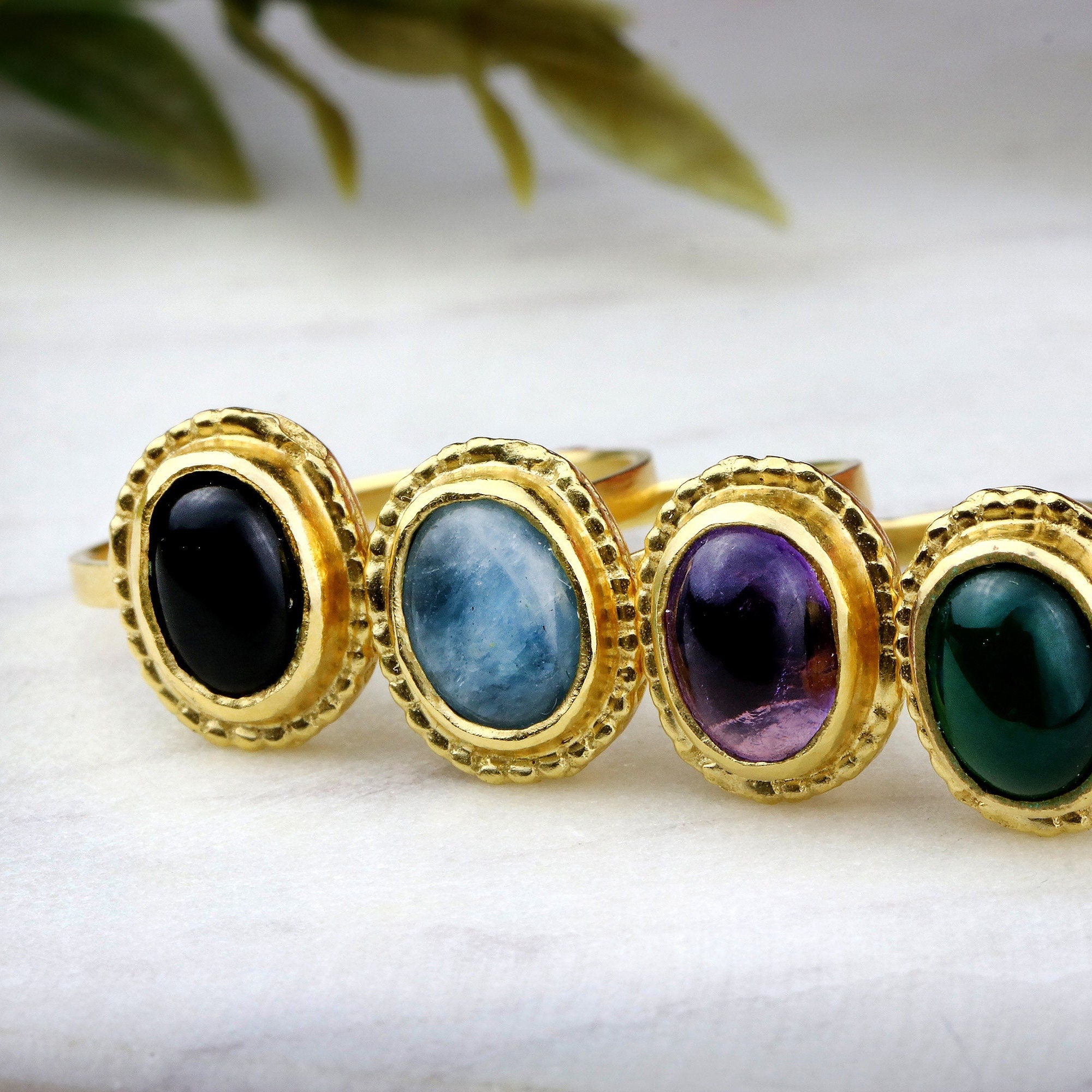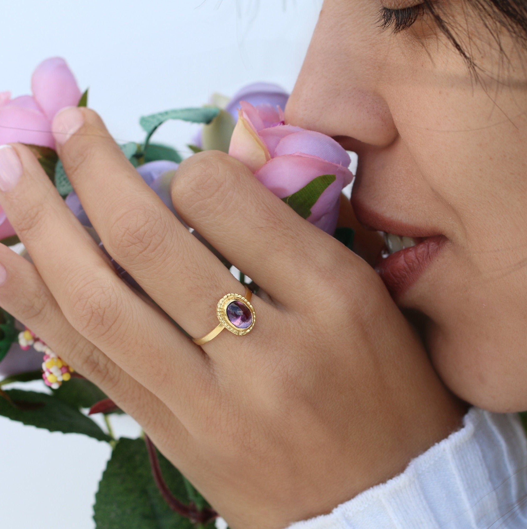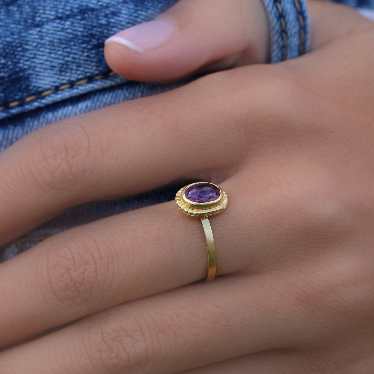 Materials: sterling silver, gold filled, gold plating, solid gold, Amethyst gem stone, 14k solid gold, vermeil ring, Amethyst Crystal, 925 sterling silver, Yellow gold ring, Oval Crystal Cabochon.
