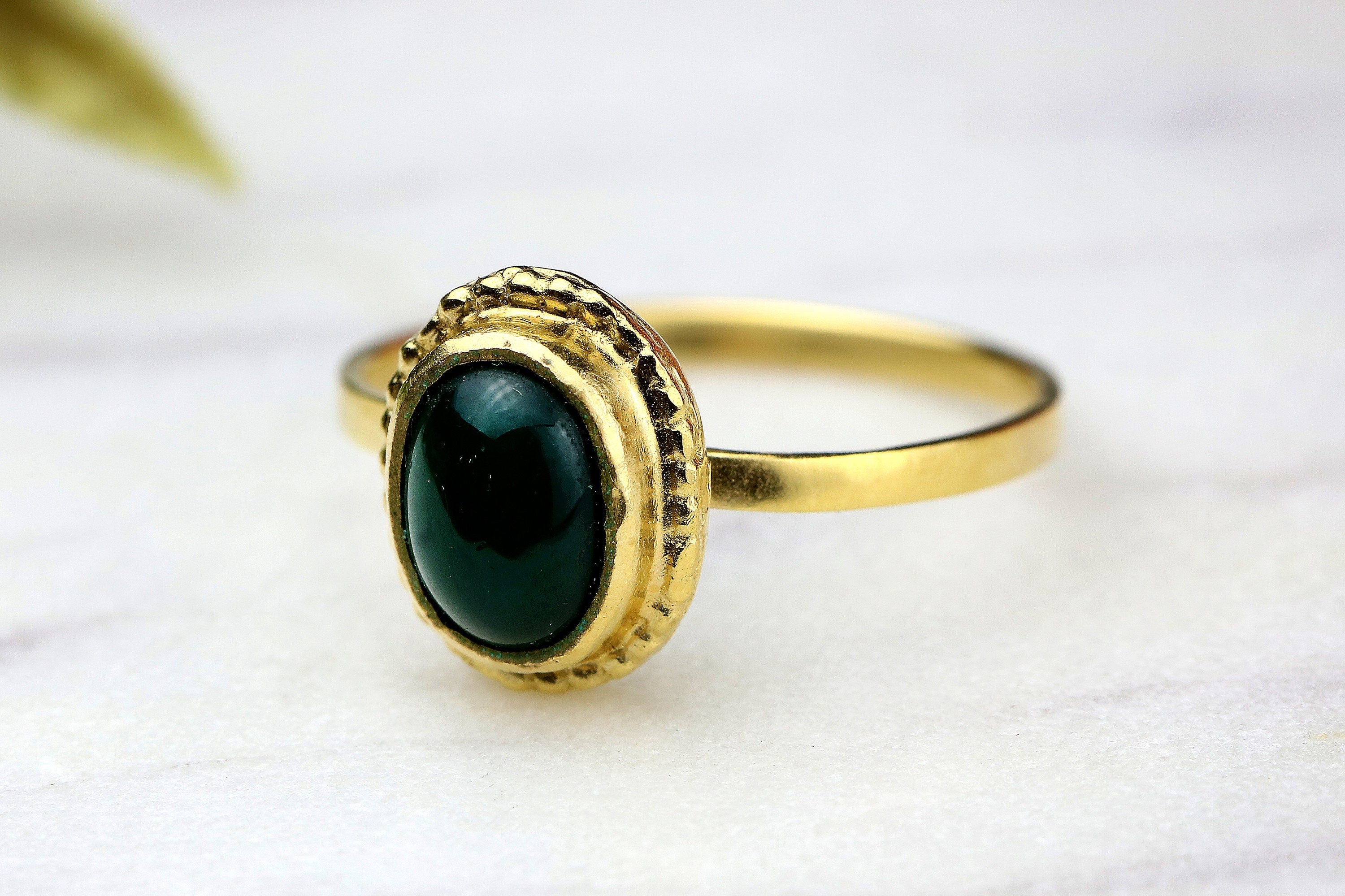 Embellish your look with the timeless beauty of this Green Onyx ring, fashioned in gold. A gorgeous jewelry ring piece to add to your jewelry box or an ornate piece to give as a loving surprise for someone special. This gold ring is surprisingly easy to style - wear with a beautiful evening dress, casual clothes, or other jewelry pieces to glam yourself up for any occasion or even to run your daily errands.