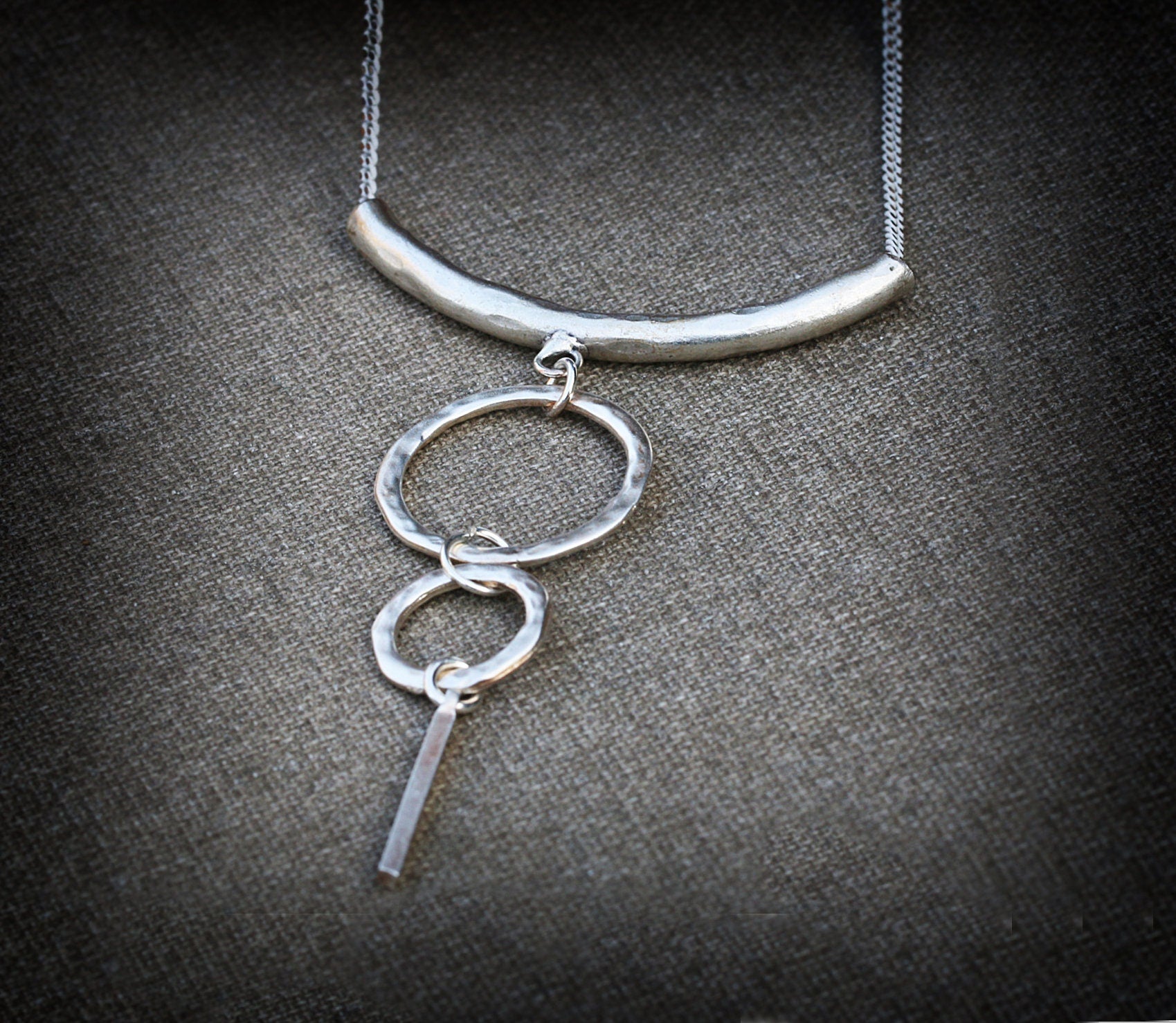 Complete your ensembles with this long statement necklace. This silver necklace features a pendant with combined geometric shapes and is strung on a silver chain that flows beautifully to complement your shape and silhouette. Wear and match with other silver jewelry to express your own original style.