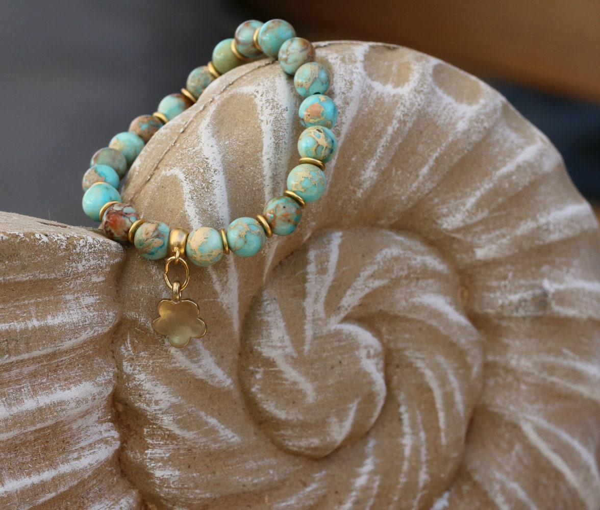 Materials: gold over brass beads, gold beads, silk tassel, golden charms, jade beads, howlite beads, round gemstone beads, silicon bracelet.