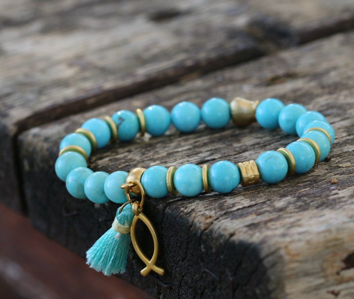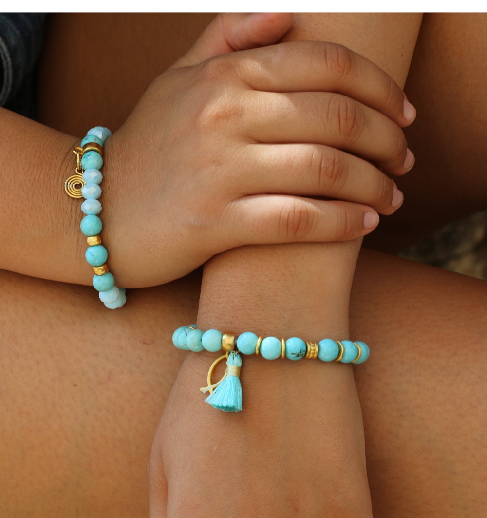 Bring charm and blue beauty to your ensembles with this beaded bracelet. This delicately handmade jewelry for women is crafted with fine and vibrant Howlite gemstones. Wear the colors and the energy of the ocean with this bead bracelet. Howlite stones inspire and strengthen ambition and help soothe anger.