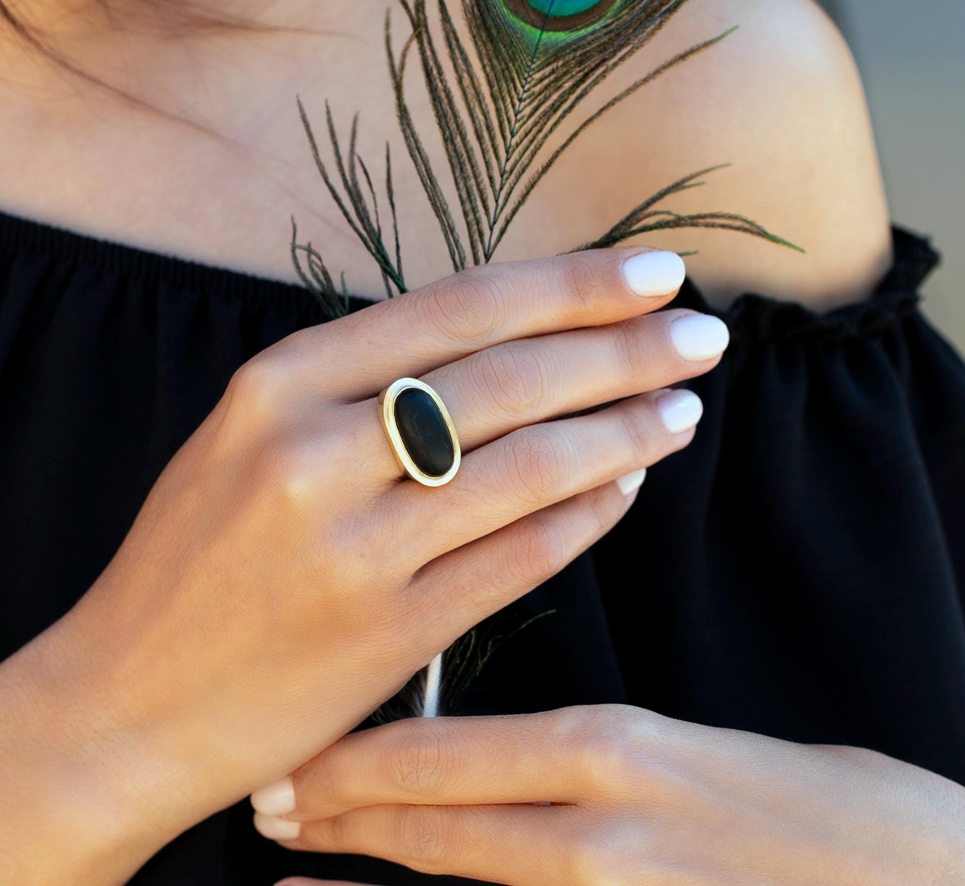 Elevate your style with this stunning Black Onyx Gold Statement Oval Ring. Handcrafted for elegance, this Cocktail Ring is a perfect choice for February birthdays. The striking solitaire design ensures a timeless and sophisticated look. Make a statement with this exquisite ring today!