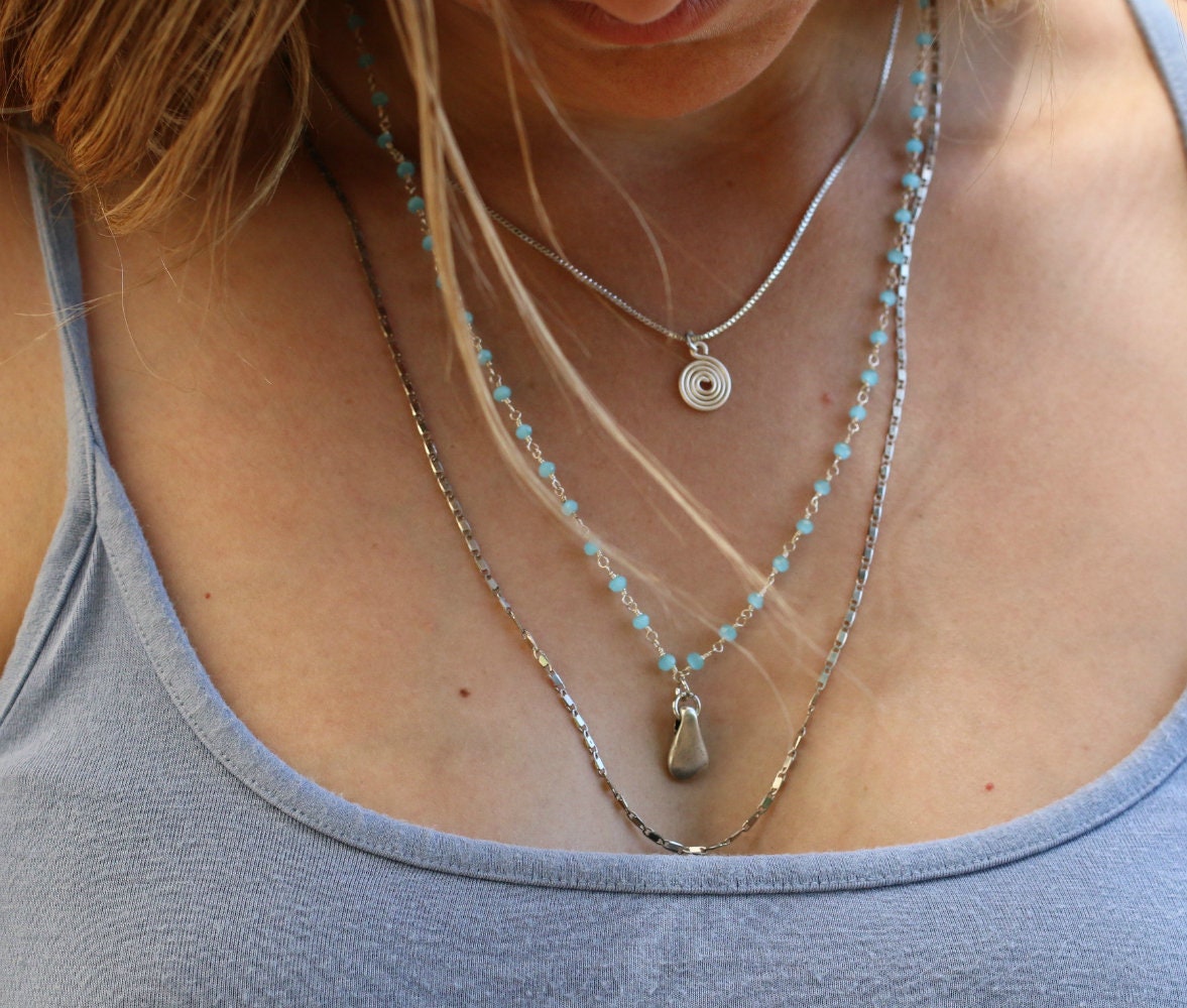 Materials: 3 pendants, geometric pendants, 3 layered chain, Multi Strand Necklace, spiral pendant, teardrop pendant, dainty link chain, chalcedony beaded chain, gemstone necklace, silver chain, silver pendants.