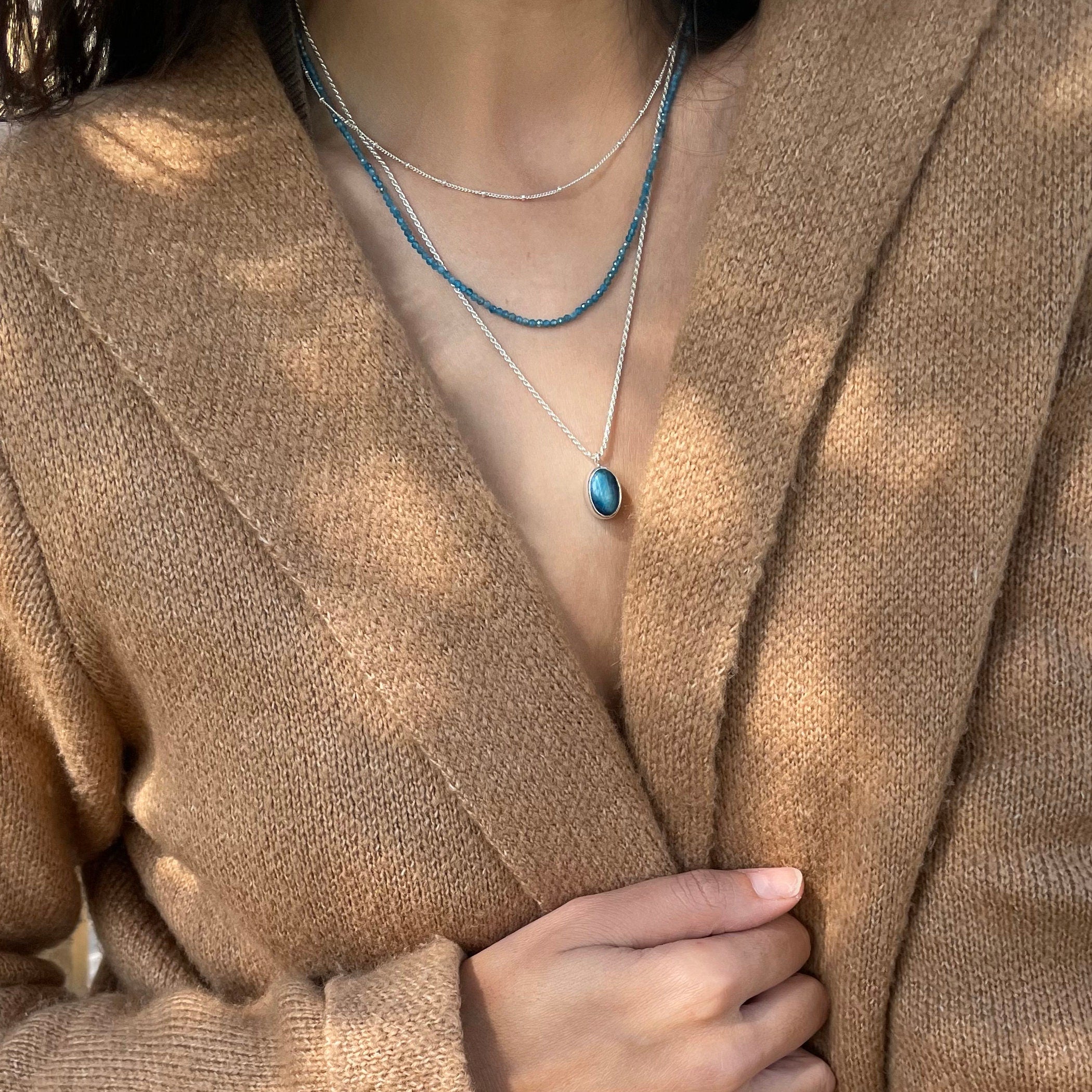 Add a touch of bohemian elegance to your look with this stunning set of three layered necklaces. Handmade with silver and apatite beads, these necklaces feature a gorgeous blue tyger eye pendant that adds a pop of color to any outfit. The stacked silver necklaces create a unique and stylish layered look that is sure to turn heads. Whether worn together or separately, this set is a versatile addition to your jewelry collection. Elevate your style with this beautiful multi-strand necklace set!
