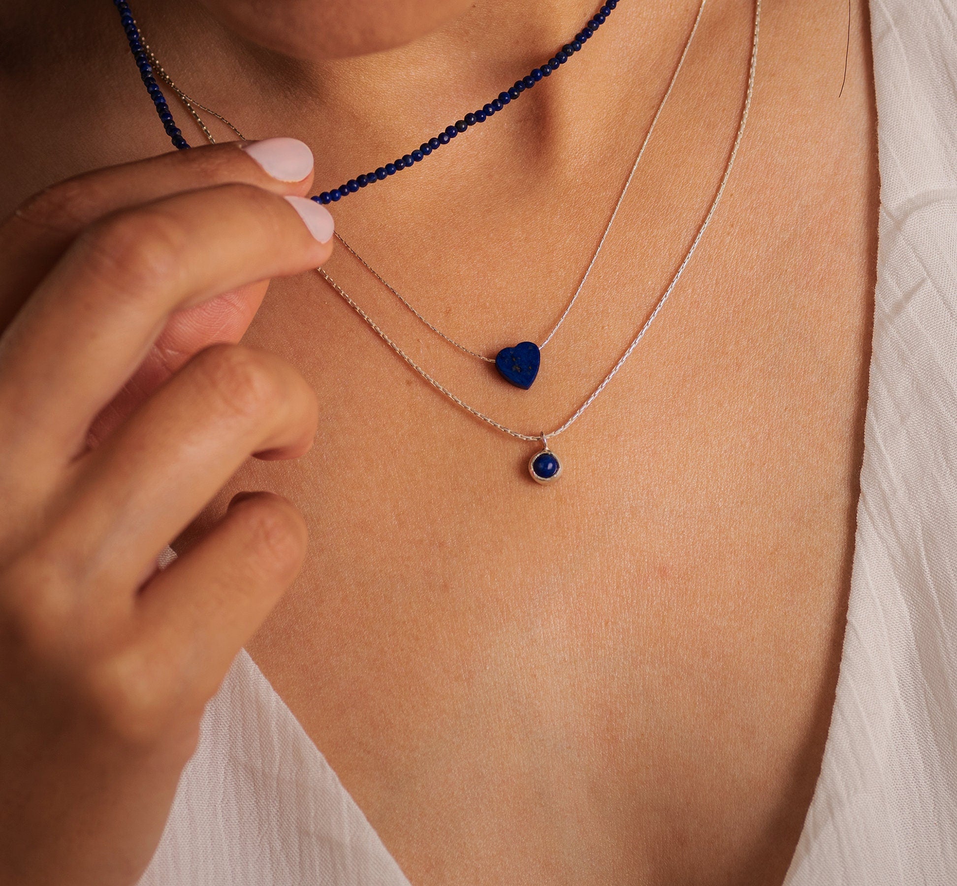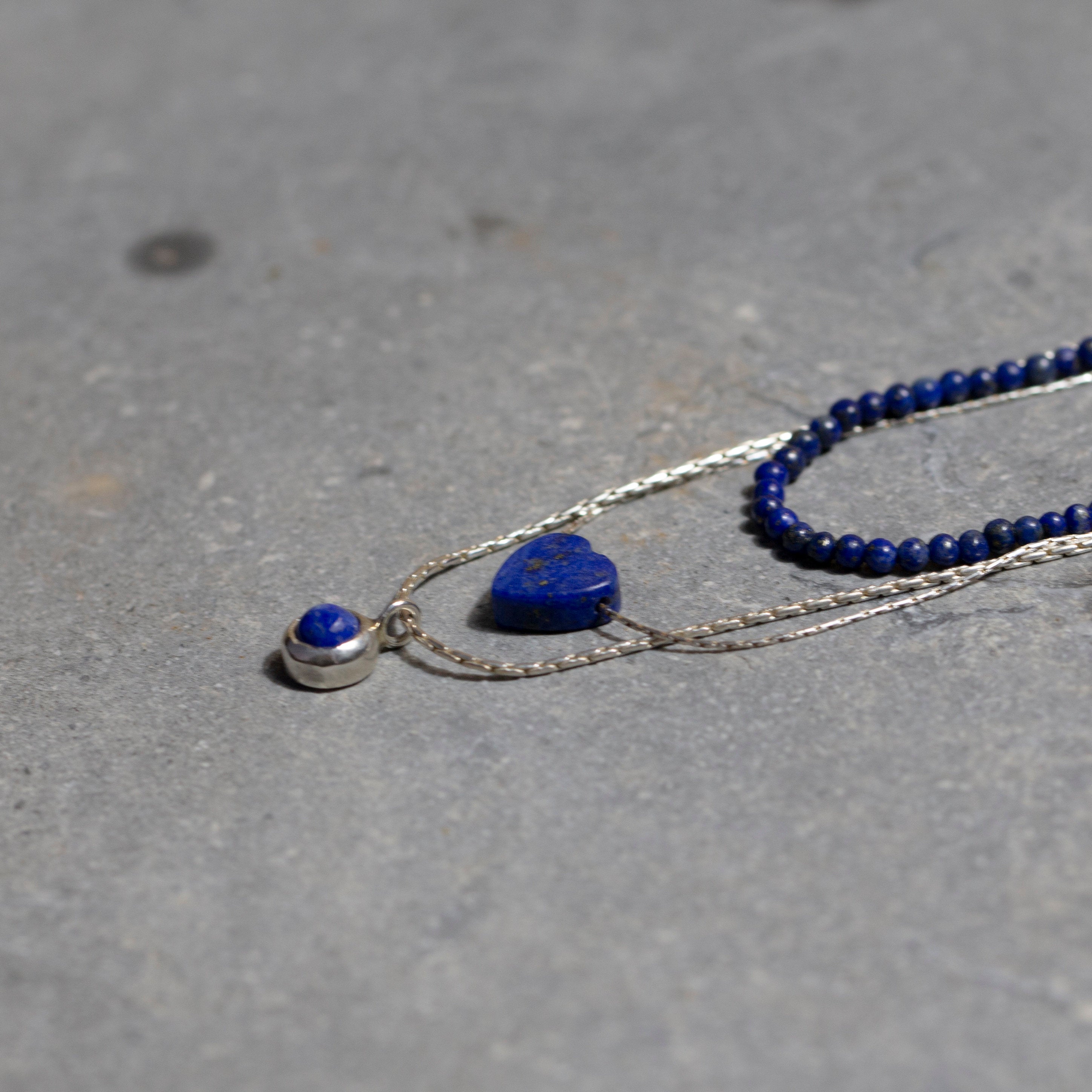 Materials: 3 pendants, geometric pendants, 3 layered chain, Multi Strand Necklace, link chain, lapis Heart Pendant, silver.