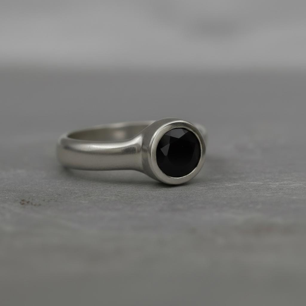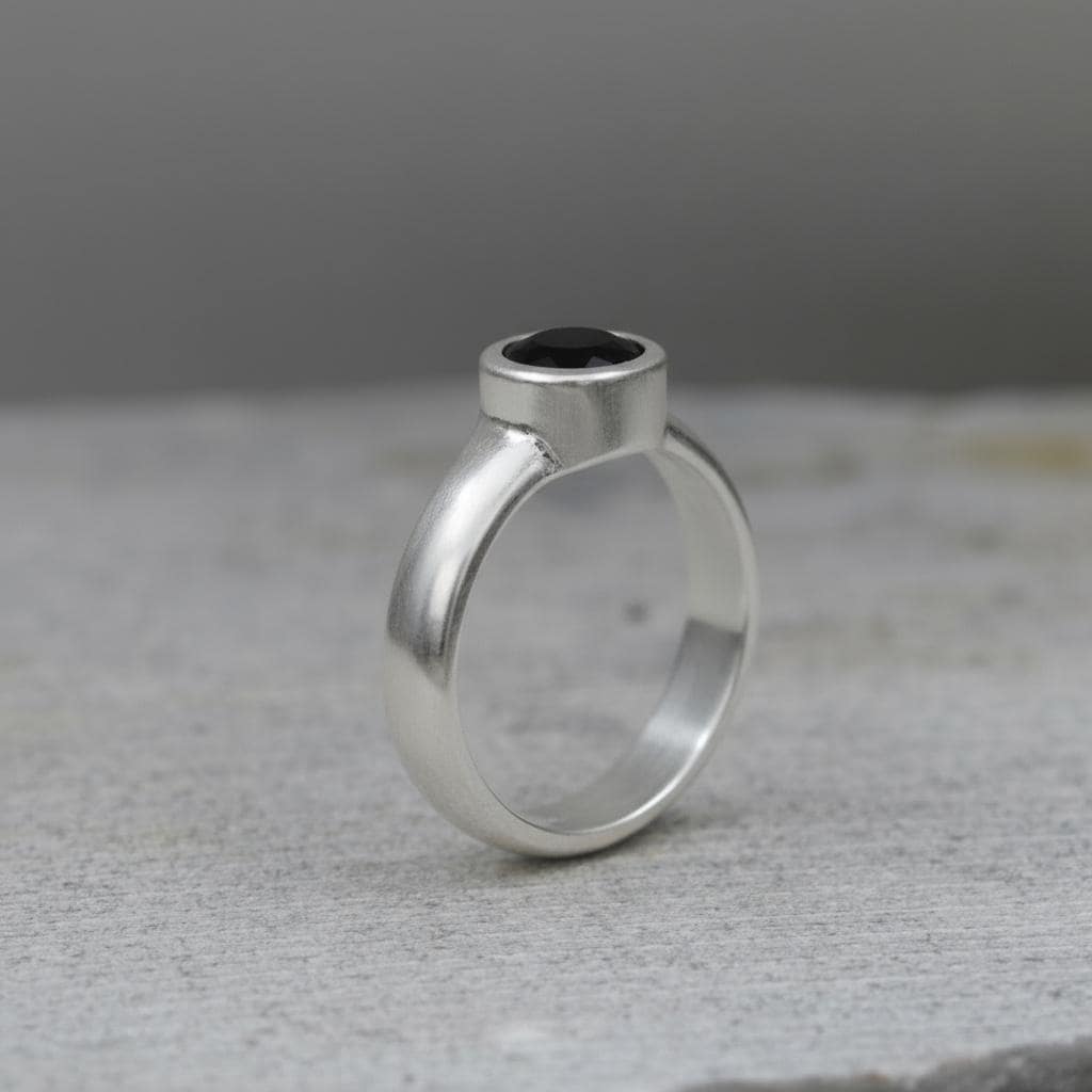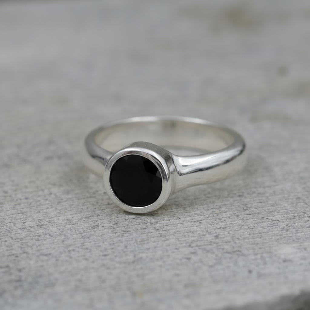 A bold yet timeless design — this handcrafted sterling silver solitaire ring features a deep faceted black onyx gemstone, its mirror-like surface reflecting light with quiet strength and mystery.