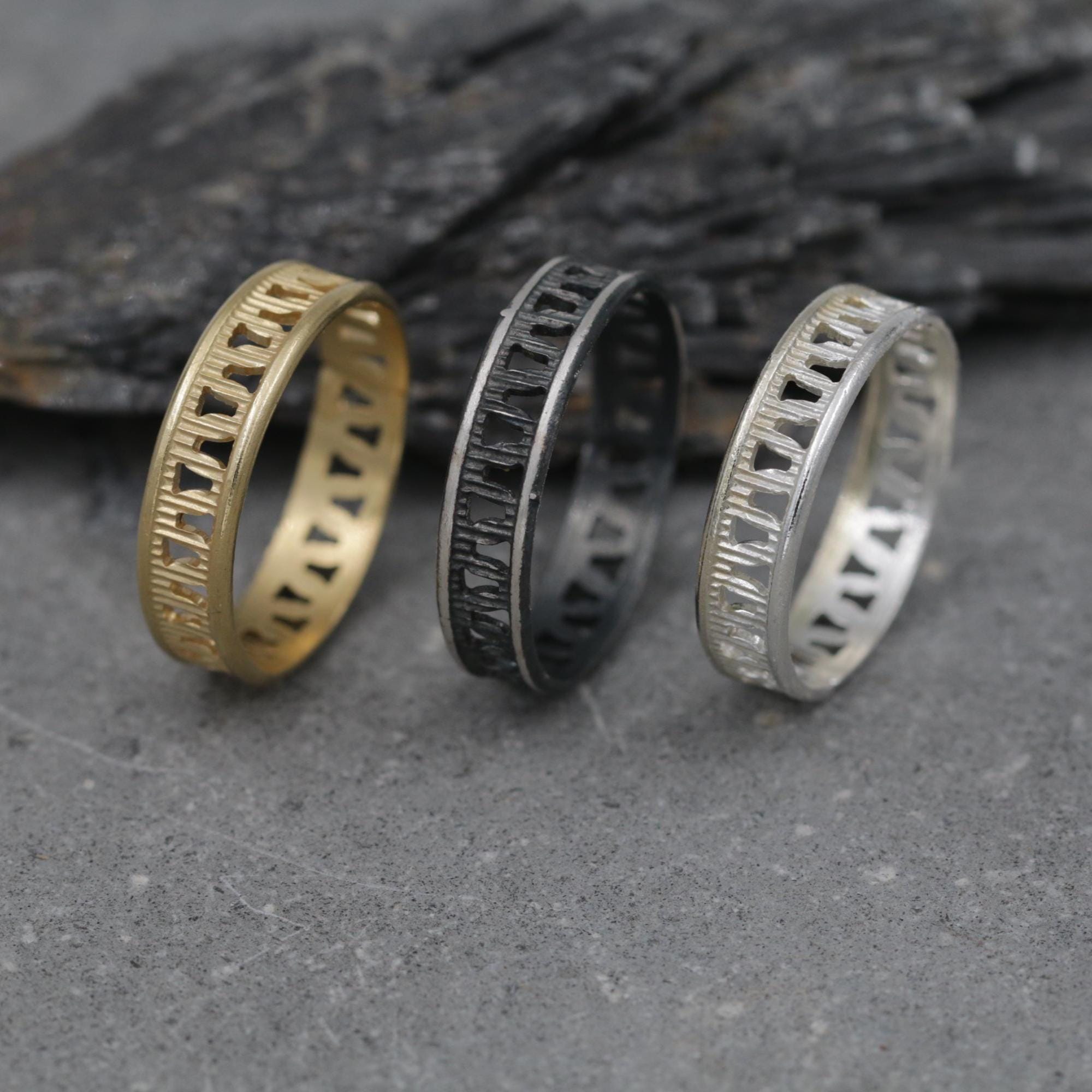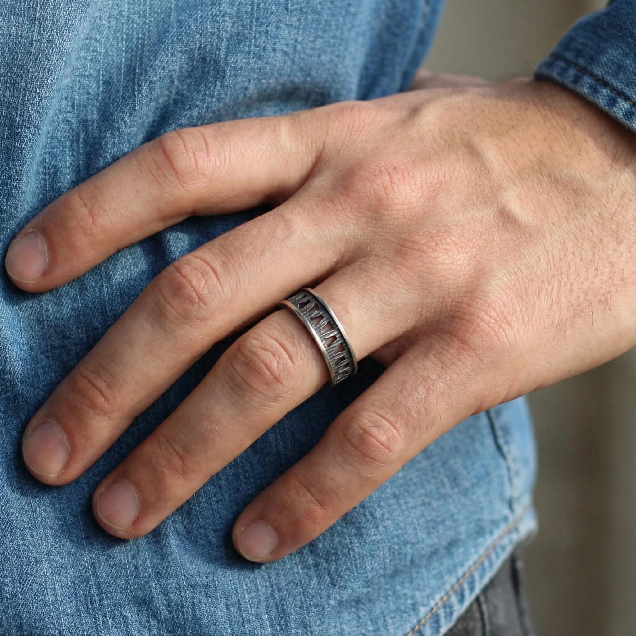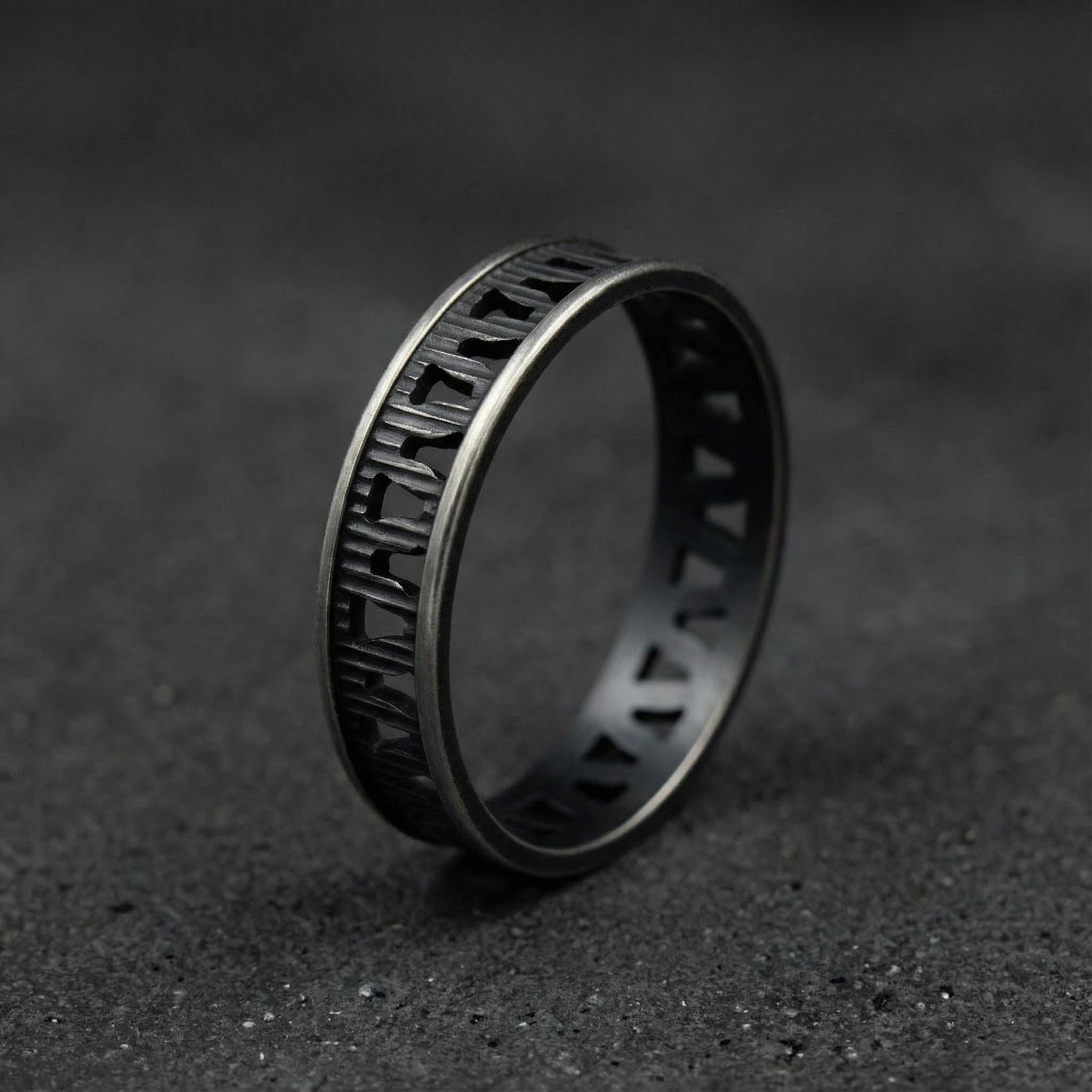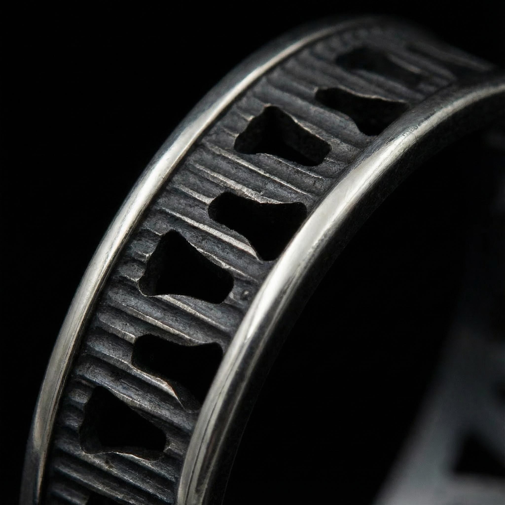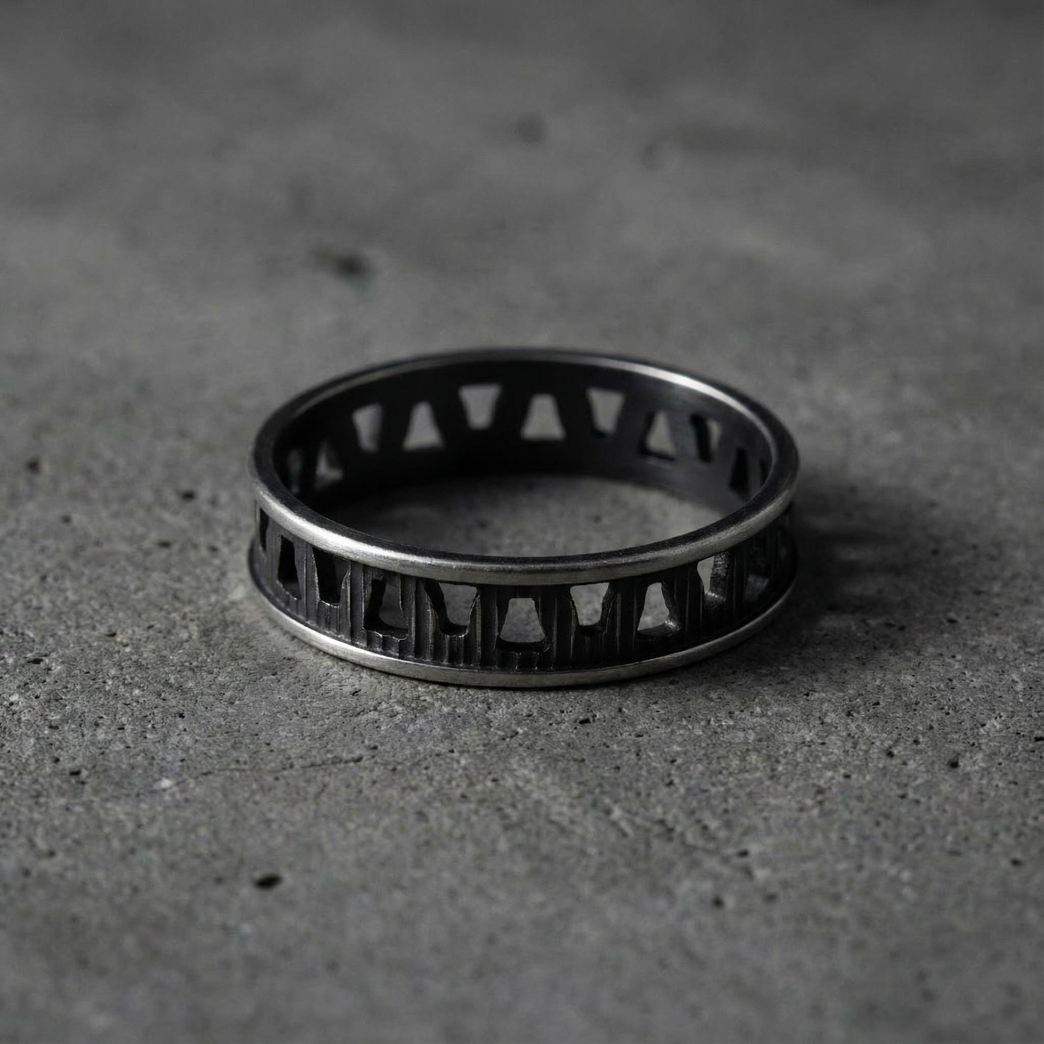 Handcrafted from solid sterling silver and carefully oxidized by hand, this ring balances strength and comfort with an architectural feel. The geometric cut-outs create rhythm and texture, making it an ideal everyday men’s ring for modern, minimalist, or alternative styles. A powerful piece that speaks quietly but confidently.