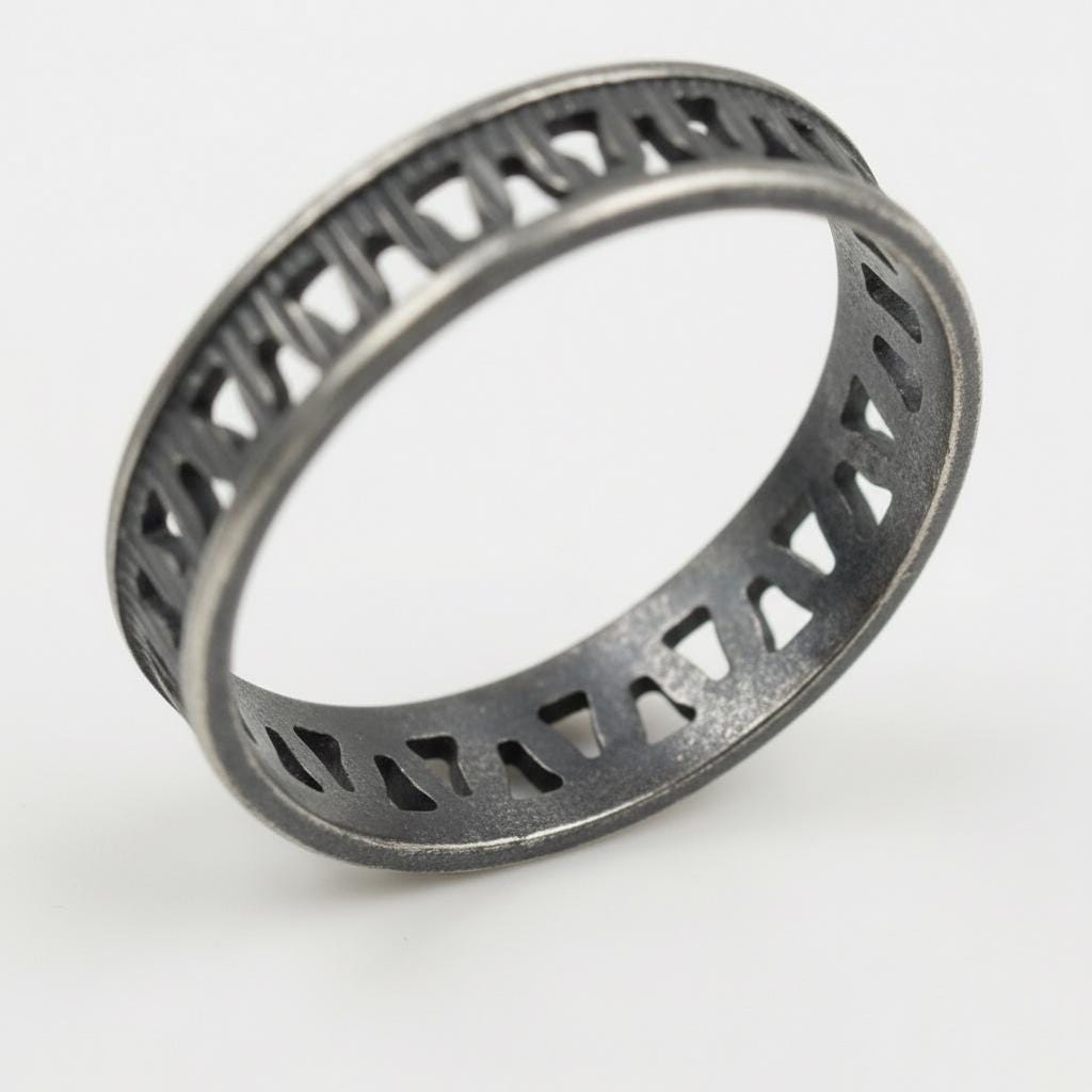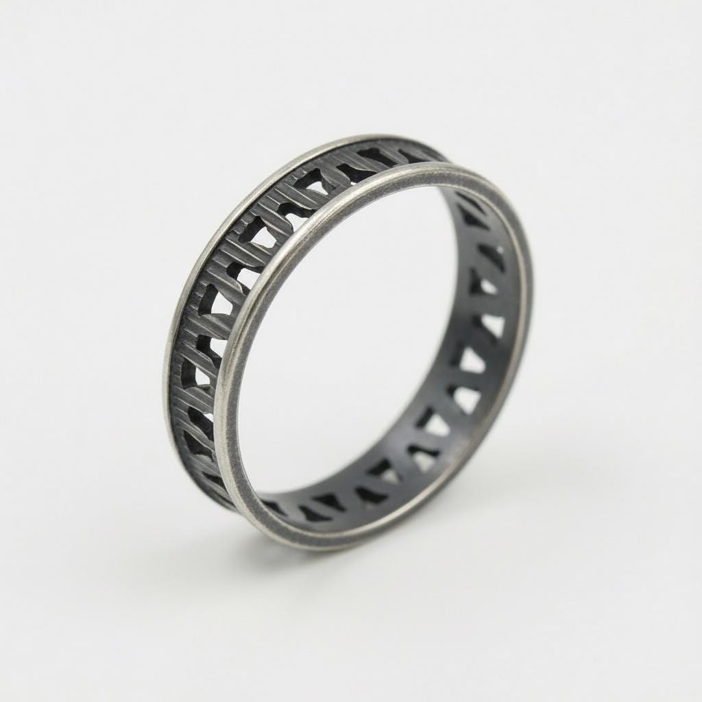 Materials: Sterling silver, Silver solder, Oxidizing solution, Hand shaped band, Geometric cut outs, Openwork structure, Hand filing, Saw cut detailing, Oxidized finish, Selective polishing, Comfort fit, interior Finishing compounds, Final quality check.