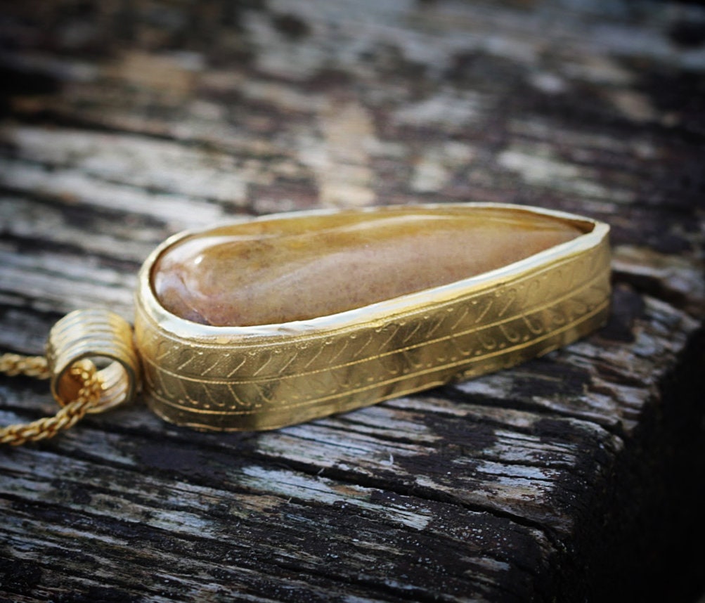 Be mesmerized and adore the beauty of this stone necklace. Suspended in a fine, long necklace chain, the gemstone is set in a bezel setting with intricate engraving on both sides. This Agate necklace will look stunning worn with an evening dress or your simple, everyday outfits.