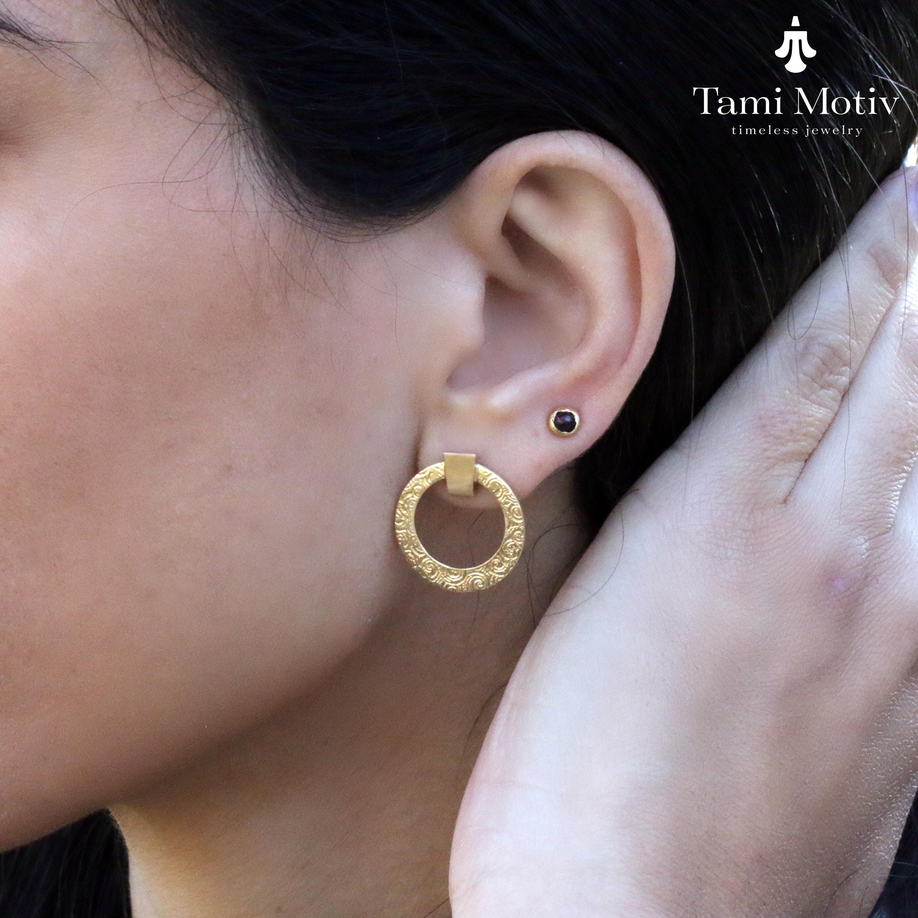 Elevate your style with our stunning statement gold disc handmade spiral textured stud earrings. Crafted with care, these unique earrings feature an eye-catching spiral design that adds a touch of elegance to any outfit. The luxurious gold finish ensures that you’ll shine at every occasion, from casual outings to special events. Lightweight and comfortable, they are perfect for all-day wear. Make a bold fashion statement and enhance your accessory collection with these beautiful textured stud earrings. Ideal for gifting or treating yourself!
