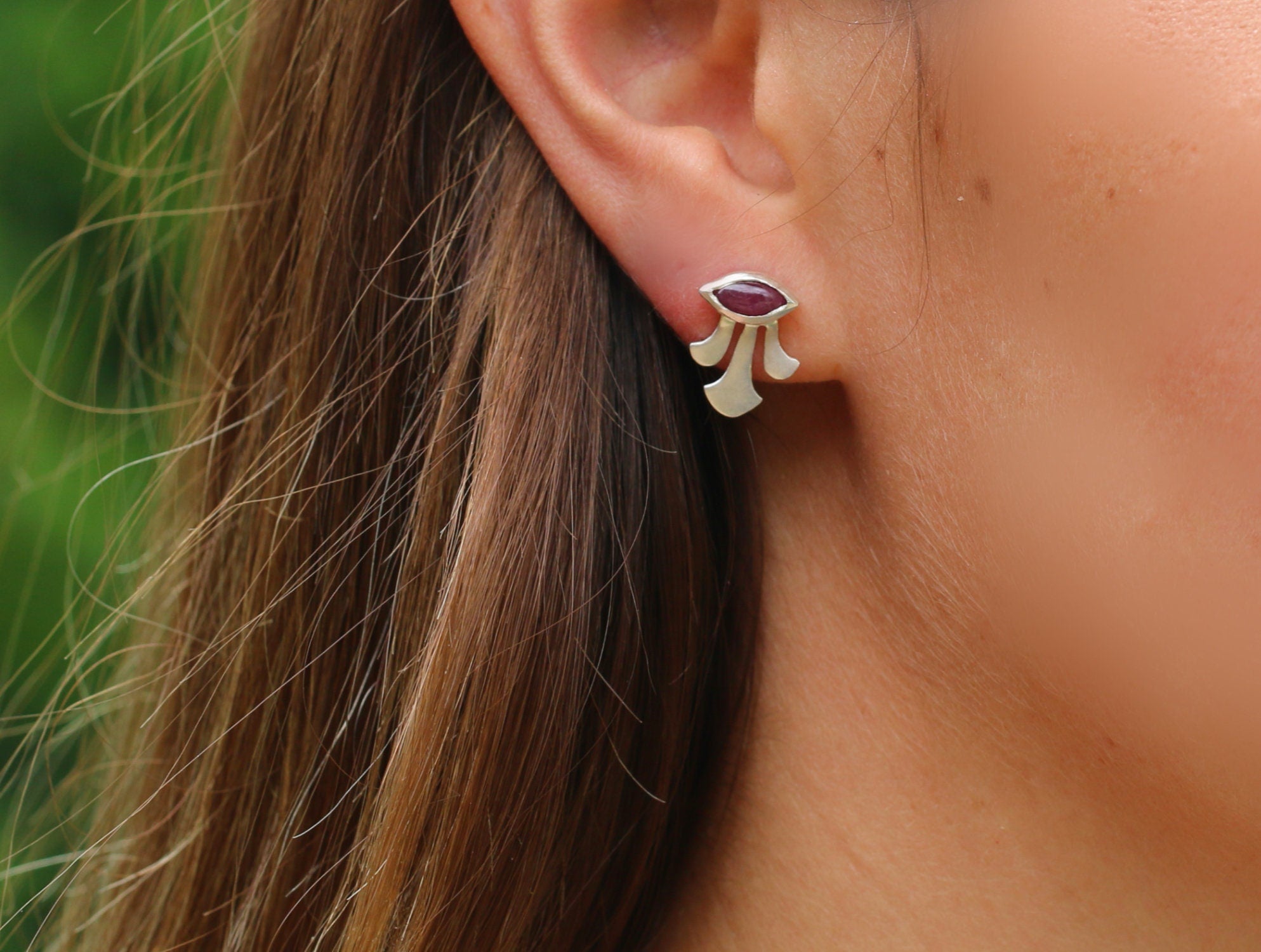 Dainty and chic, these 925 Silver earrings are made with a unique design. Reminiscent of a blooming lotus flower, this pair is crafted with marquise Ruby stones with three petal-like shapes emerging from the bottom of the stone. A pair of women or teen earrings that can be worn as casual, formal or boho earrings jewelry.