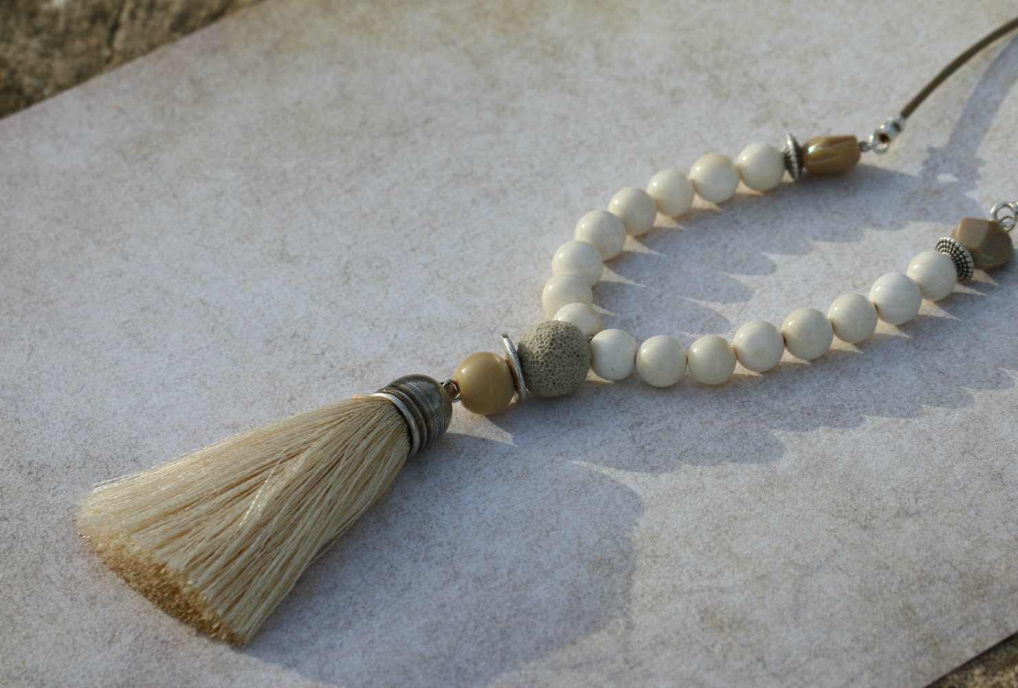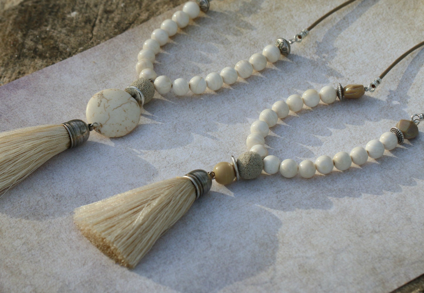 Materials: tassel, plated rolo chain, Leather cord, long tassel, long necklace, silk tassel, long silk tassel, beige silk tassel, howlite beads, beige round howlite beads, januine howlite beads.