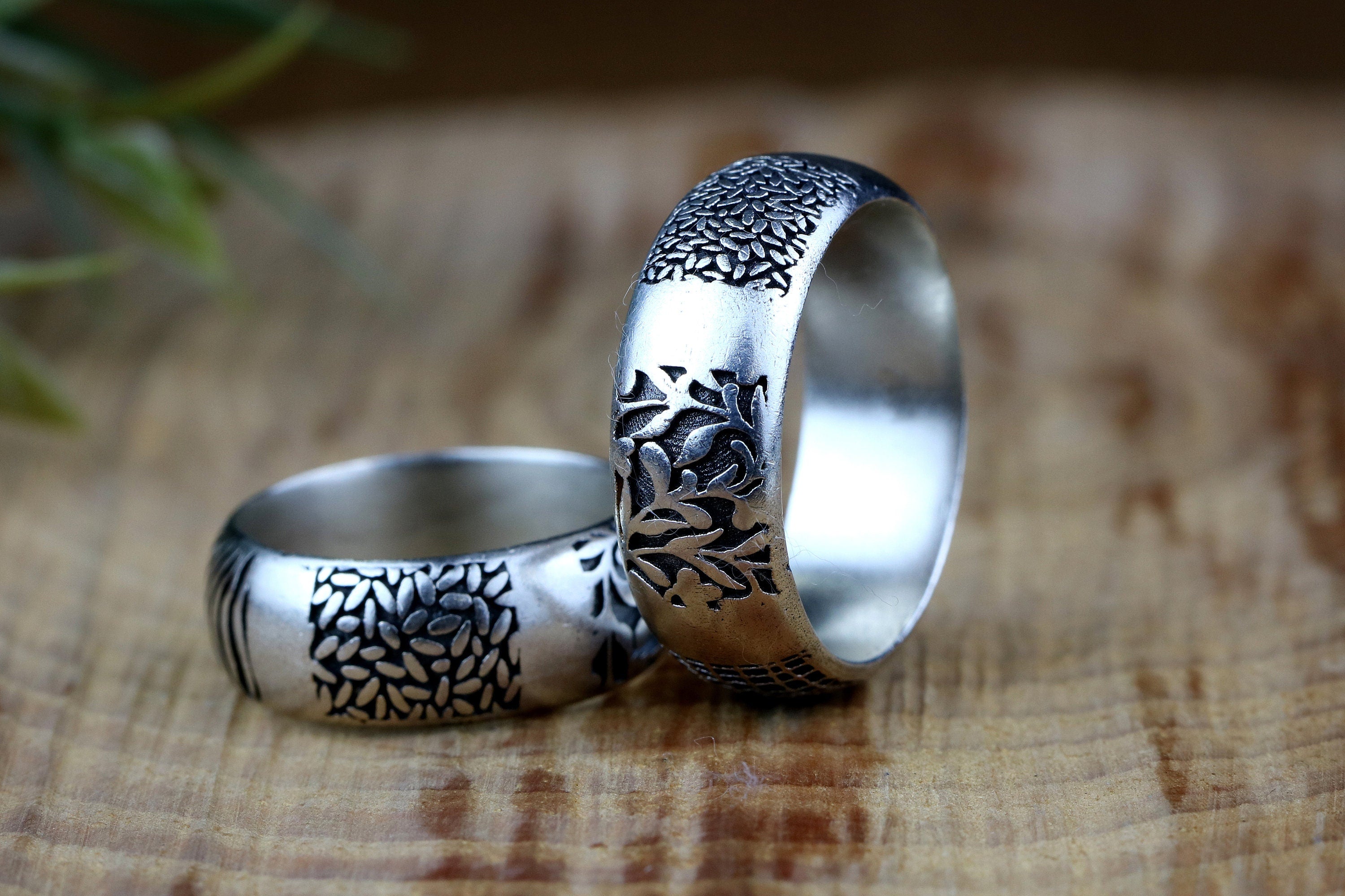Rustic Silver Wedding Band Ring: Engraved Unisex Jewelry