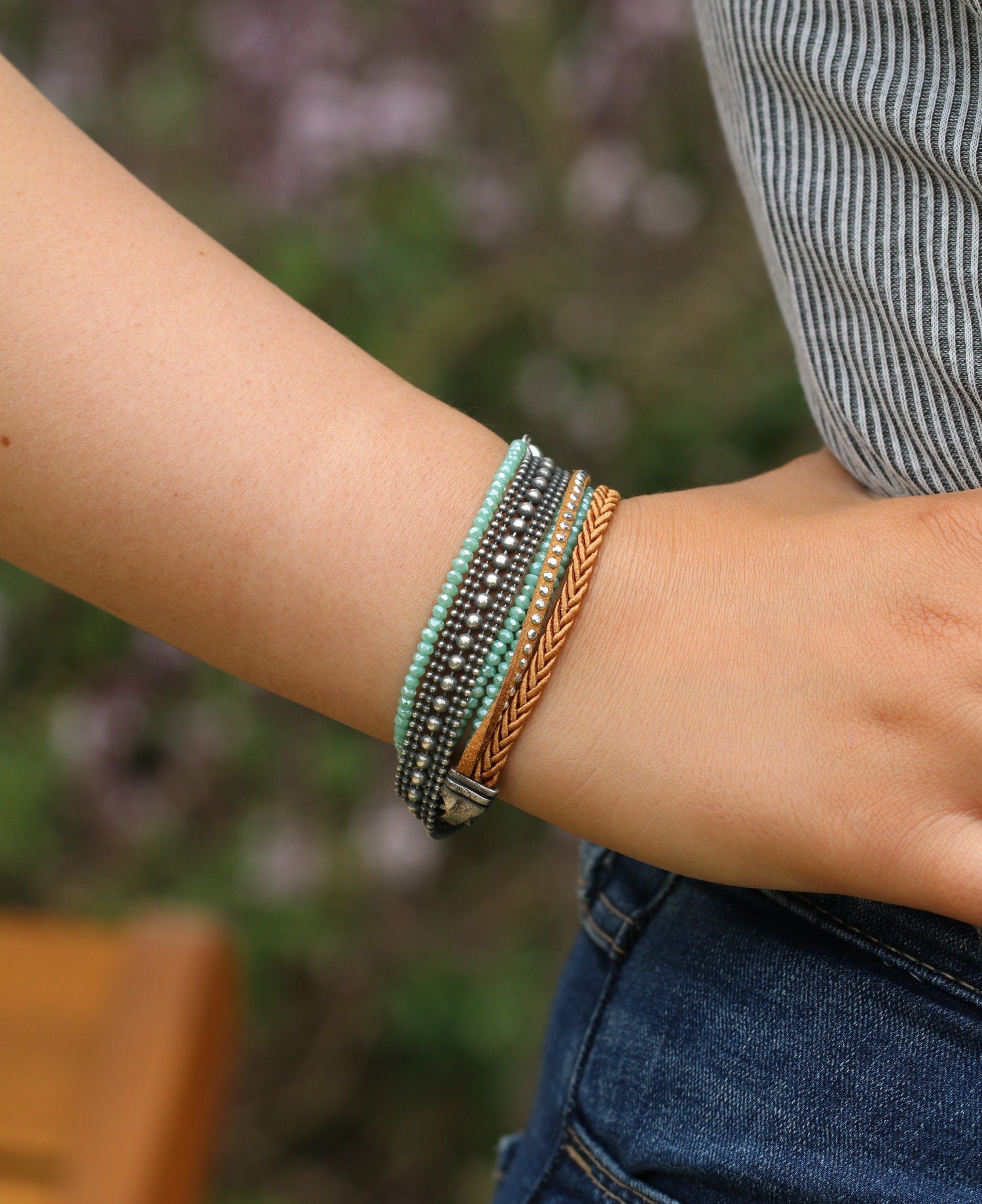 This wrap bracelet features a lovely mix of crystal, silver beads and braided leather bracelet. A versatile wrap bead bracelet that can be easily worn with other accessories, especially boho ones. Different shades and different elements will make for a super cool gift for any woman who likes fashionable boho-chic jewelry.