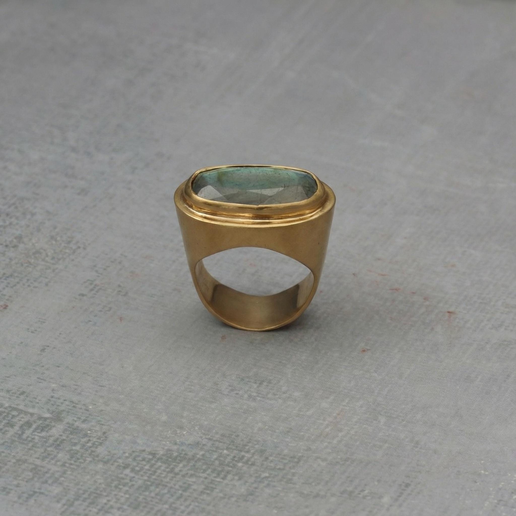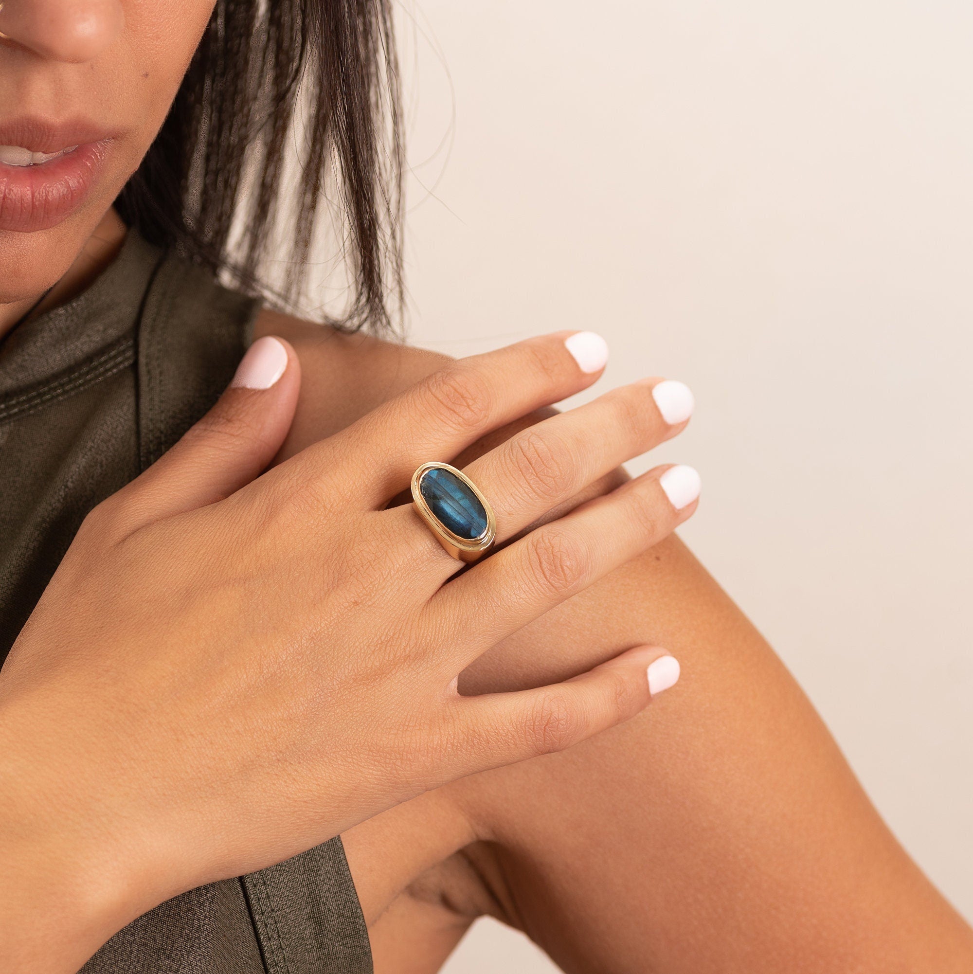 If you want to make a statement, this is the ring for it. An oval gold ring made stunning the iridescent charm of a natural Labradorite stone. The gemstone is bezel-set and the gold is made with a high-polish finish. Wear this piece as a statement jewelry ring or style it with other stackable rings for women. This a great gift idea for birthdays, bridal showers, prom, Mother’s day, or Christmas.