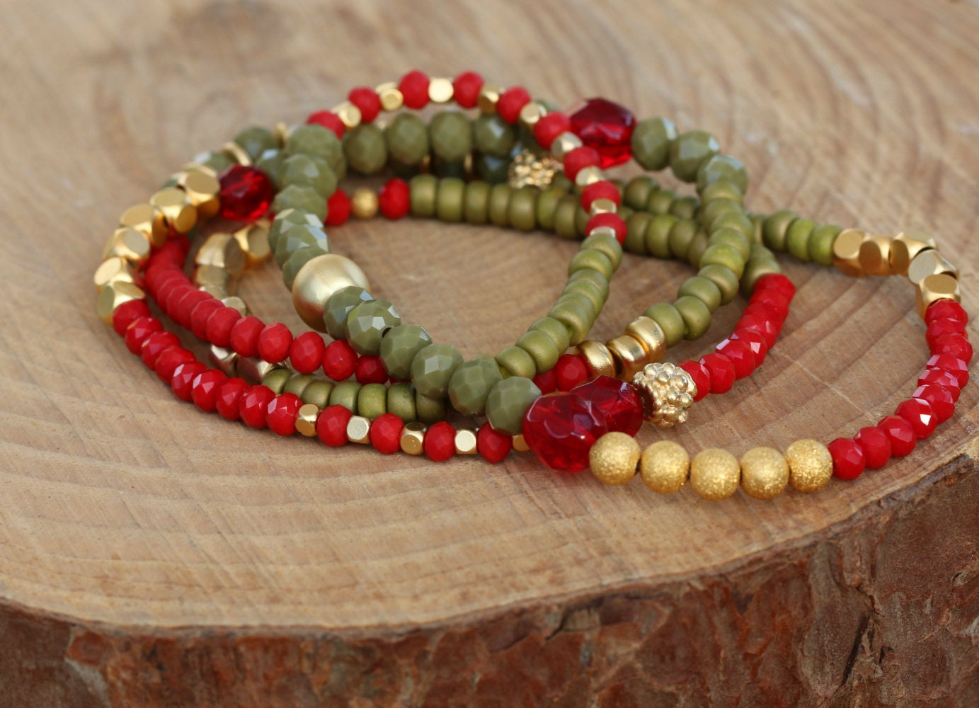Embellish your looks with the ever beautiful contrast of olive green, red and gold with this stunning wrap bracelet. This wrap beaded bracelet is fun and elegant all at the same time giving you that boost to your outfit, may it be for the day or for the evening. Wear with other handmade jewelry for women to create your signature ensemble.