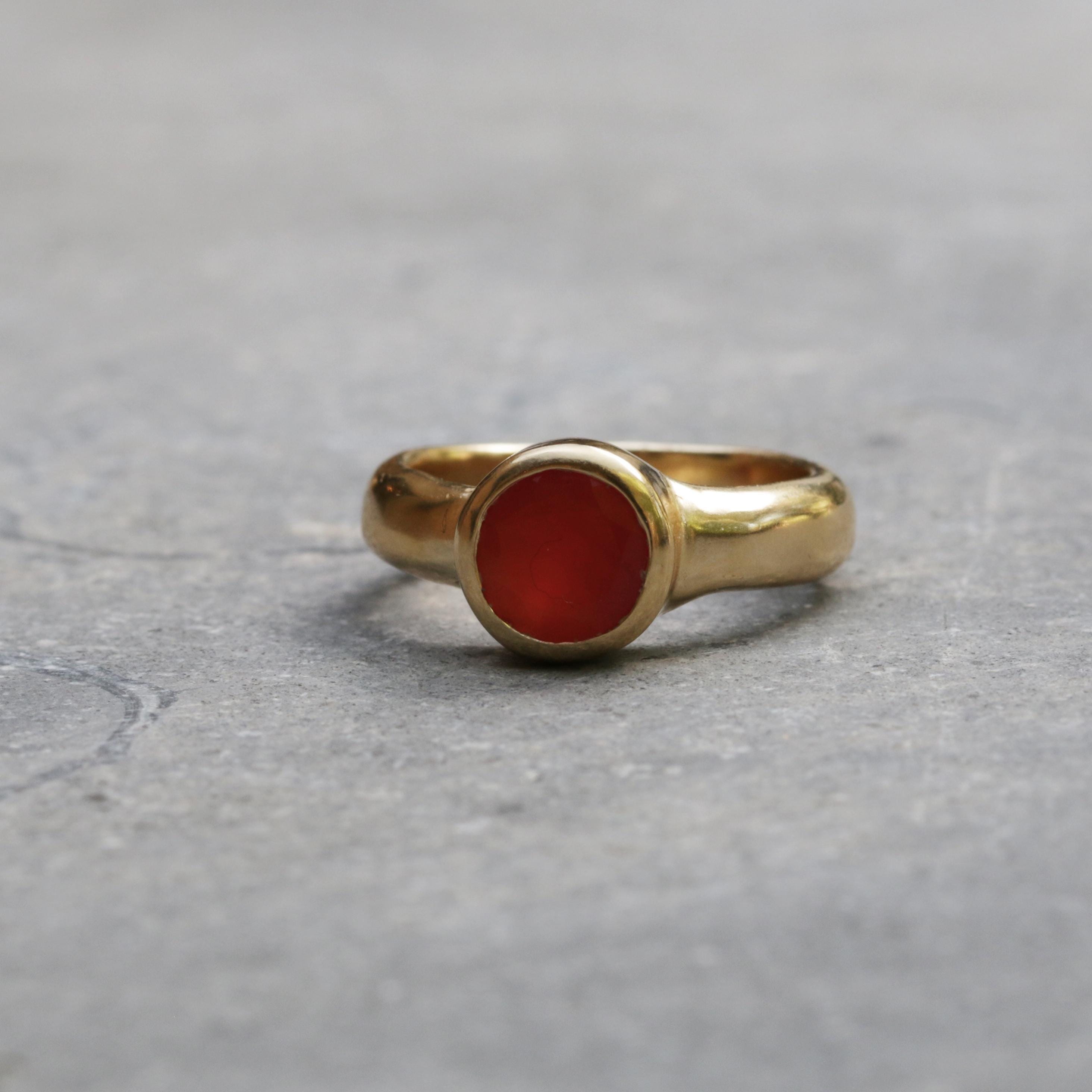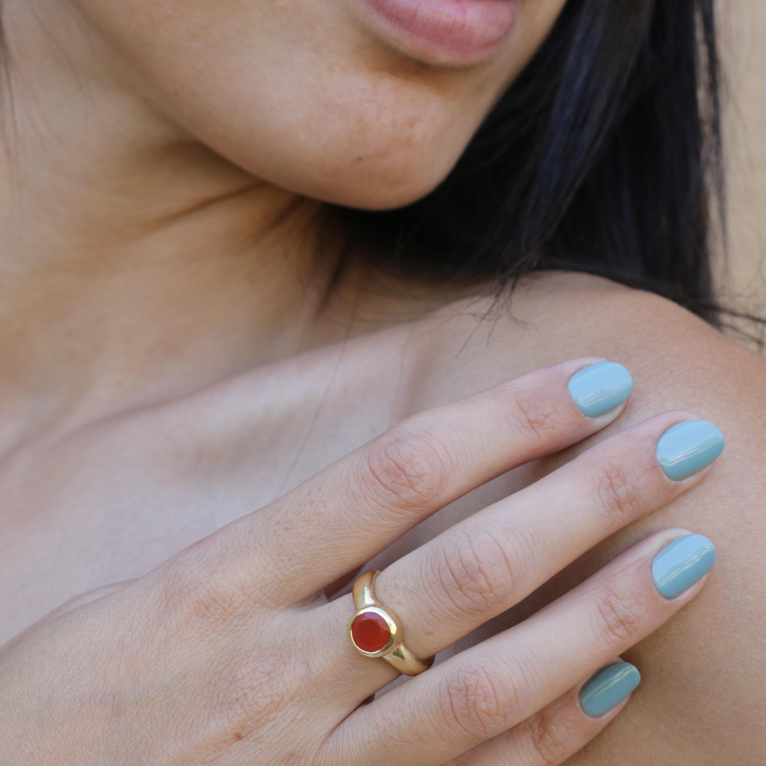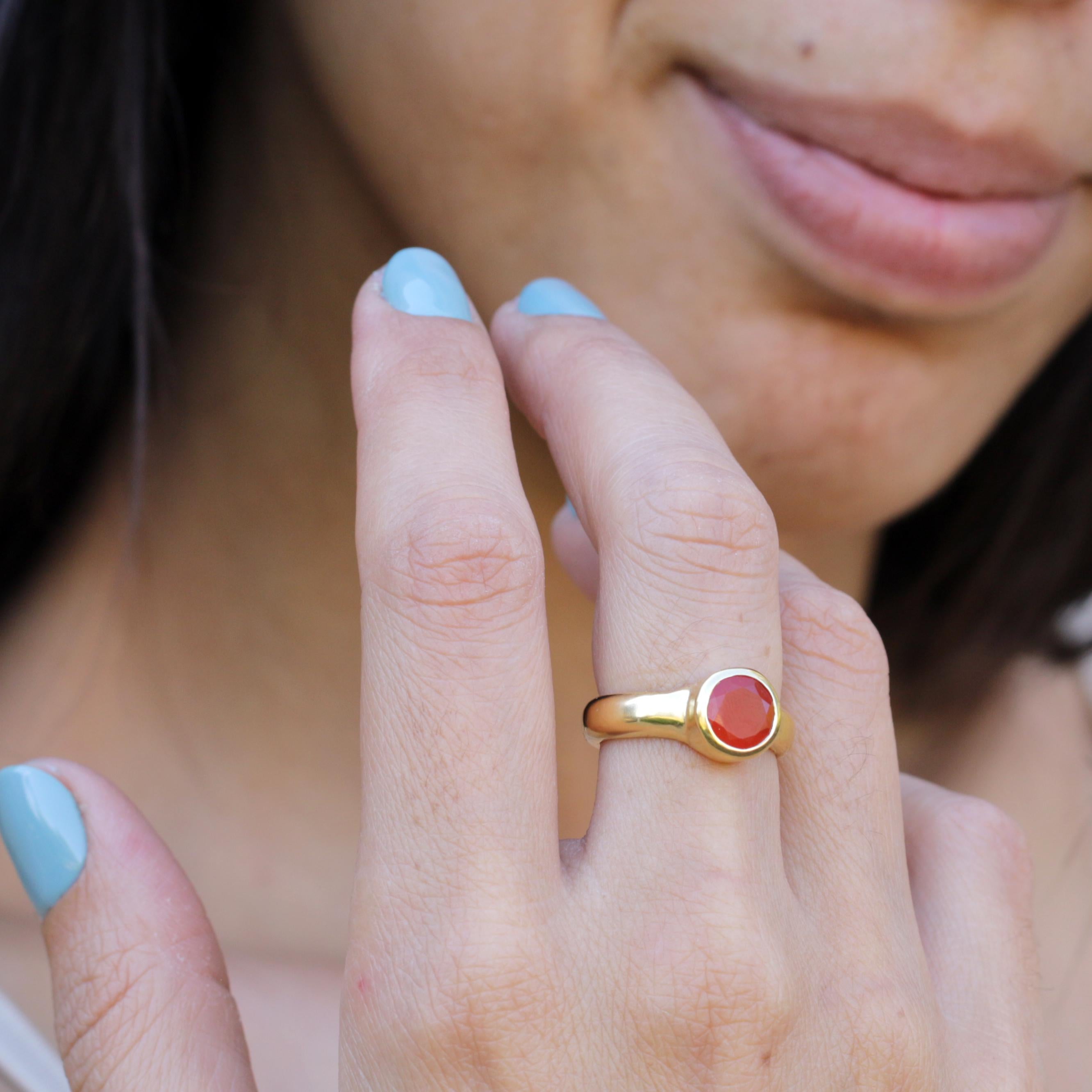 This handcrafted gold ring features a glowing faceted round carnelian gemstone set in a sleek bezel setting โ a timeless balance of warmth and simplicity. Each piece is shaped and polished by hand, celebrating fine craftsmanship and the beauty of natural gemstones.