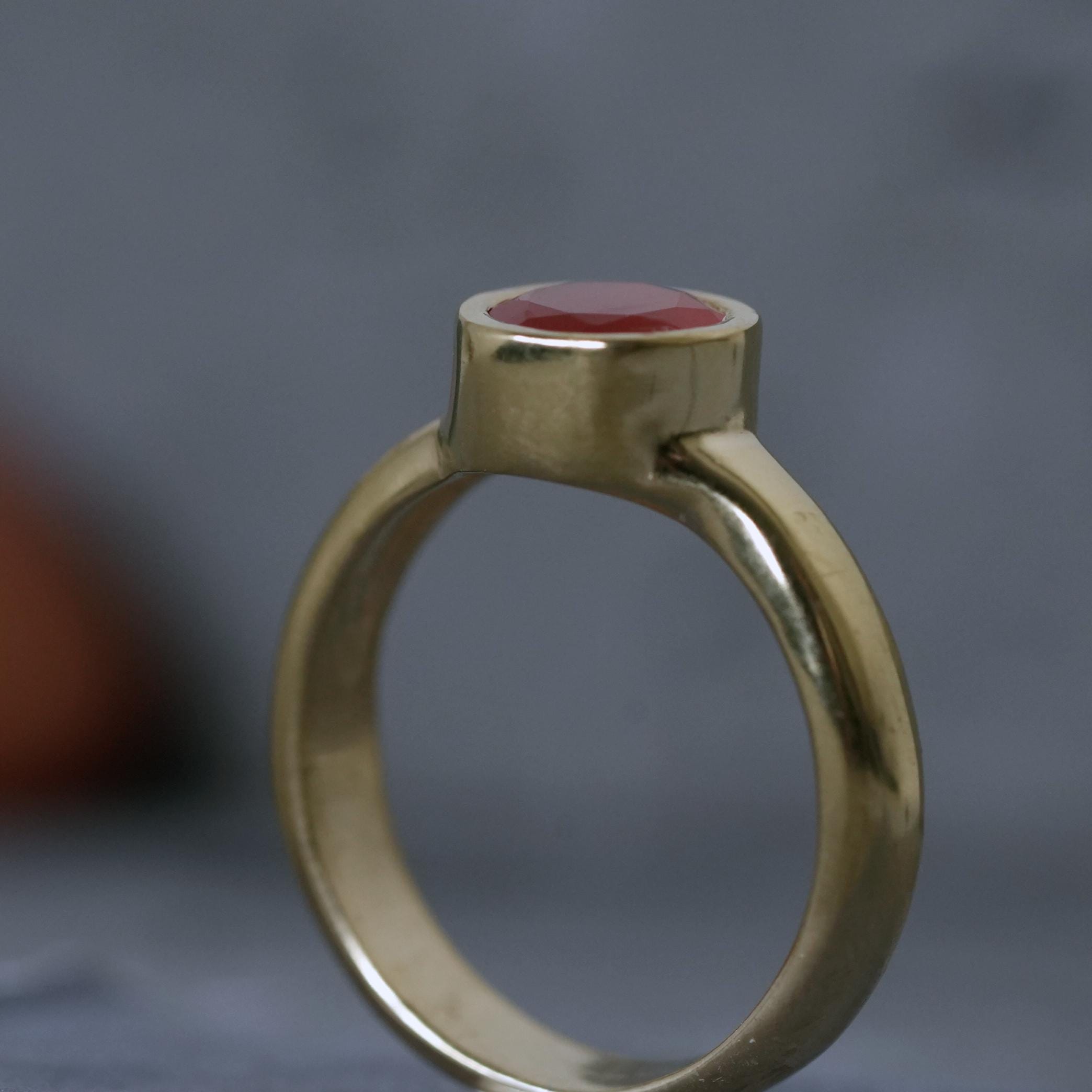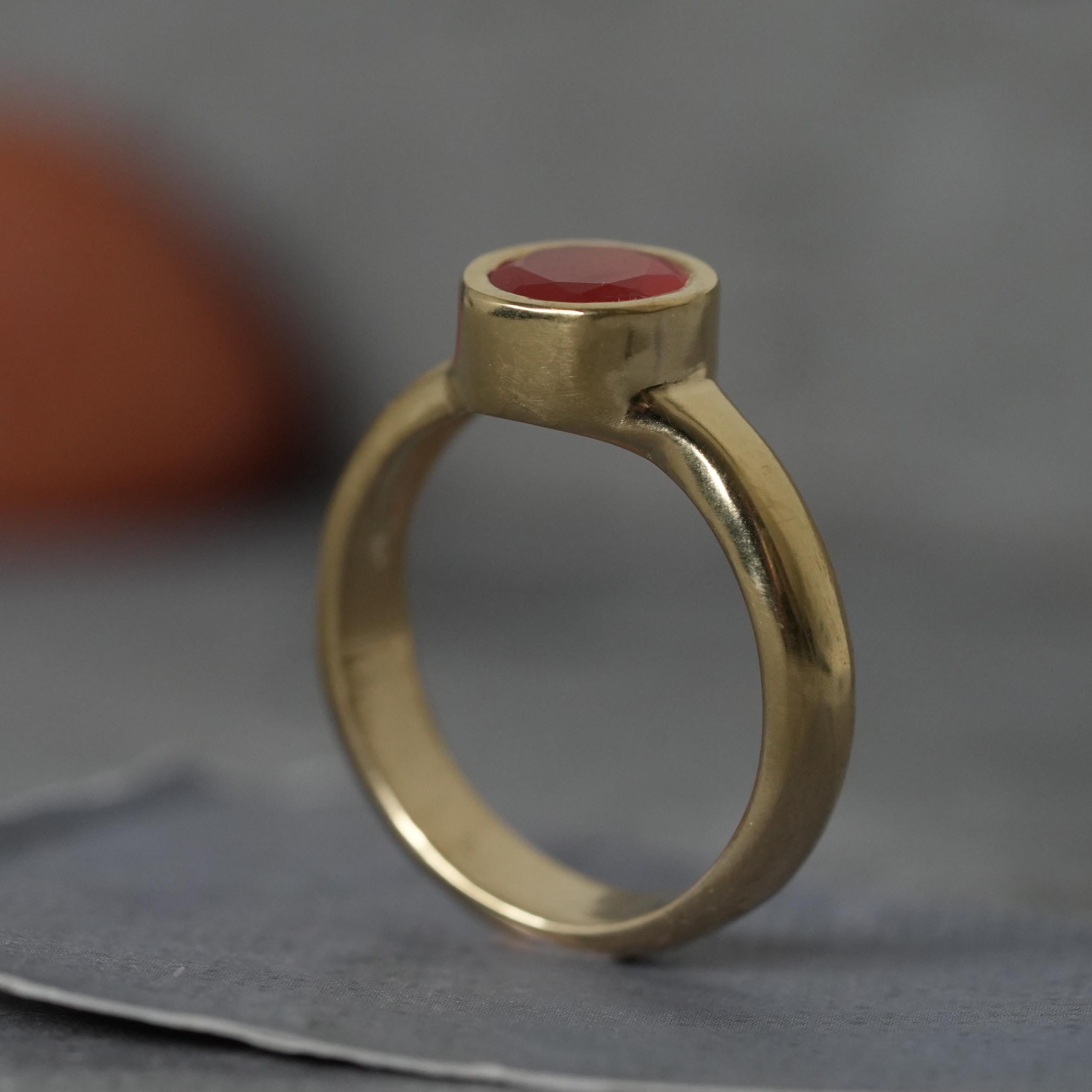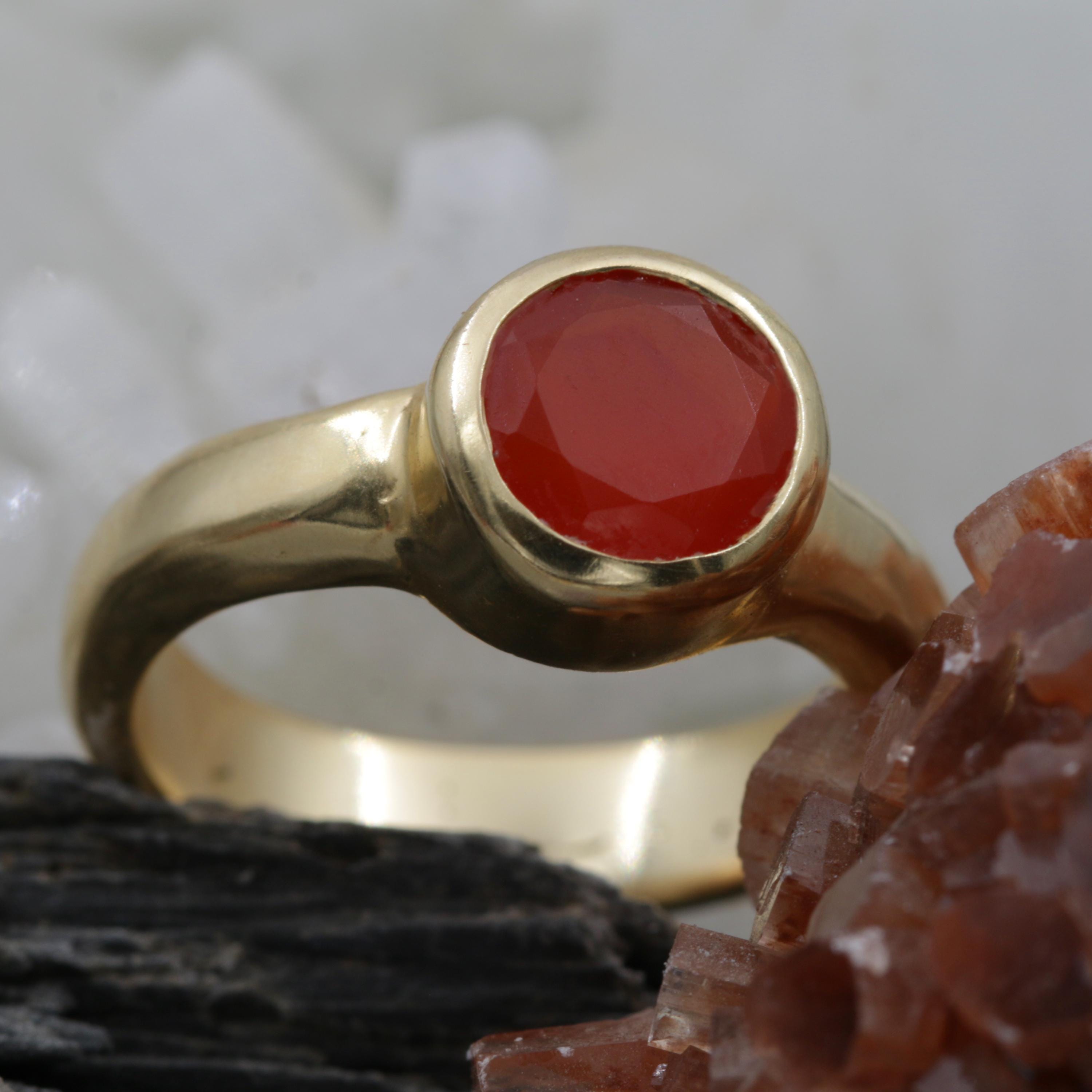 This handcrafted gold ring features a glowing faceted round carnelian gemstone set in a sleek bezel setting โ a timeless balance of warmth and simplicity. Each piece is shaped and polished by hand, celebrating fine craftsmanship and the beauty of natural gemstones.
