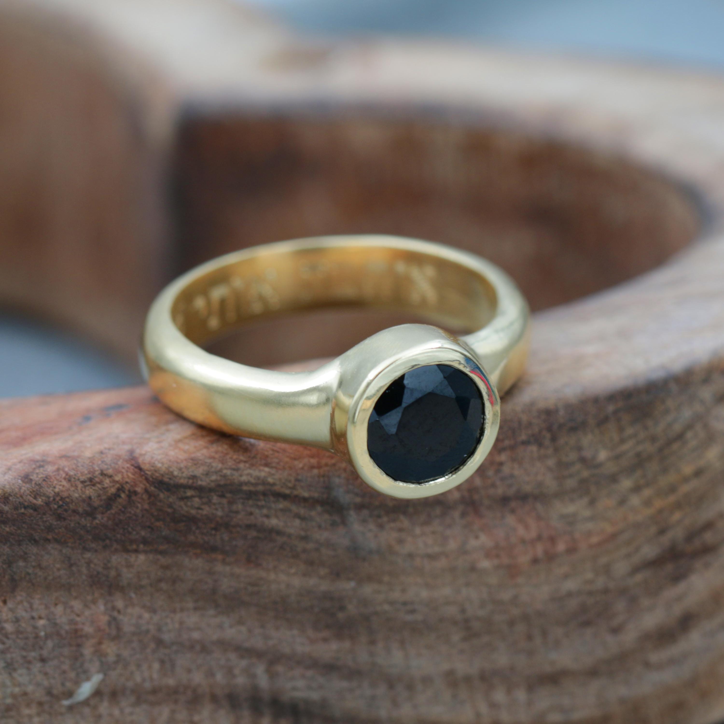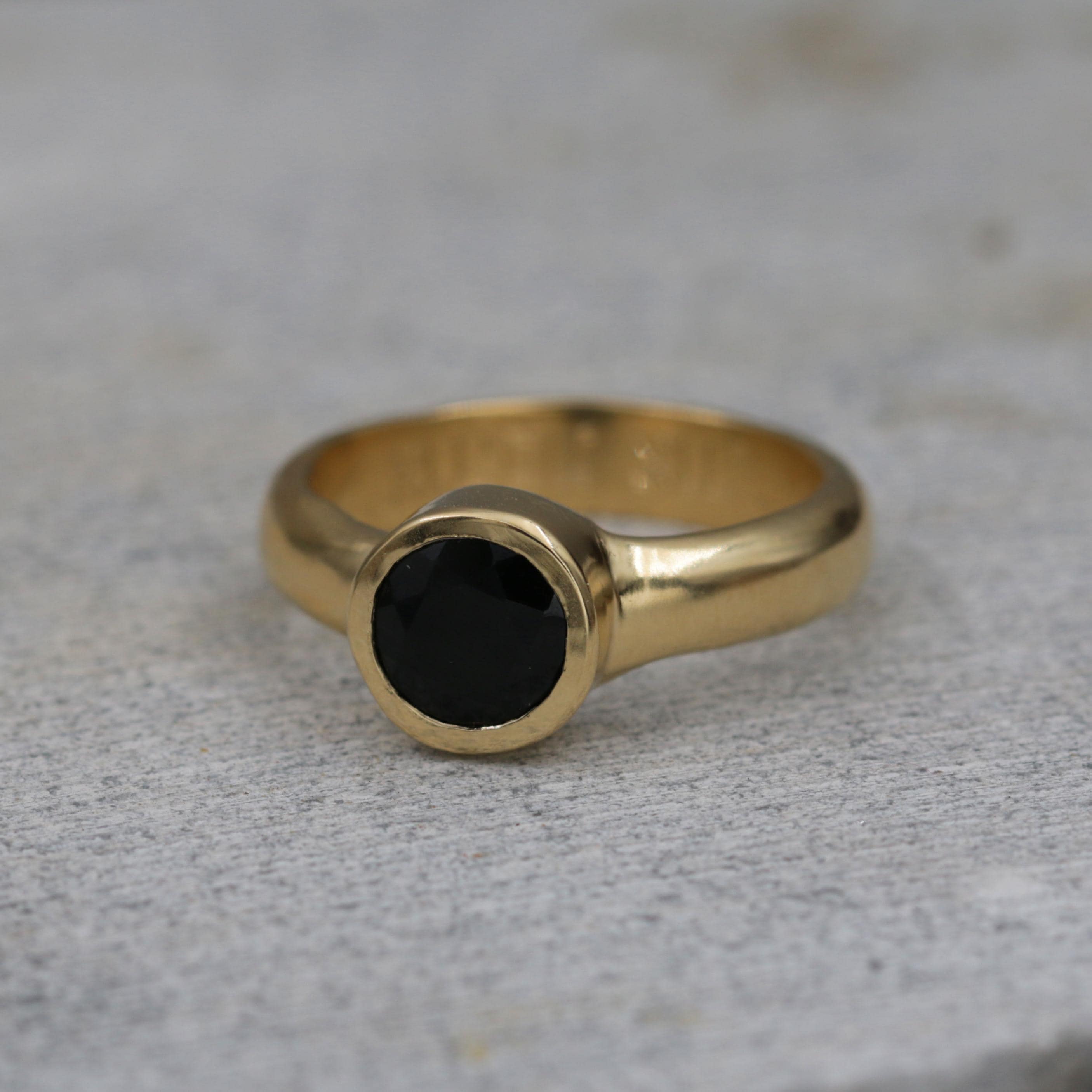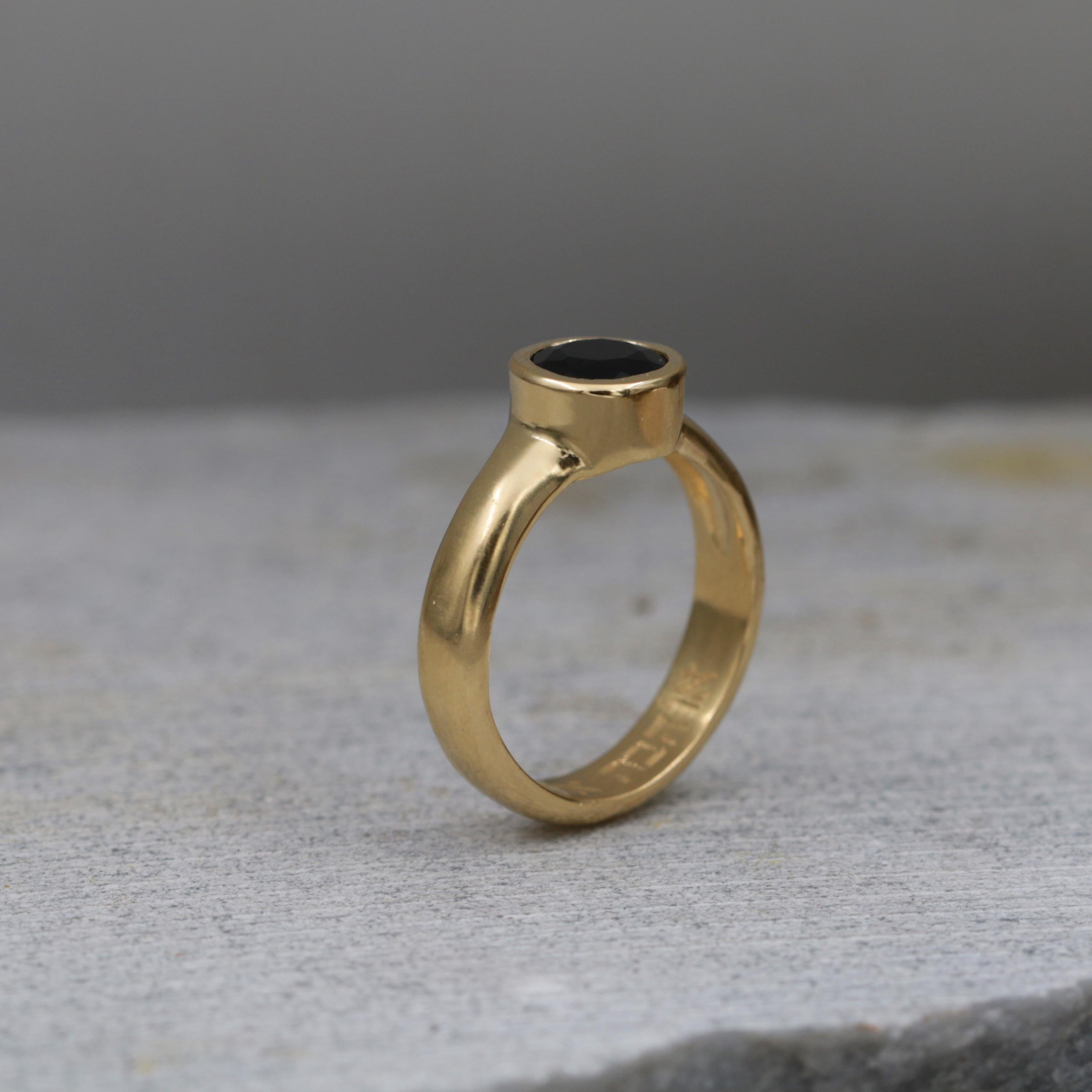 This handcrafted gold ring showcases a luminous faceted black onyx gemstone — a timeless contrast between deep, mysterious black and the warm glow of gold. Each ring is meticulously shaped, filed, and polished by hand, reflecting refined artisan craftsmanship and a sense of quiet luxury.
