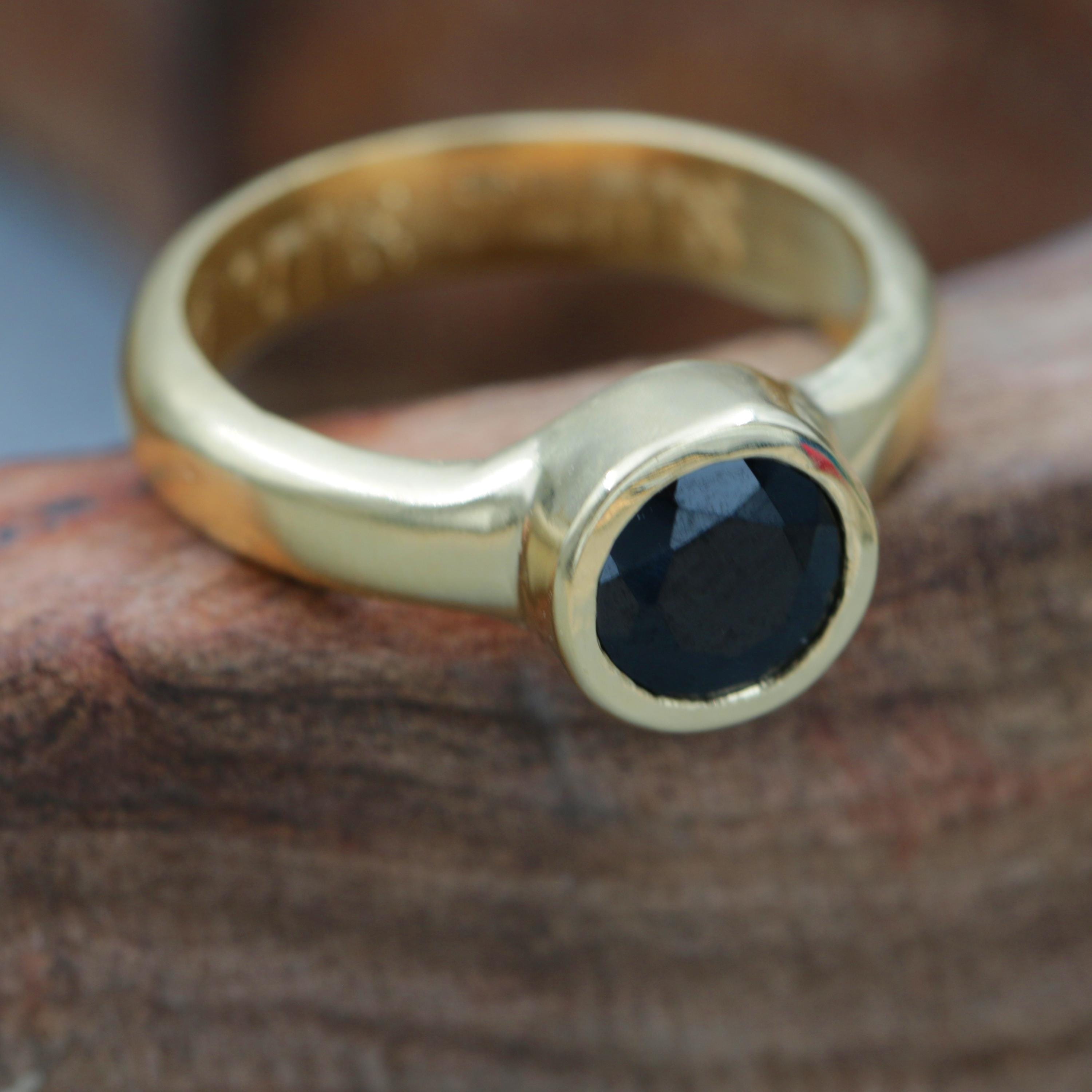 Handcrafted Black Onyx Solitaire Gold Ring - Round Bezel Set Design