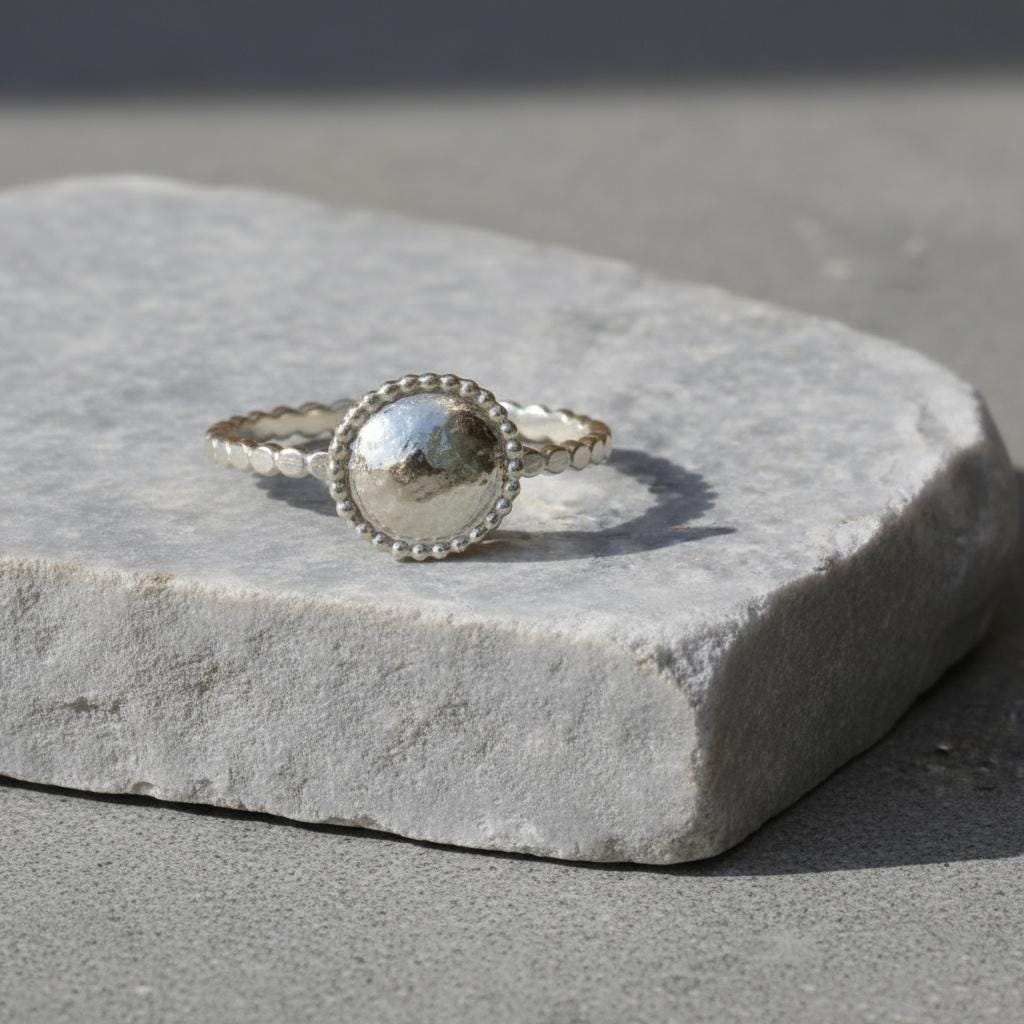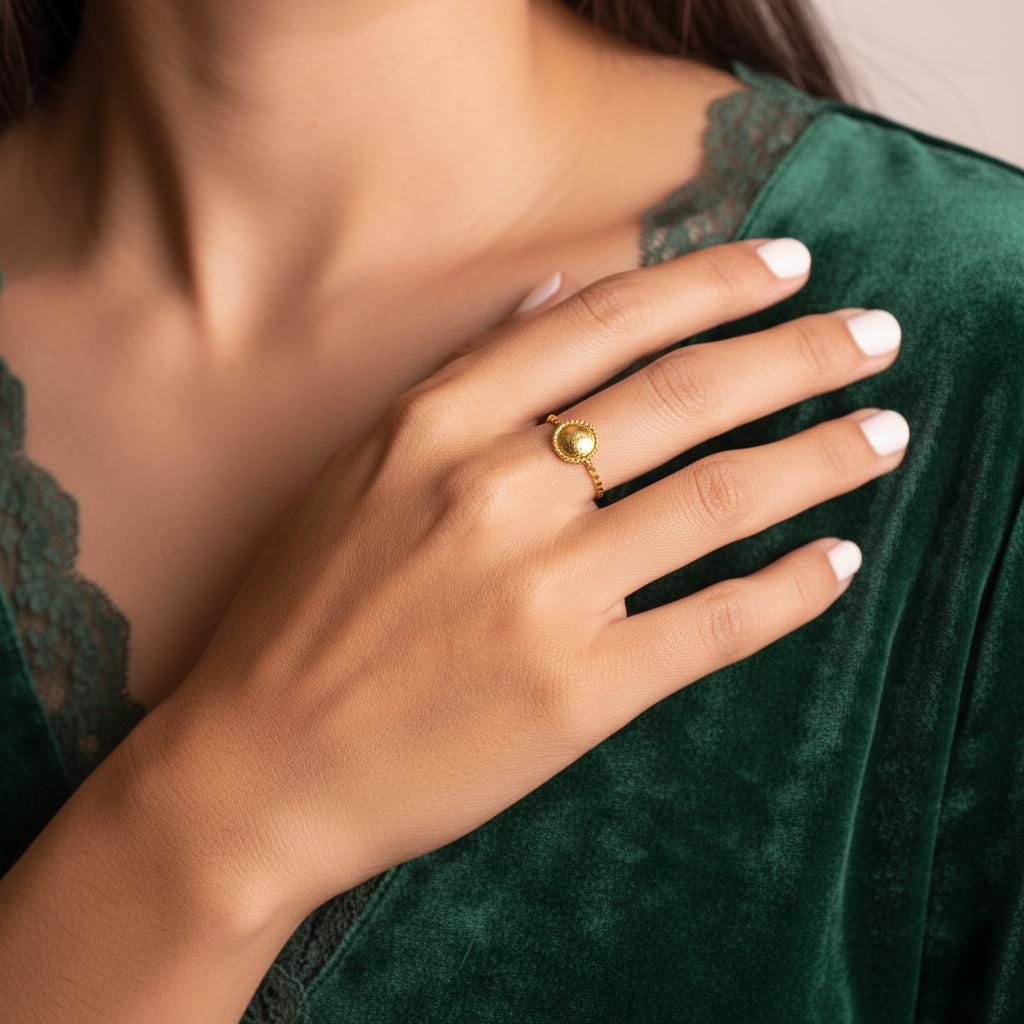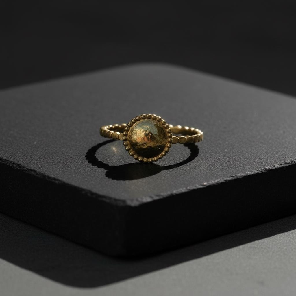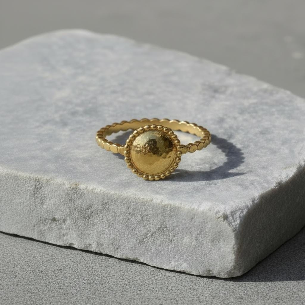This handcrafted gold ring features a delicate dome made from tiny flat dots, arranged in a smooth, rounded circle that creates a unique granulated effect. Each dot is individually placed and shaped by hand, giving the piece its soft organic texture and subtle sparkle.