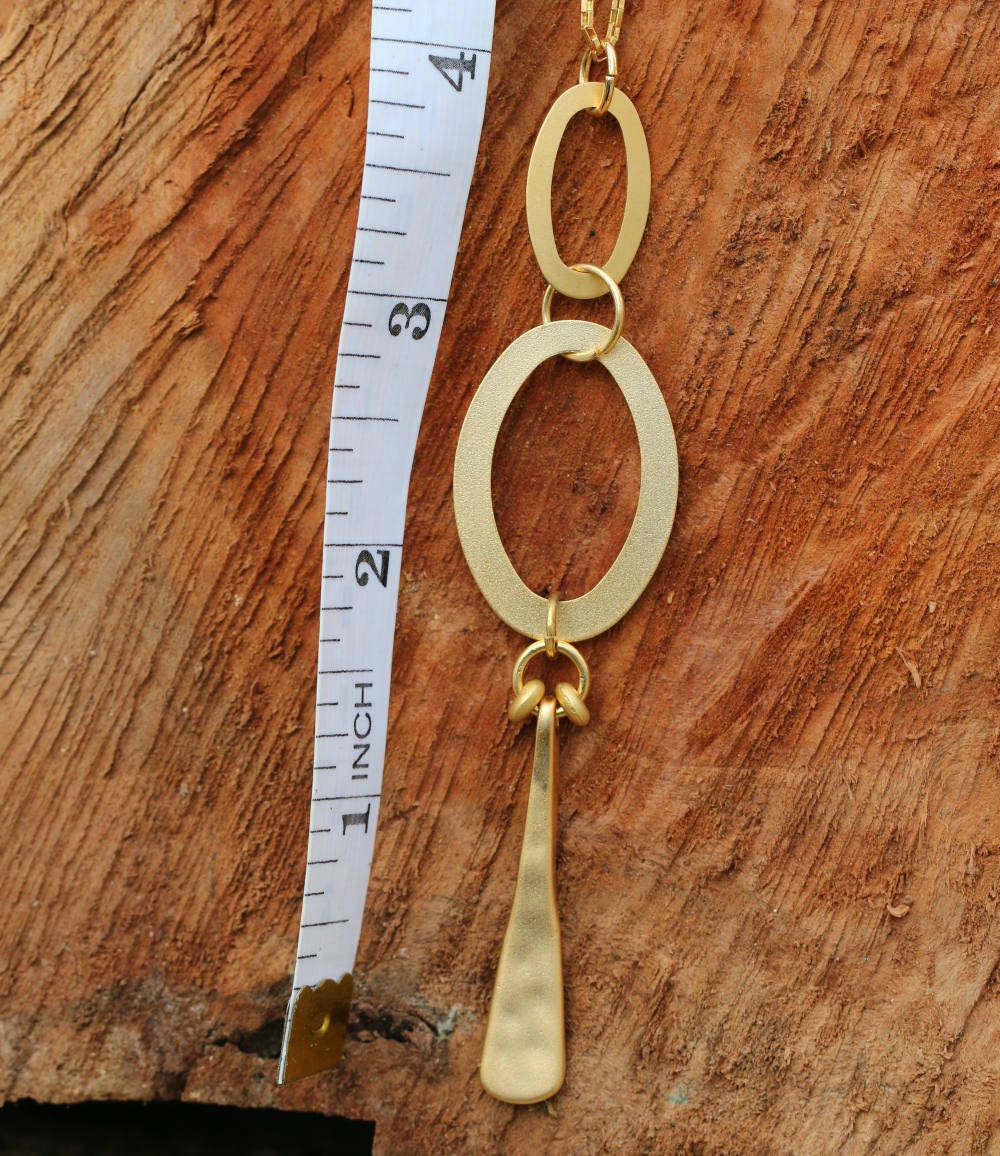 Add some extra dose of elegance to your looks with this pendant necklace from our collection. This fashion necklace is crafted with a gold-plated long chain, double ellipse rings, and a stick bead. A gold statement necklace to compliment your gorgeous silhouettes.