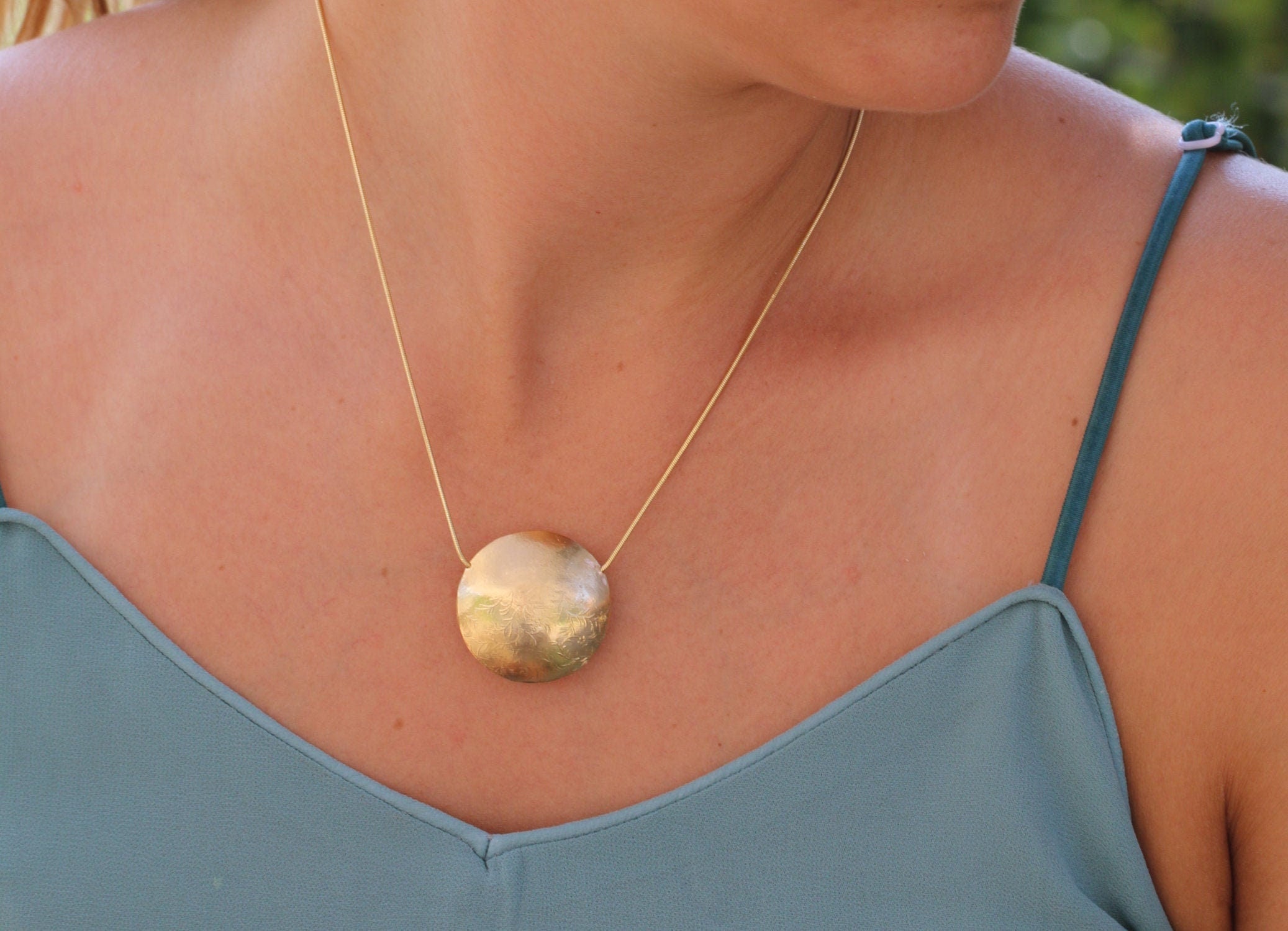 Make every outfit a stunning one with this statement necklace with our original and signature design. This necklace for women handmade with gold plated finish and a pendant with intriguing engraving. A necklace for women that can be worn as a boho, formal or everyday jewelry piece.