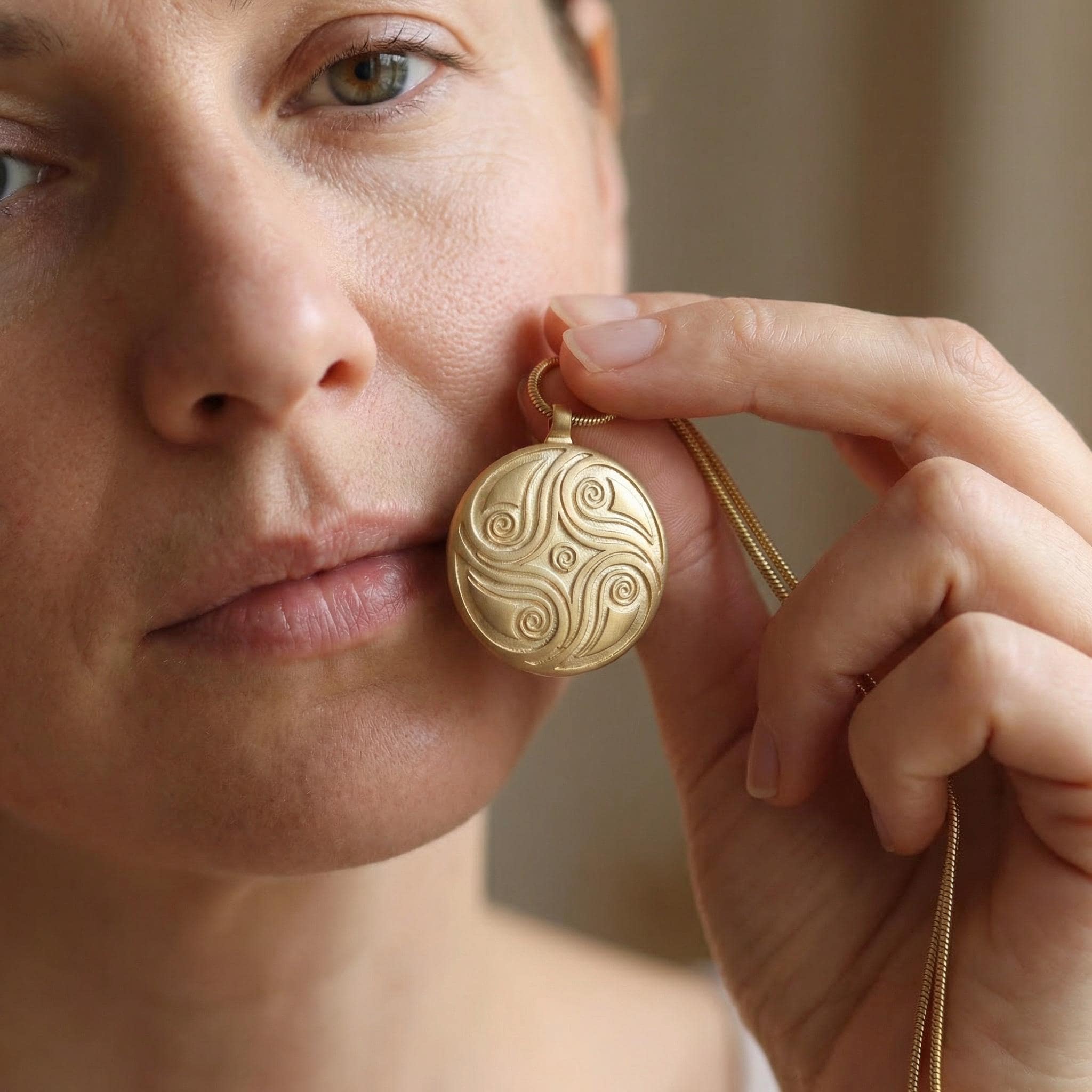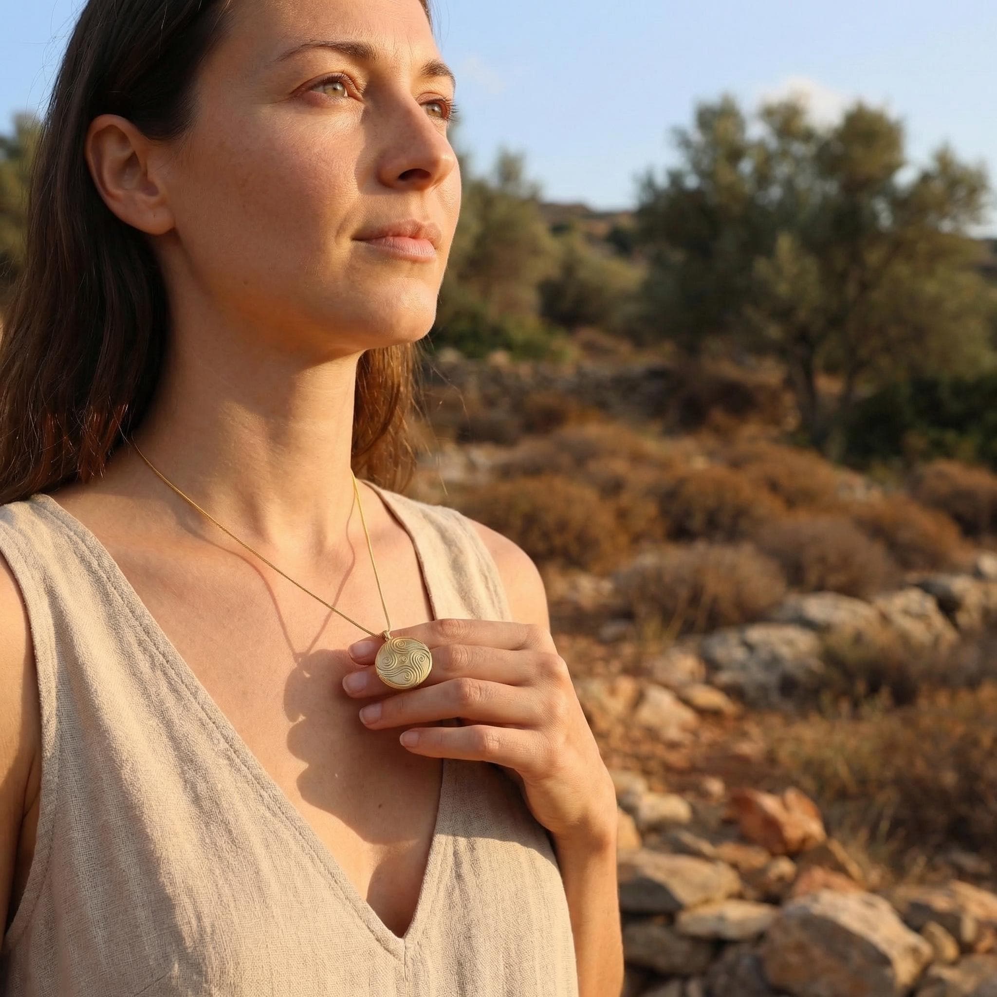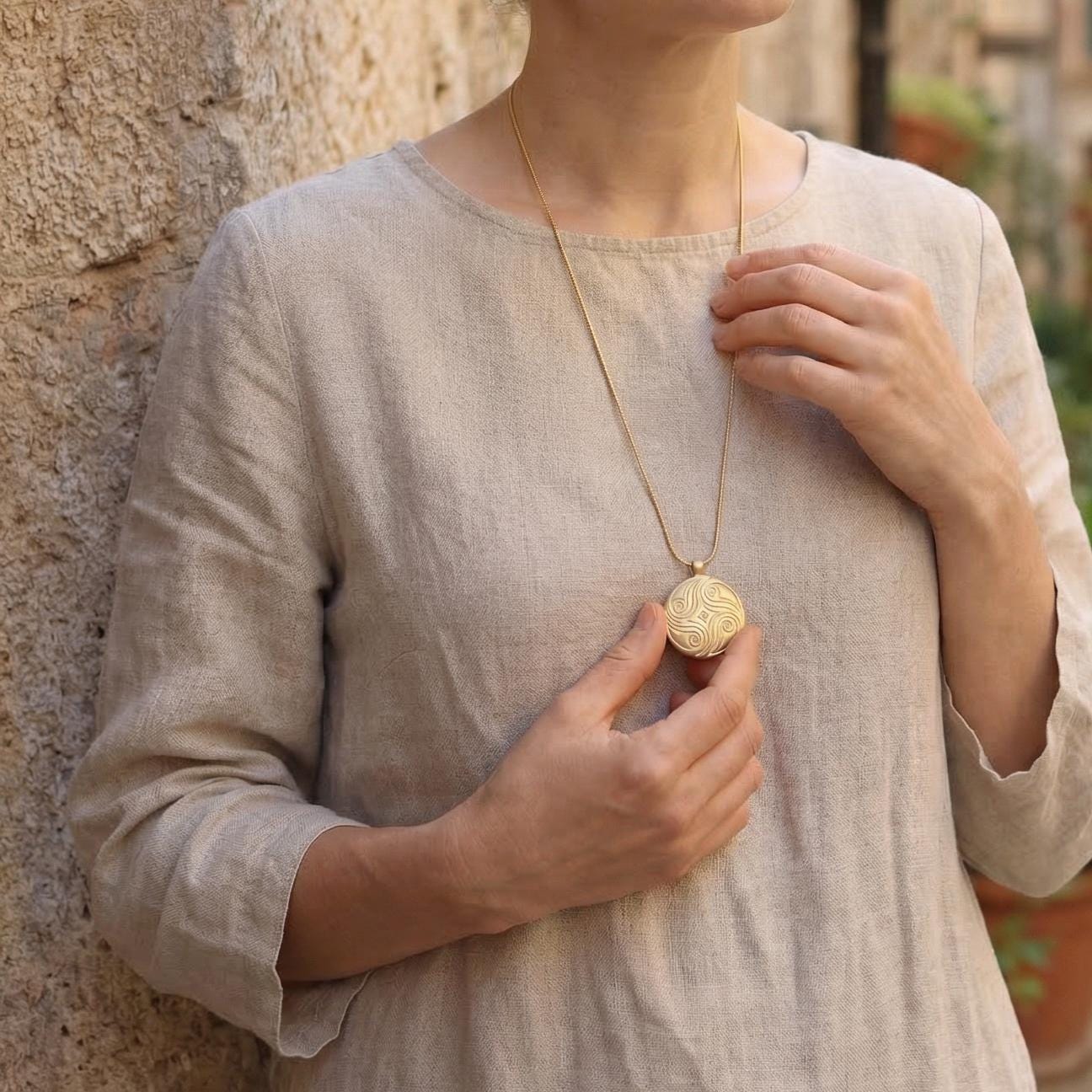 The spirals on the front symbolize the natural flow of life, growth, and the quiet movement of nature. But the deeper meaning of this necklace is hidden on the back.