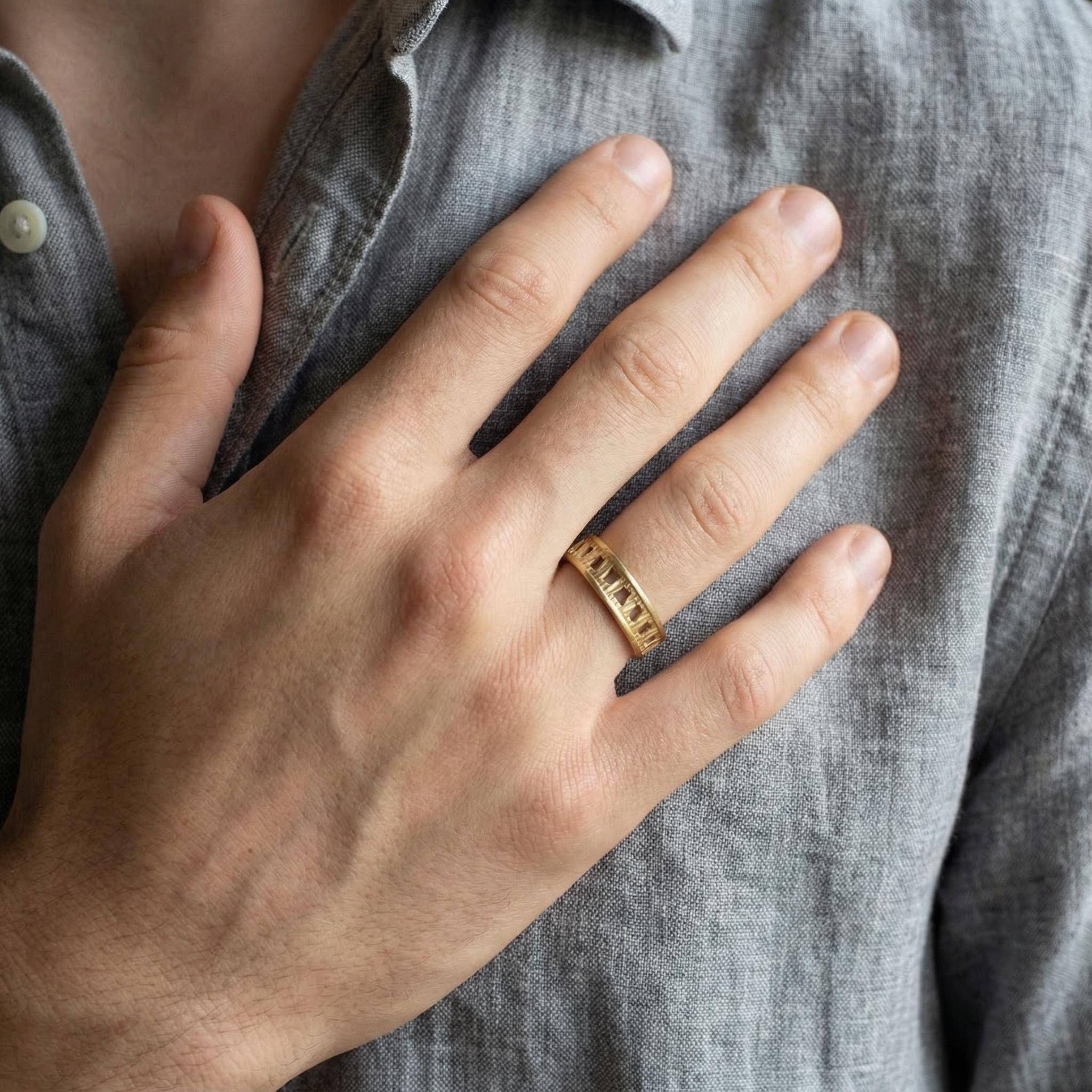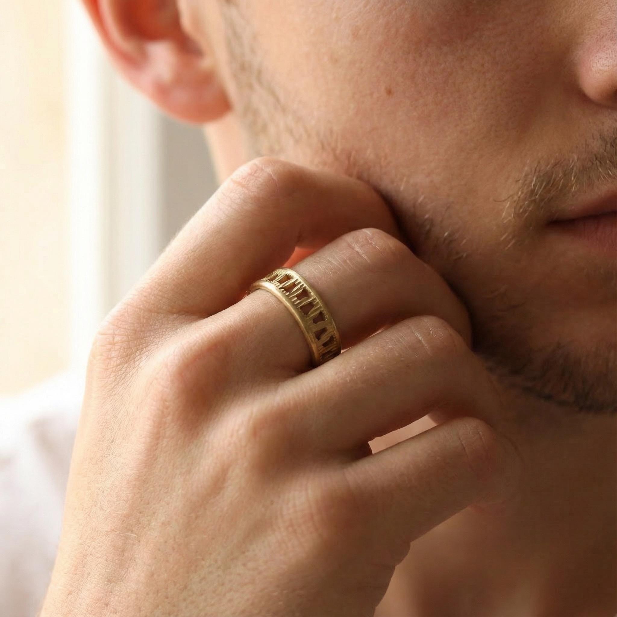 Introducing a handcrafted men’s gold geometric ring, designed with a clean openwork cut-out pattern that combines modern style with timeless craftsmanship.