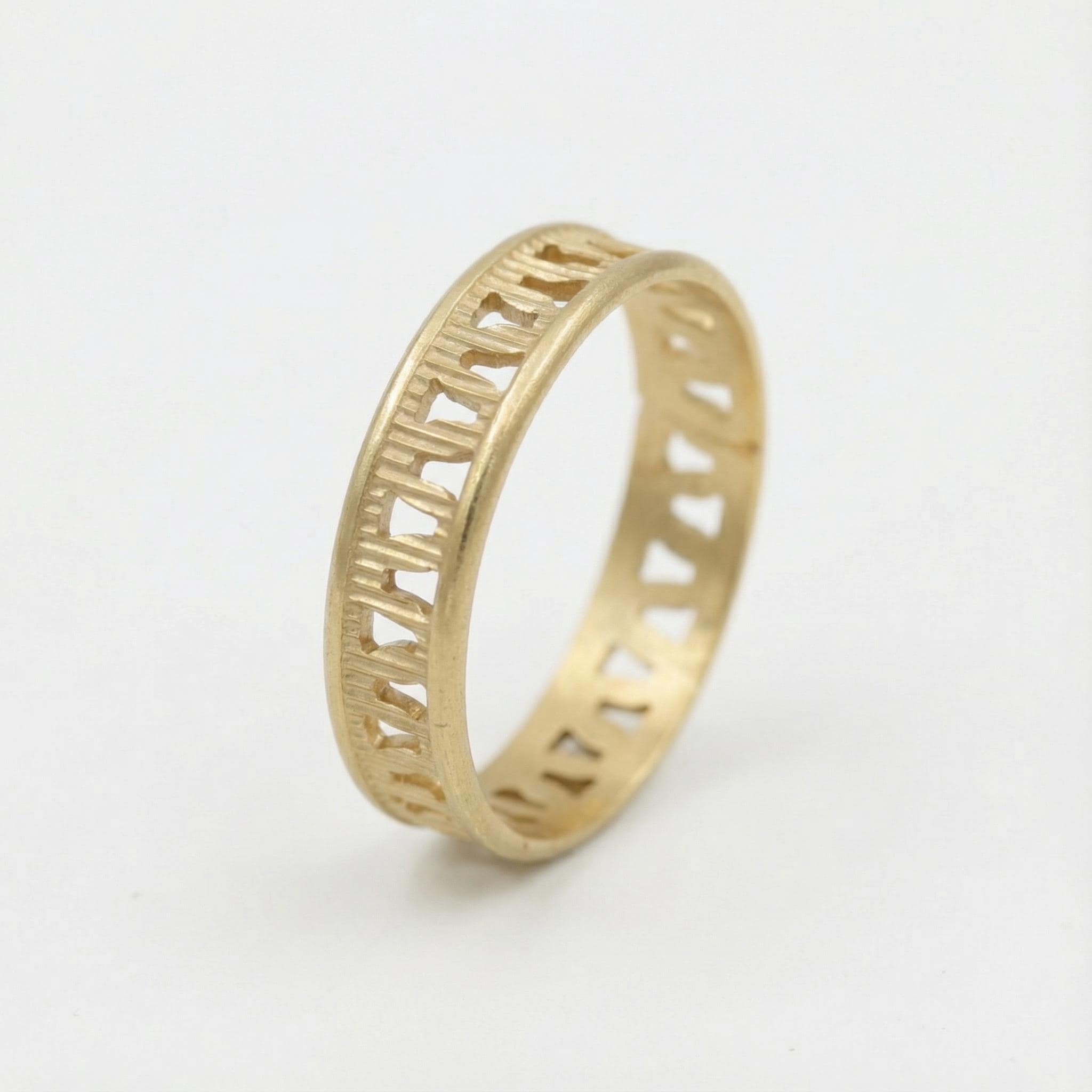 Materials: Solid gold 14k or 18k, Gold solder, Hand shaped, gold band, Geometric cut out pattern, Openwork metal structure, Brushed matte finish, Smooth comfort fit interior, Jewelers polishing compounds, Hand filed edges, Textured artisan surface, Heat formed gold components, Custom sizing fabrication.