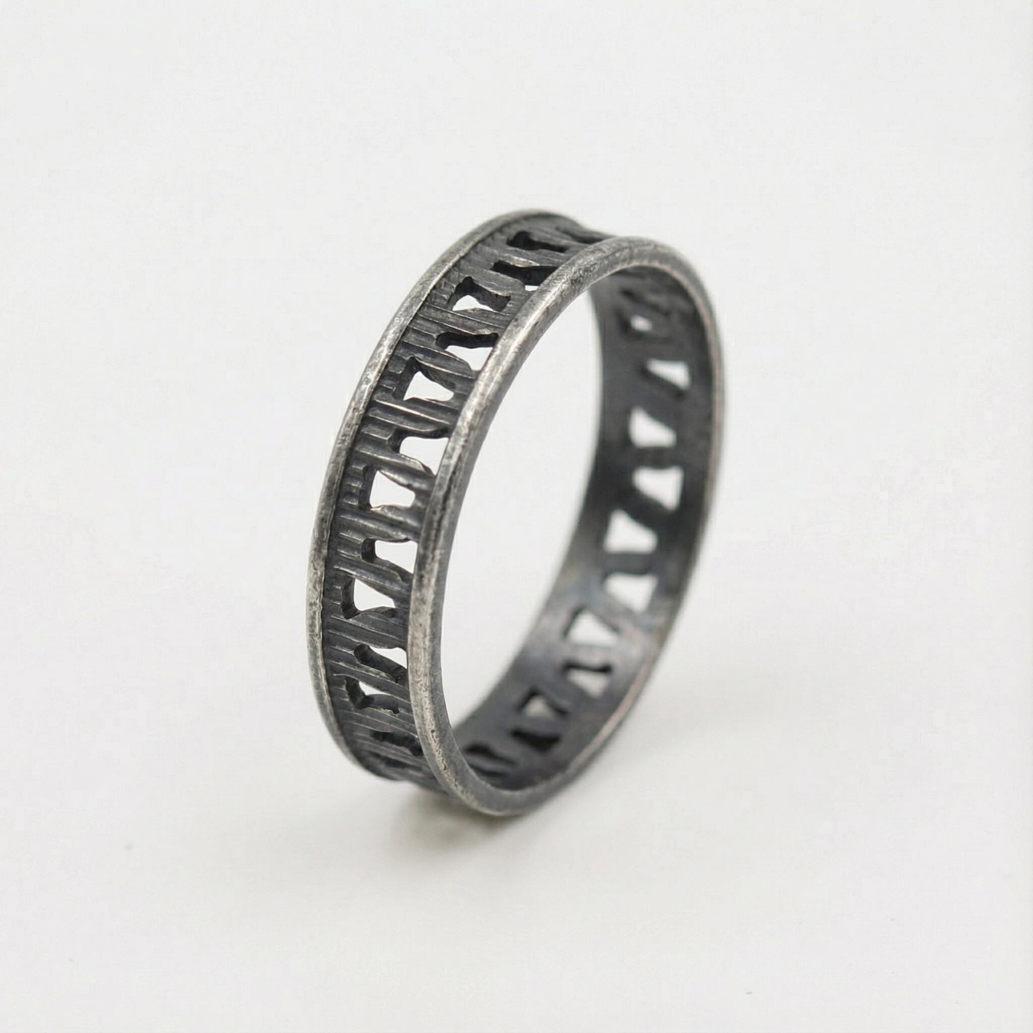 Materials: Sterling silver, Silver solder, Oxidizing solution, Hand shaped band, Geometric cut outs, Openwork structure, Hand filing, Saw cut detailing, Oxidized finish, Selective polishing, Comfort fit, interior Finishing compounds, Final quality check.