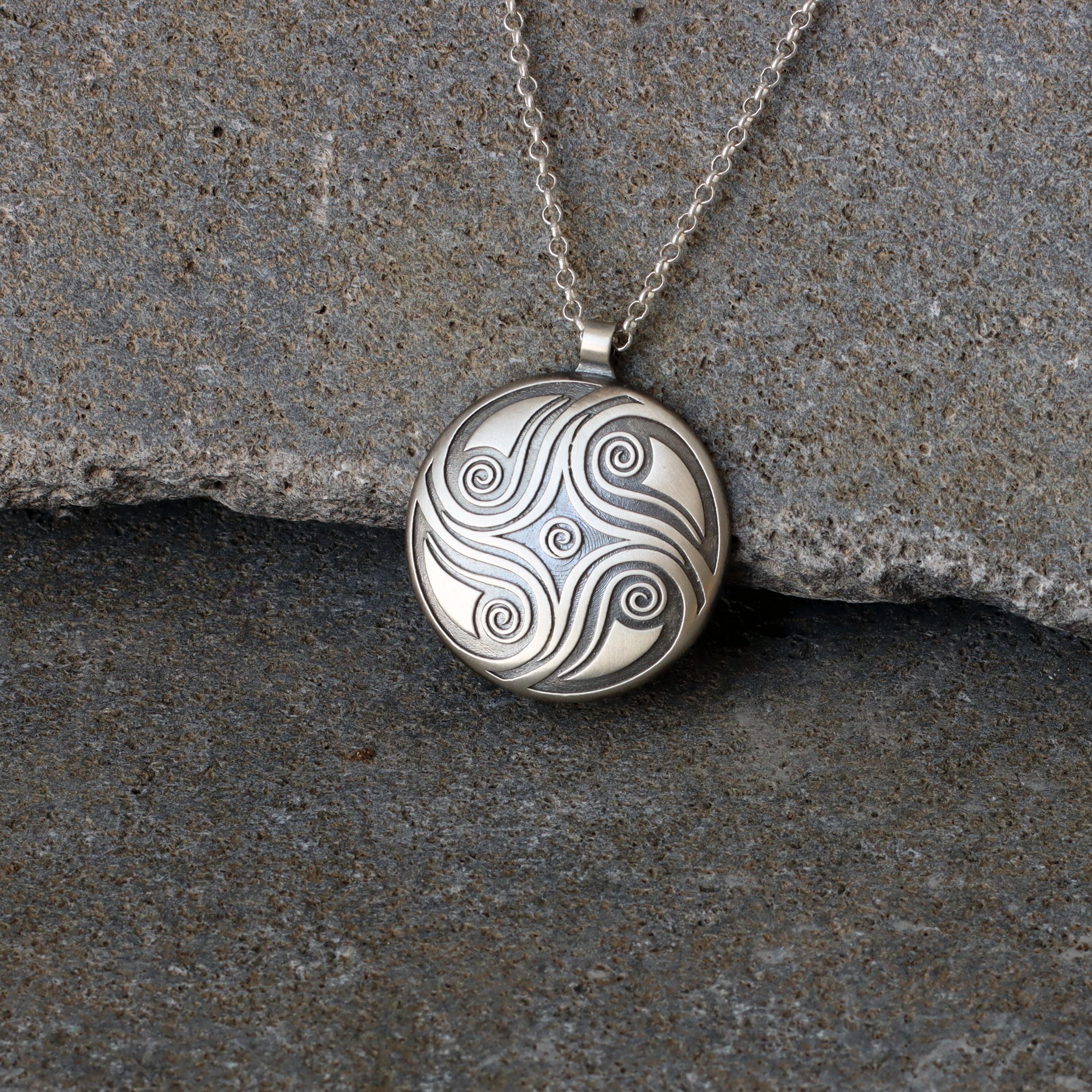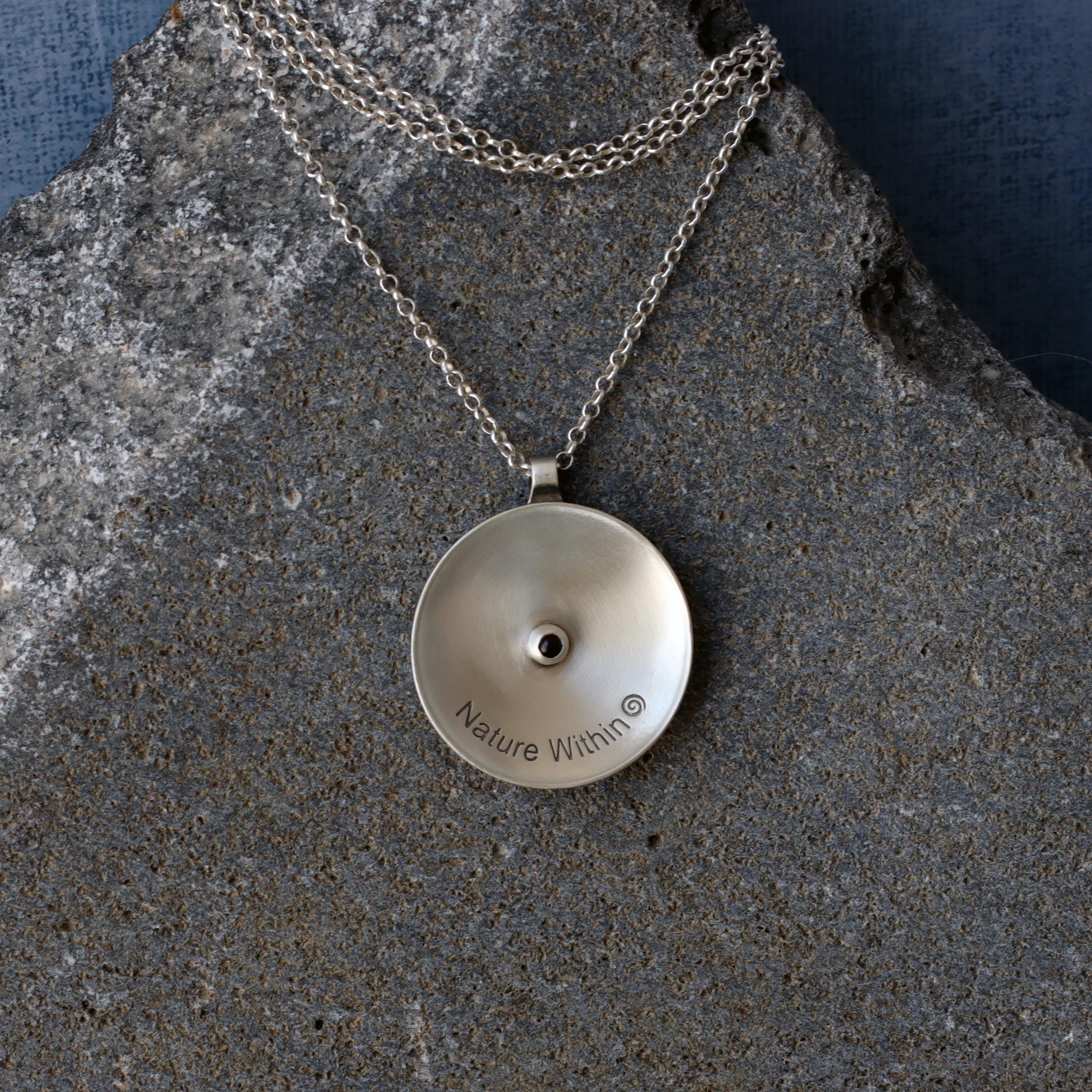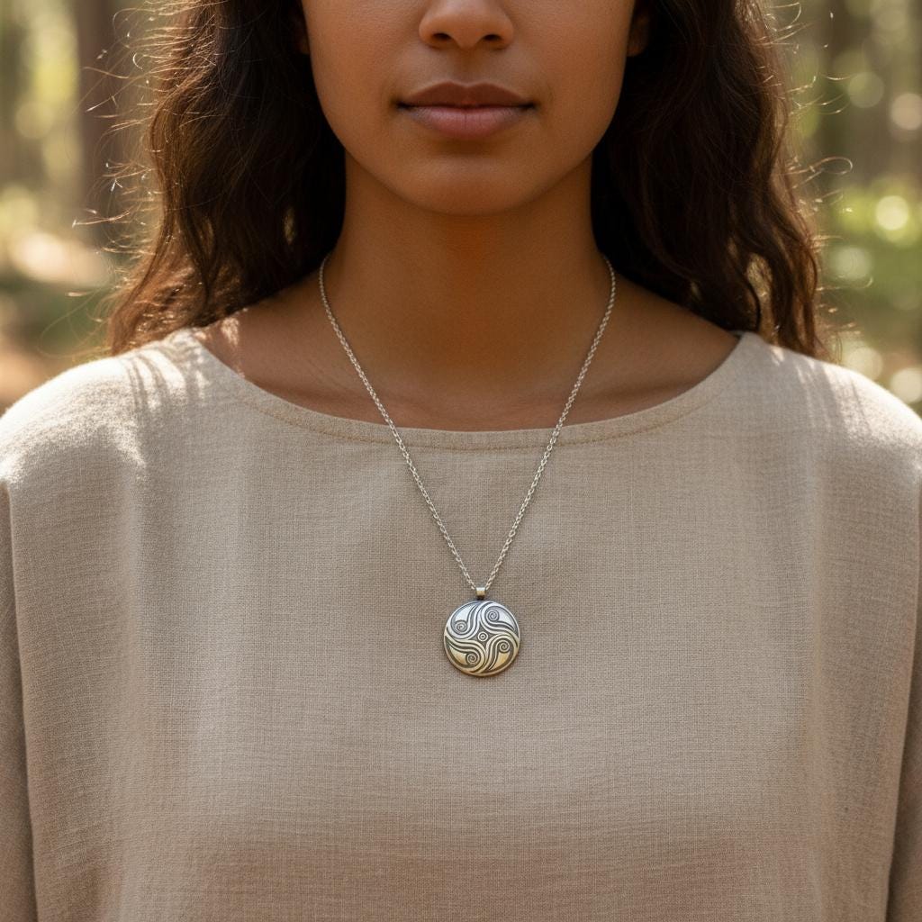 A one-of-a-kind round convex pendant adorned with hand-carved spiral textures that symbolize the eternal cycle of life, growth, and spiritual balance. Each pendant is carefully crafted from sterling silver and oxidized to achieve a rustic look, imbuing it with a soulful and tactile quality that feels both grounding and uplifting.