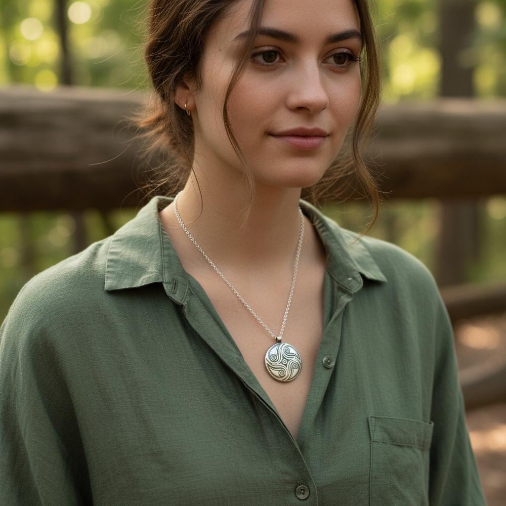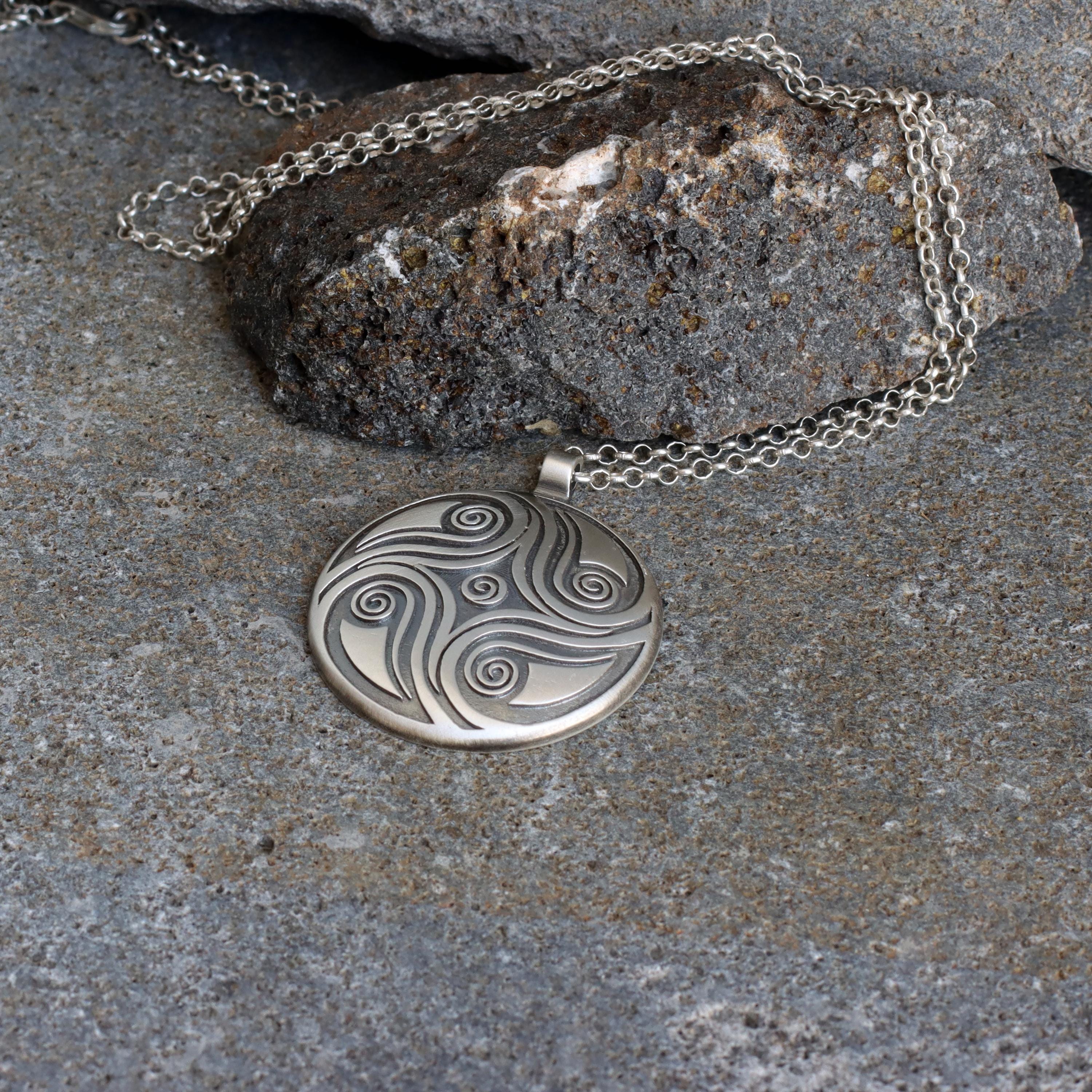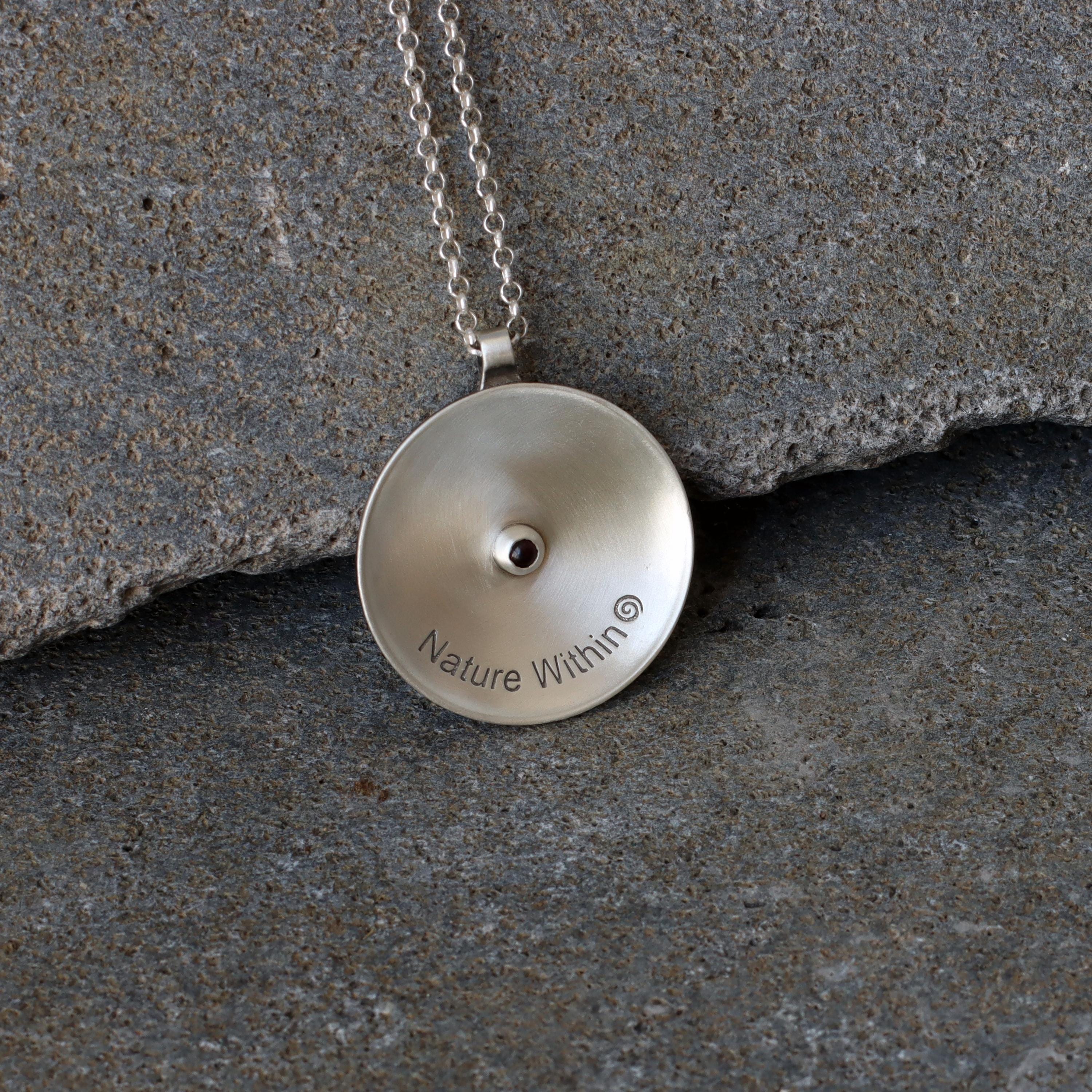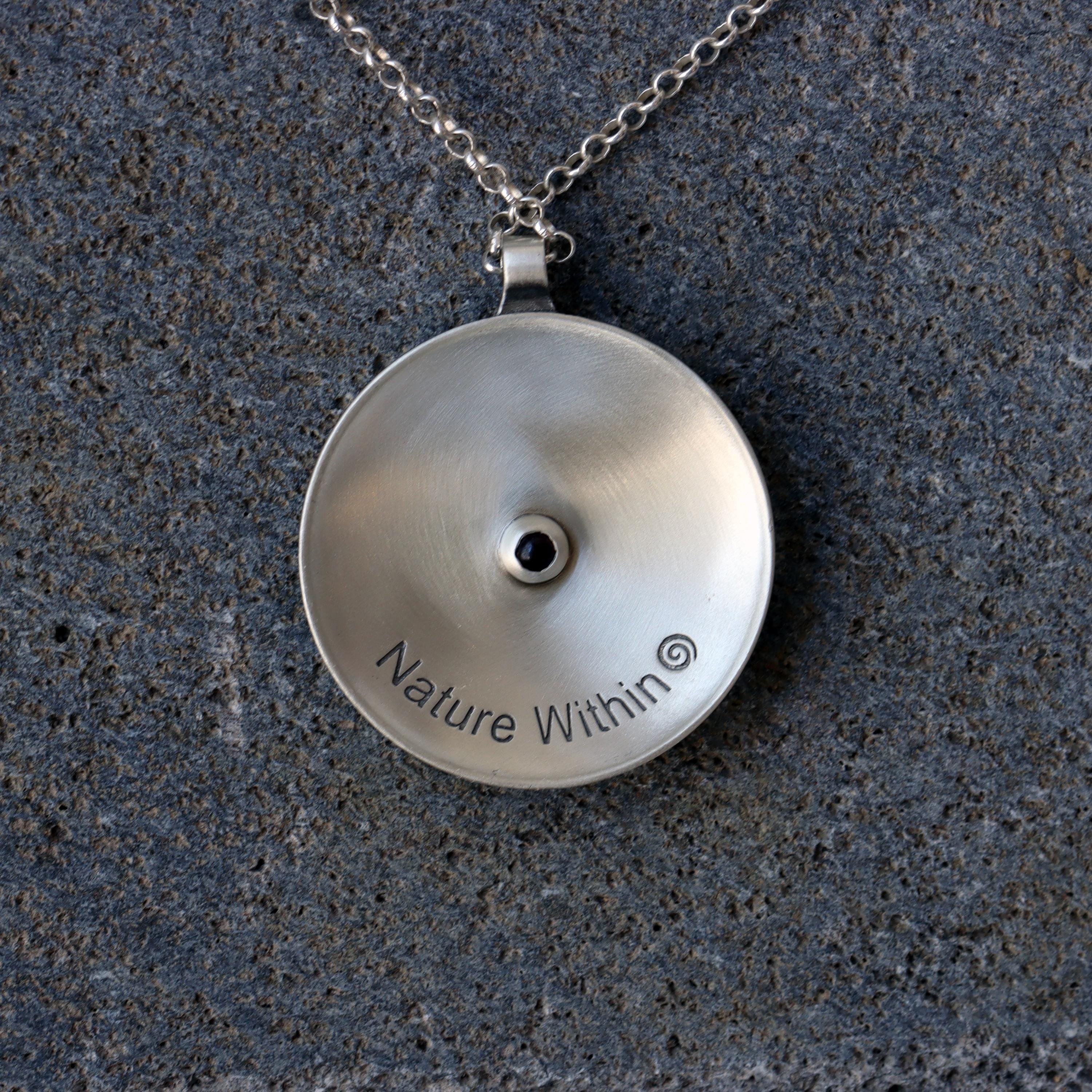 A one-of-a-kind round convex pendant adorned with hand-carved spiral textures that symbolize the eternal cycle of life, growth, and spiritual balance. Each pendant is carefully crafted from sterling silver and oxidized to achieve a rustic look, imbuing it with a soulful and tactile quality that feels both grounding and uplifting.