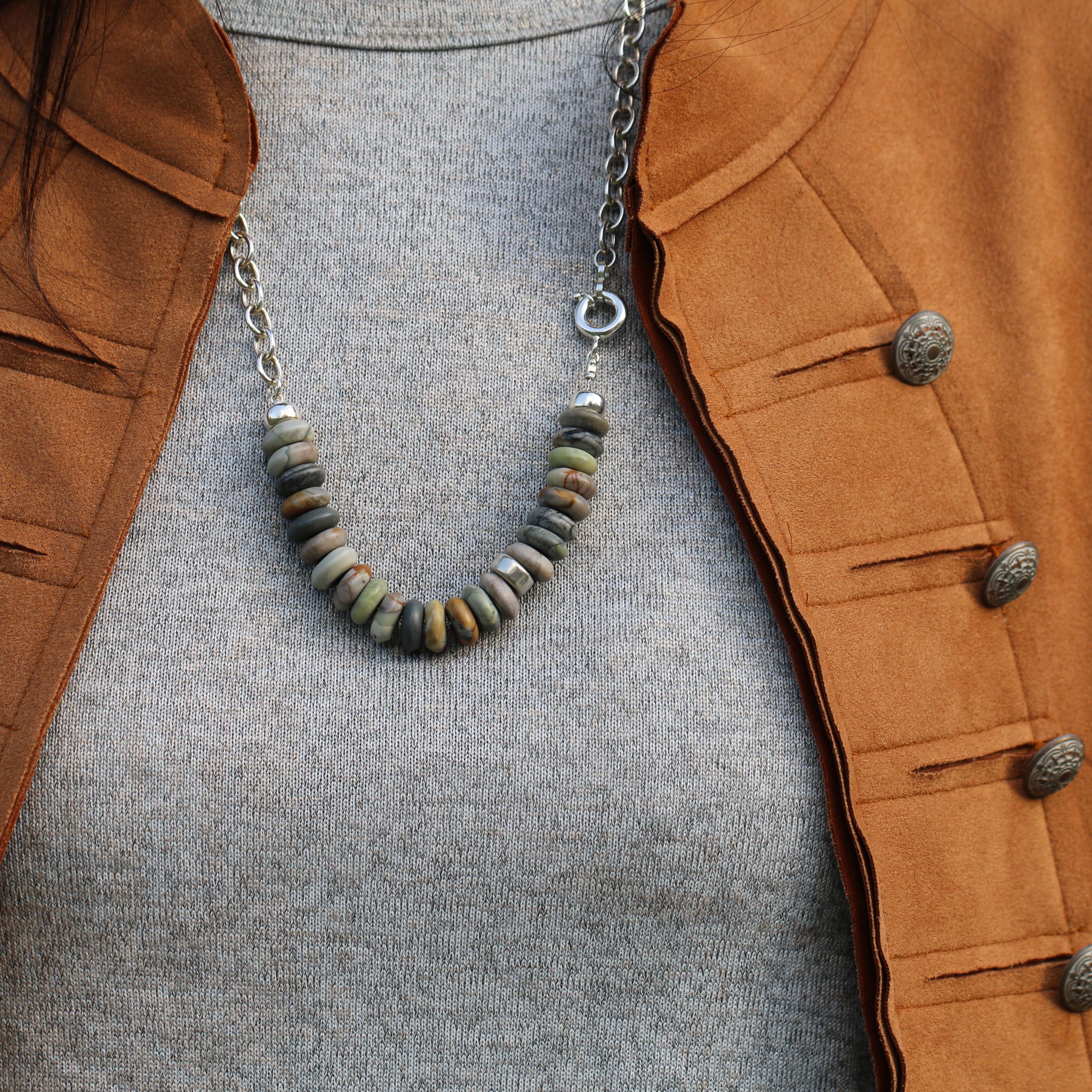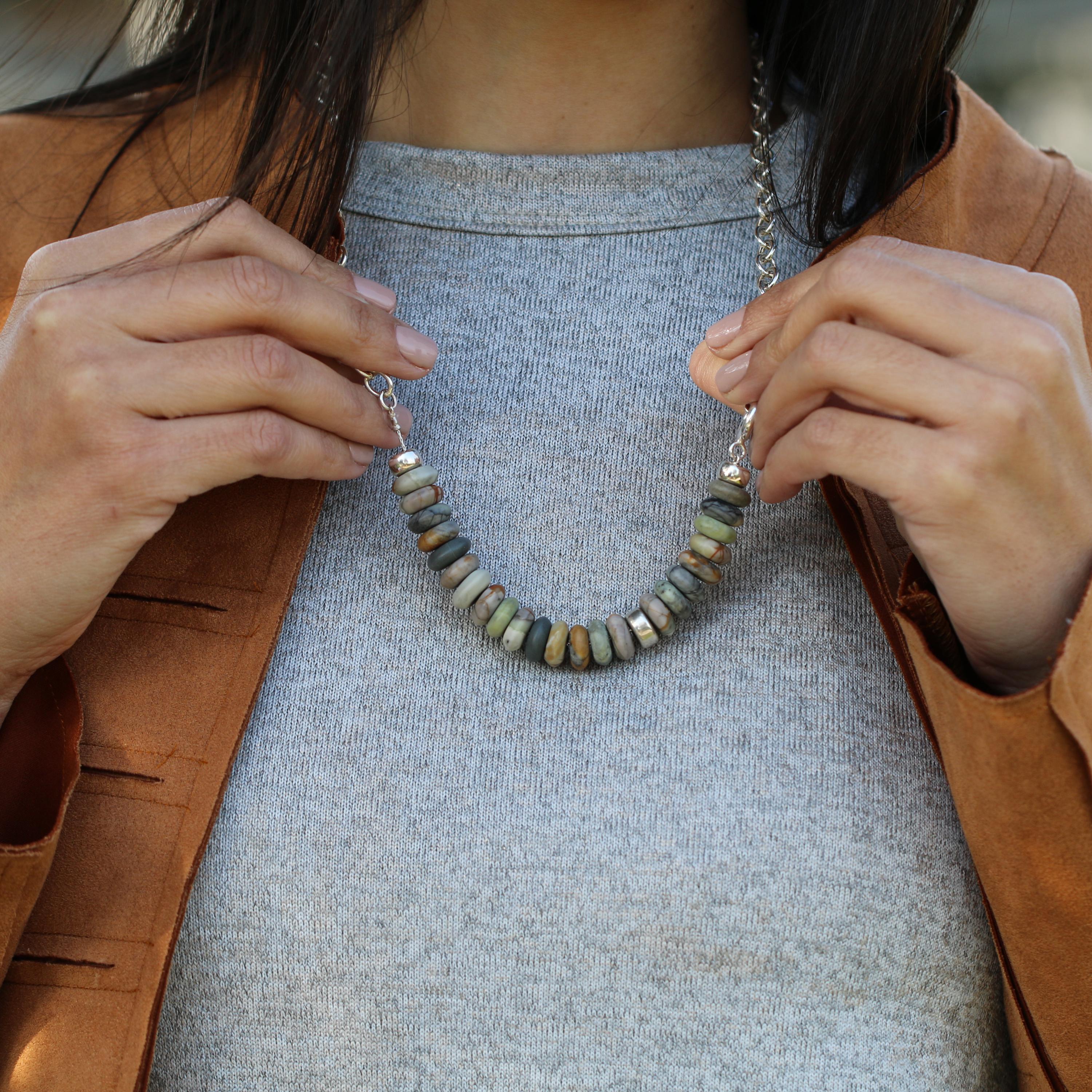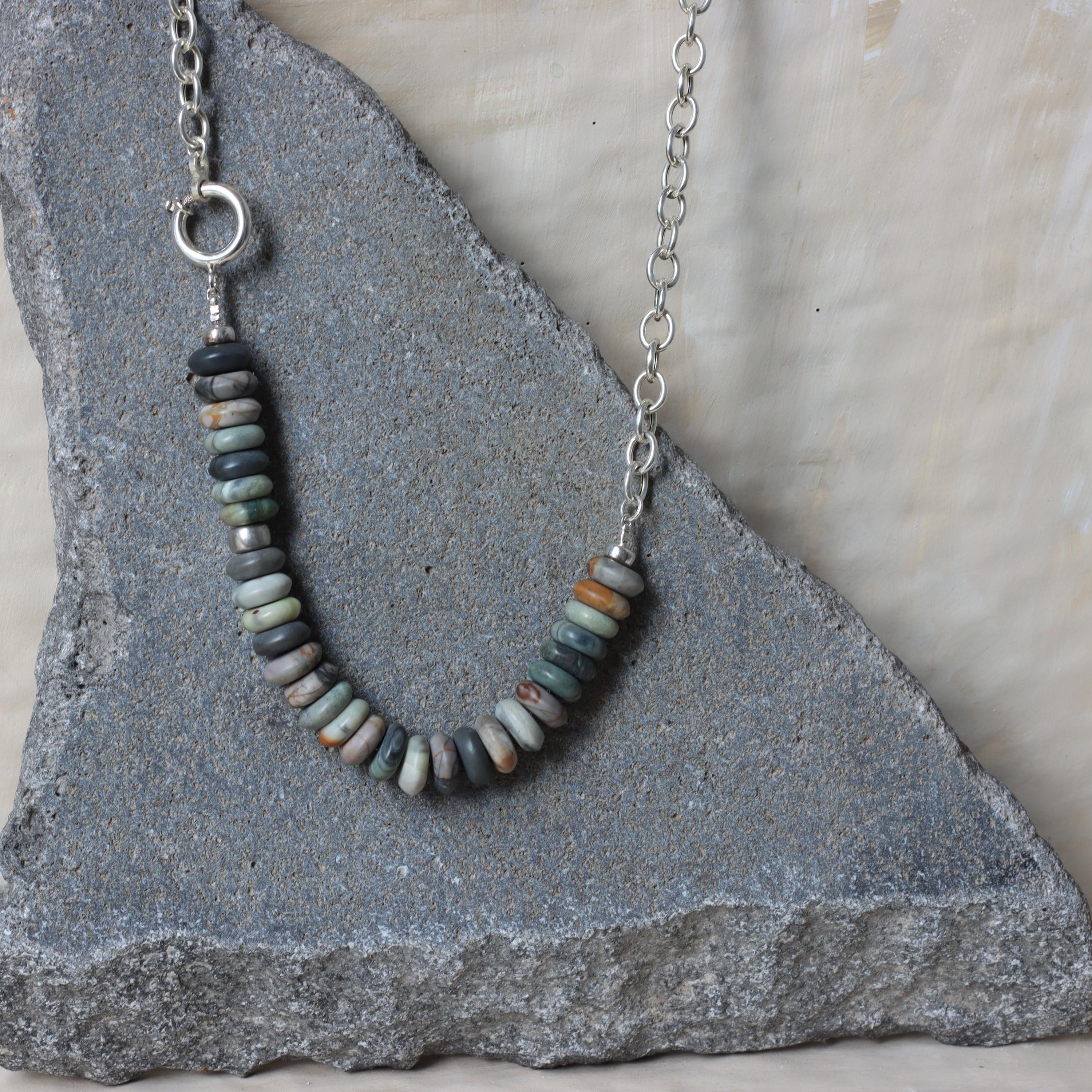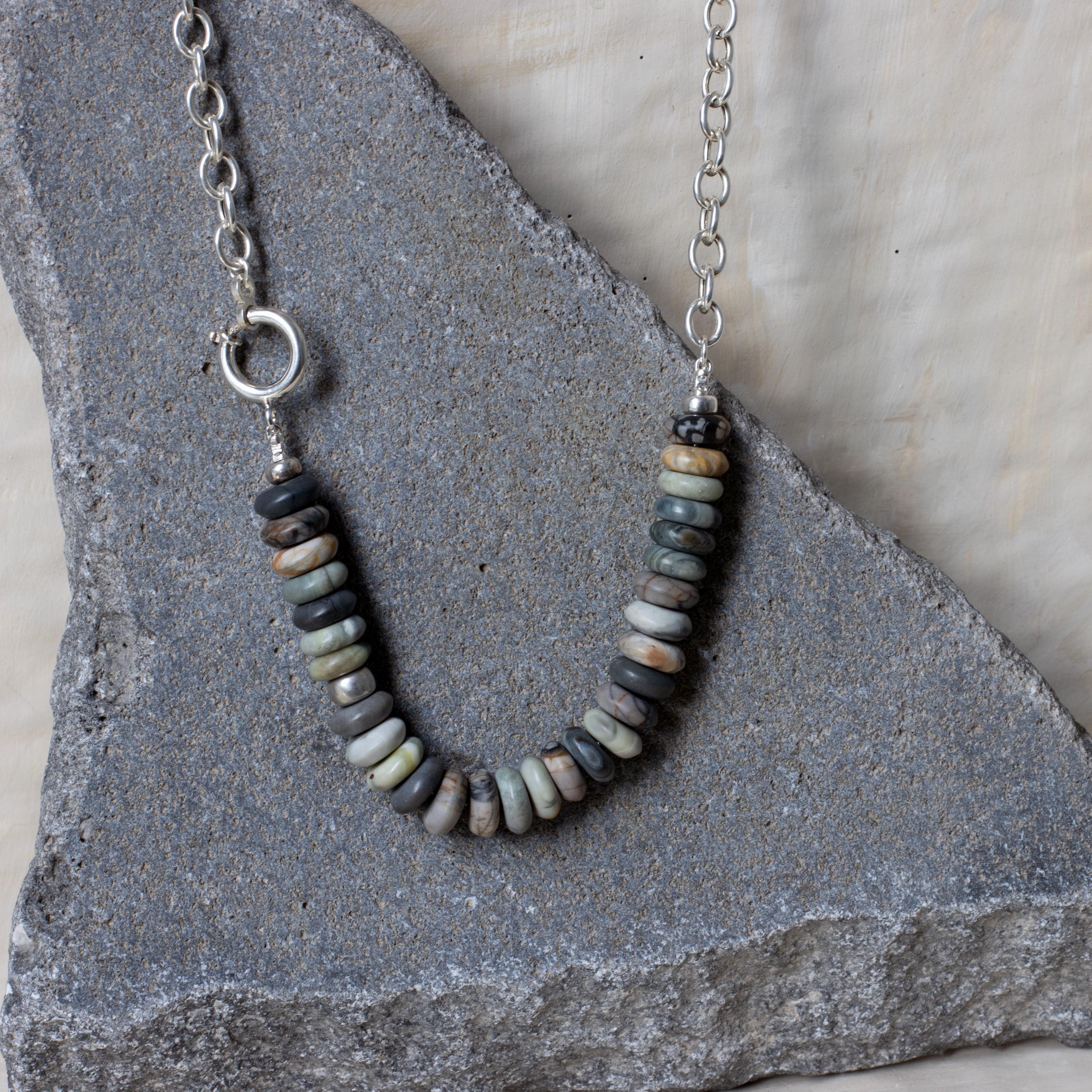 A modern earthy statement necklace, handmade with a clean silver silhouette and natural stone texture. This design combines a 925 sterling silver oval (elliptical) link chain with large Picasso Jasper rondelle beads in soft earthy neutral tones.