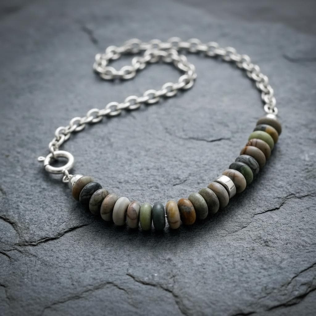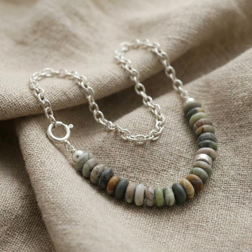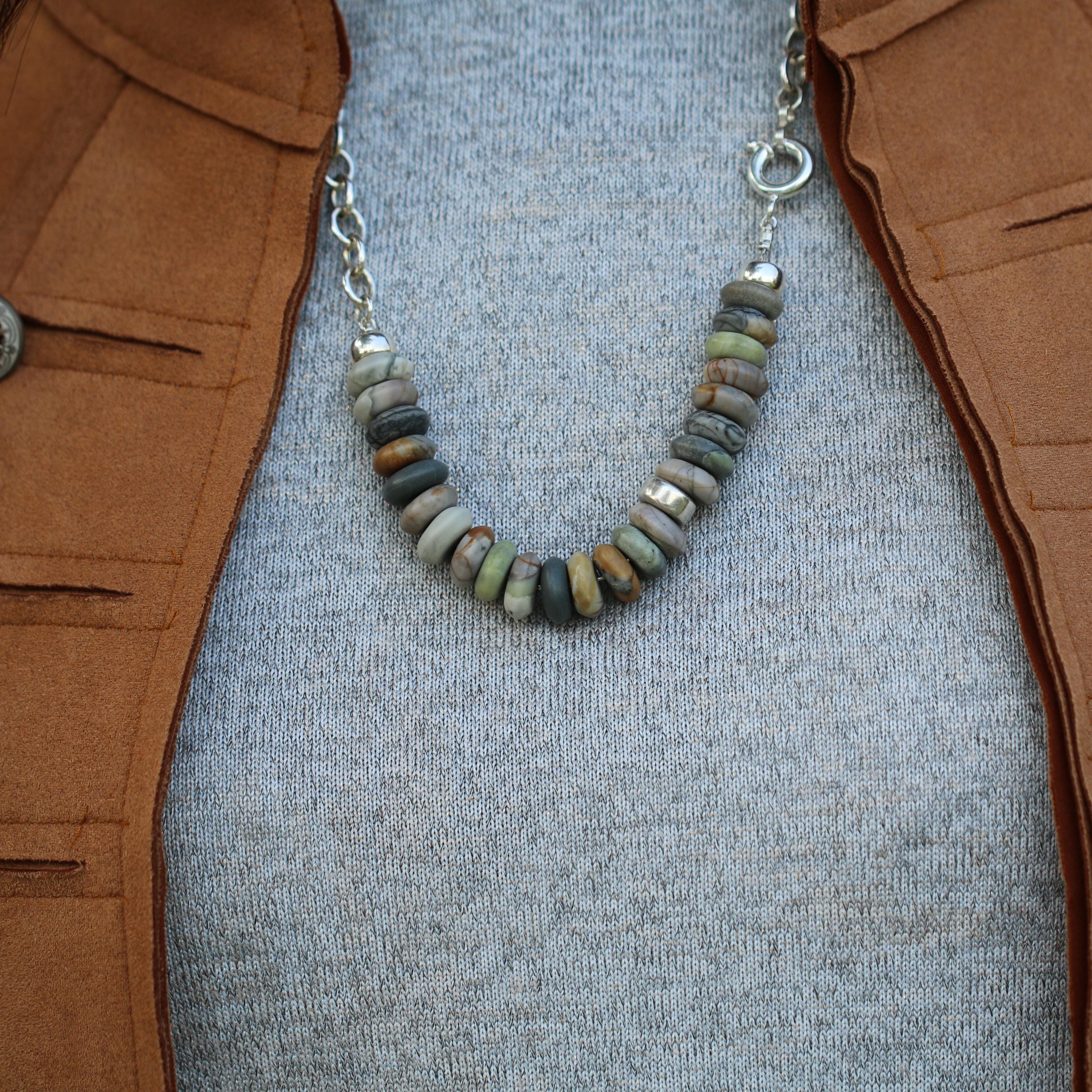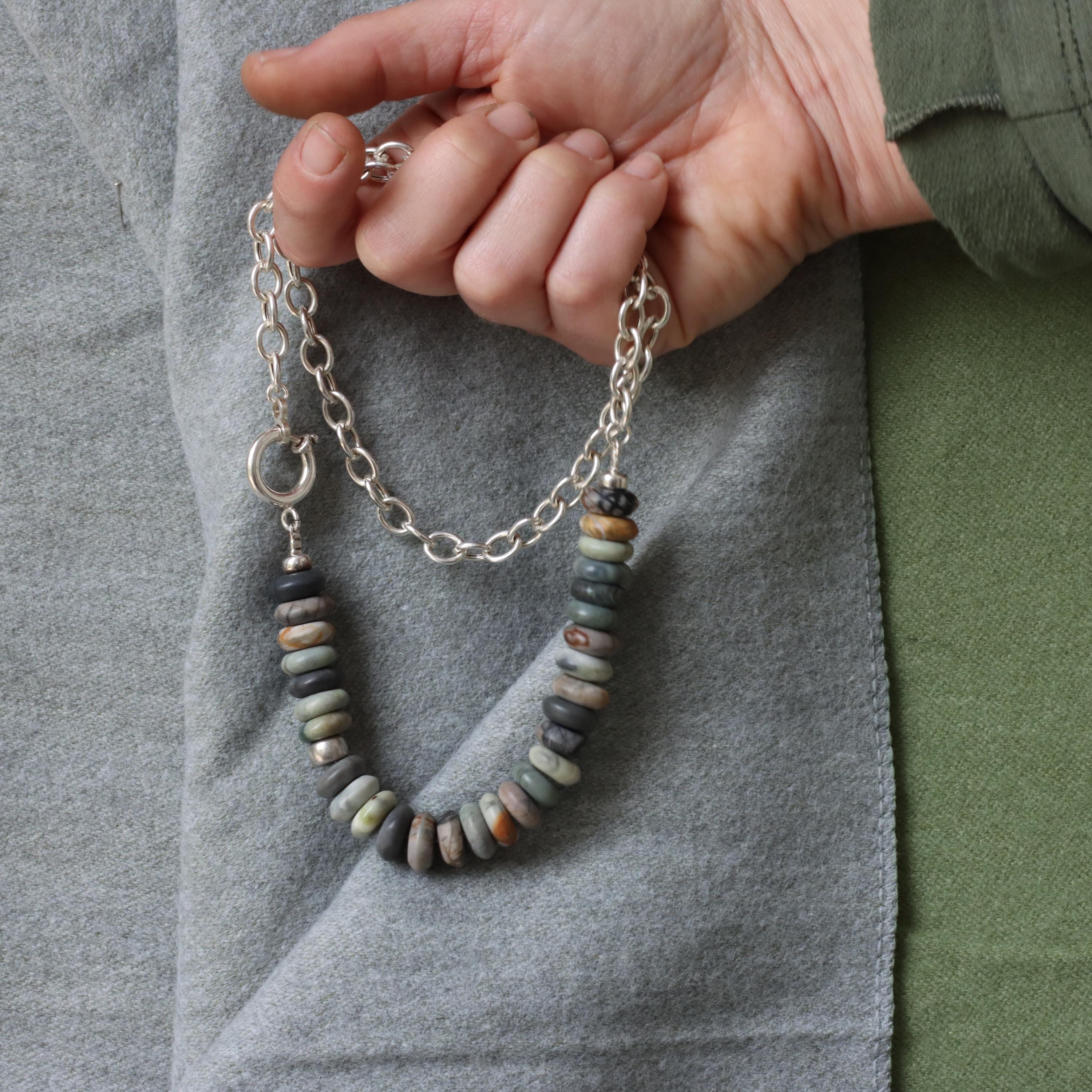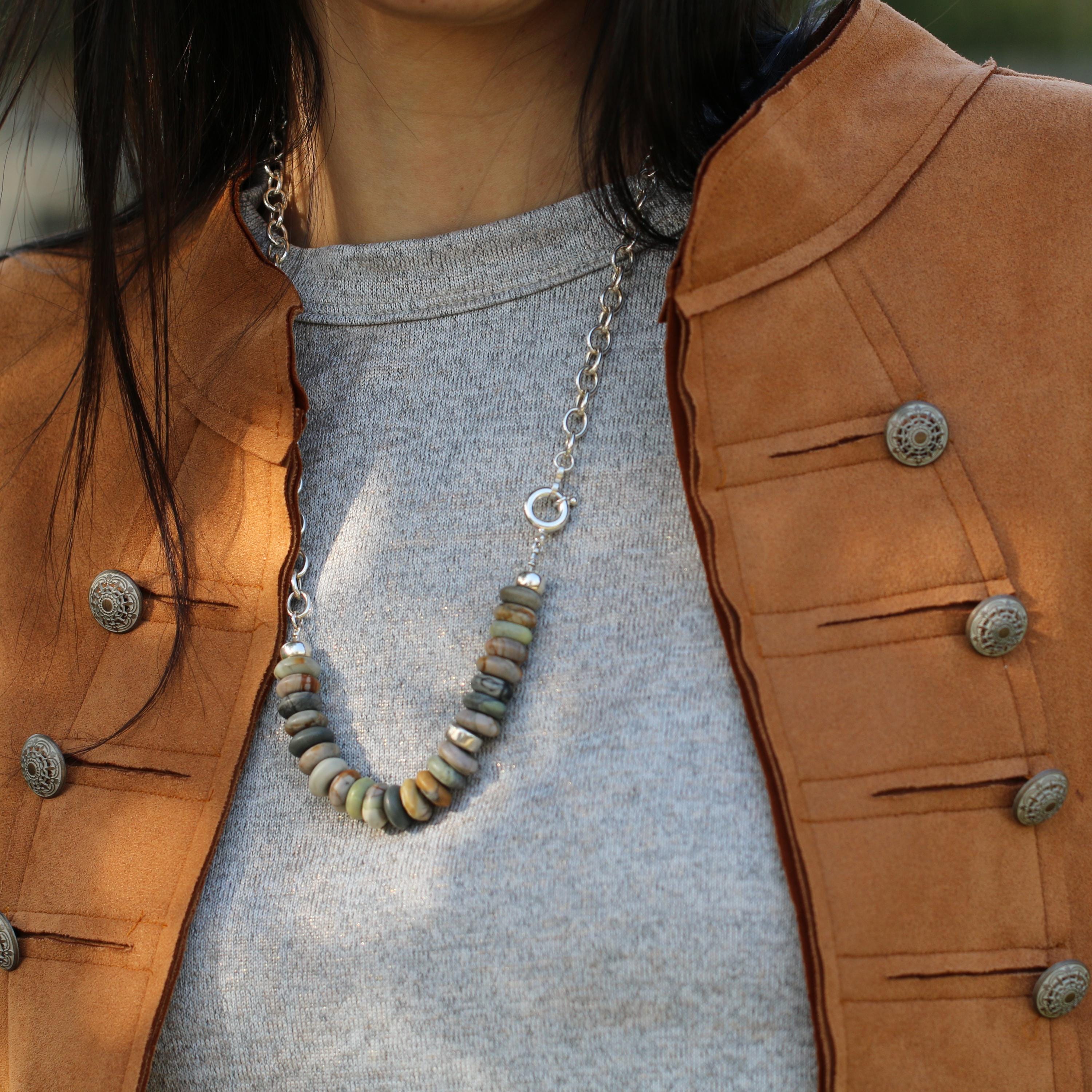 A modern earthy statement necklace, handmade with a clean silver silhouette and natural stone texture. This design combines a 925 sterling silver oval (elliptical) link chain with large Picasso Jasper rondelle beads in soft earthy neutral tones.