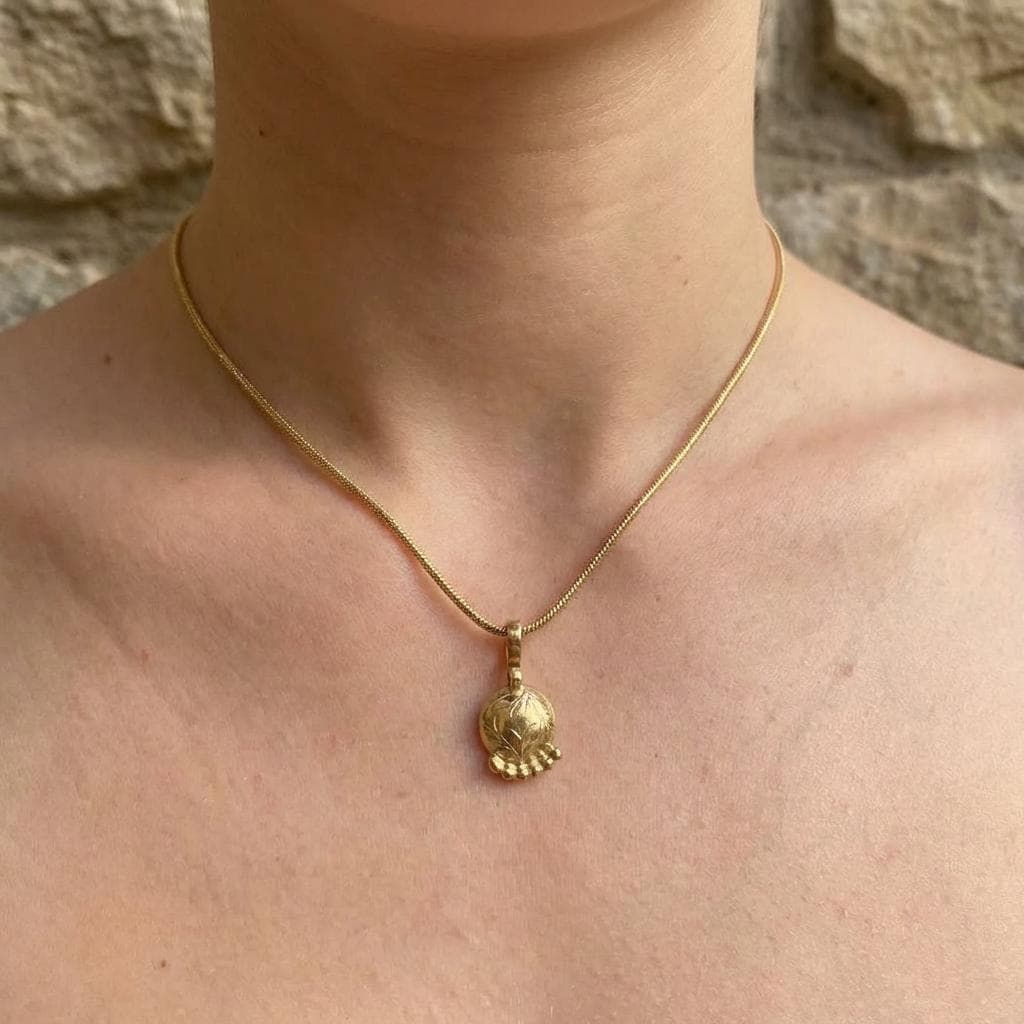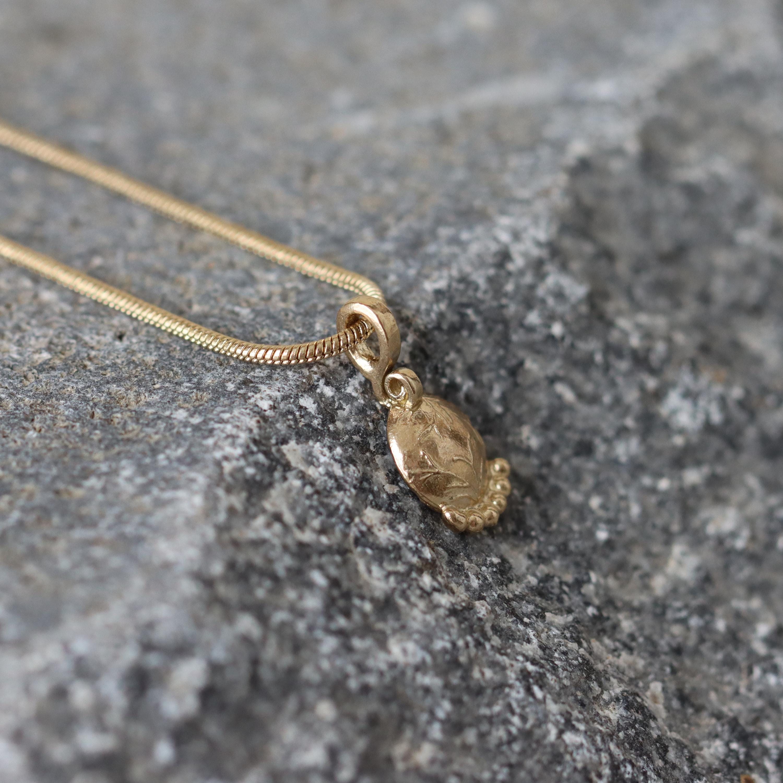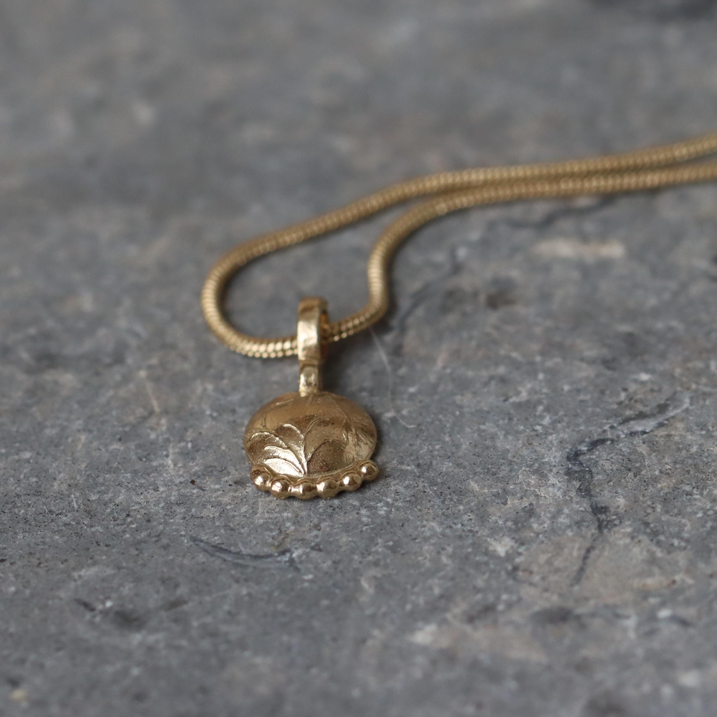 This delicate pendant is handcrafted with an imperfect botanical texture that catches the light subtly and is finished with tiny granulation details for a one-of-a-kind artisanal feel.