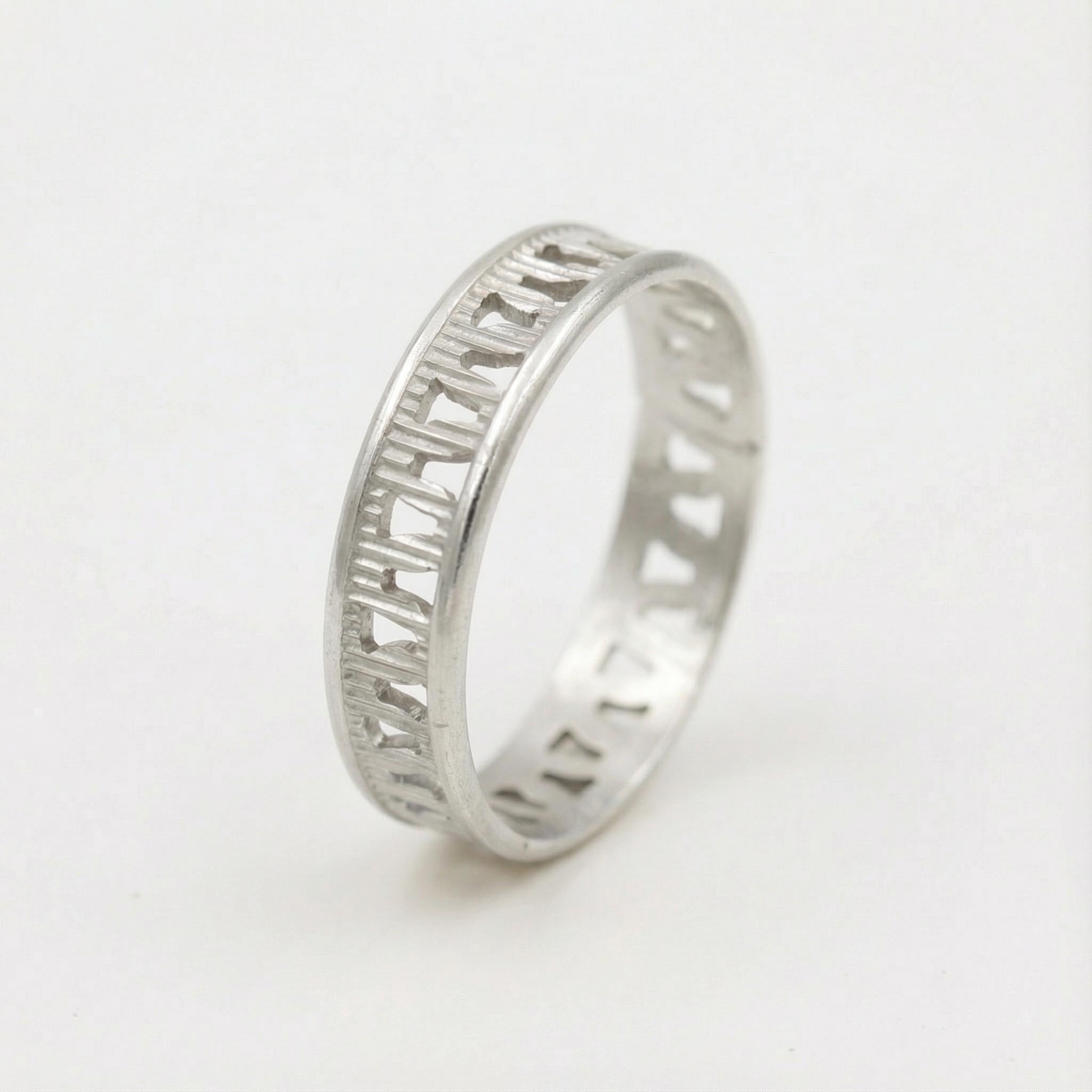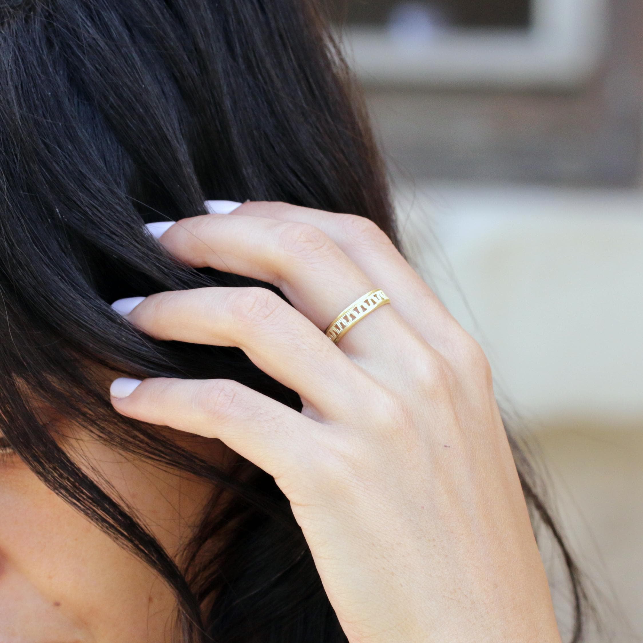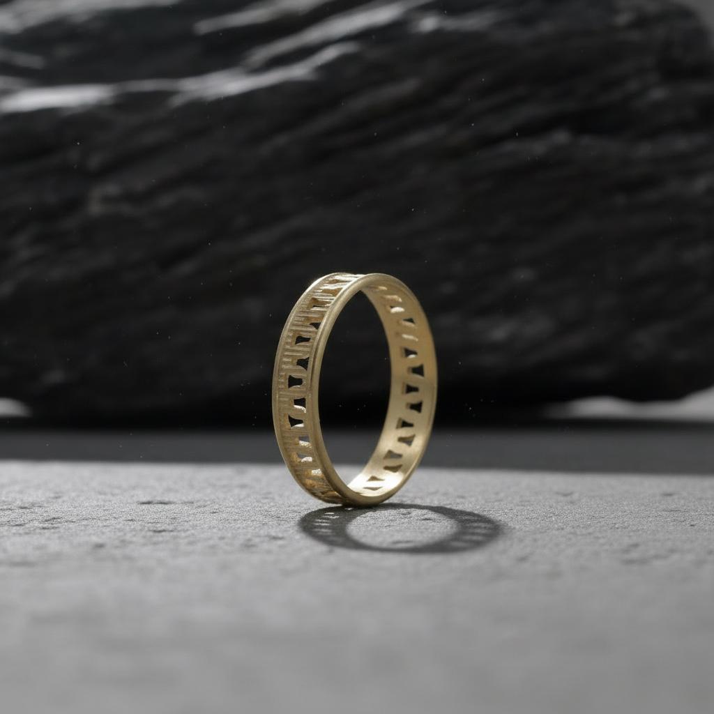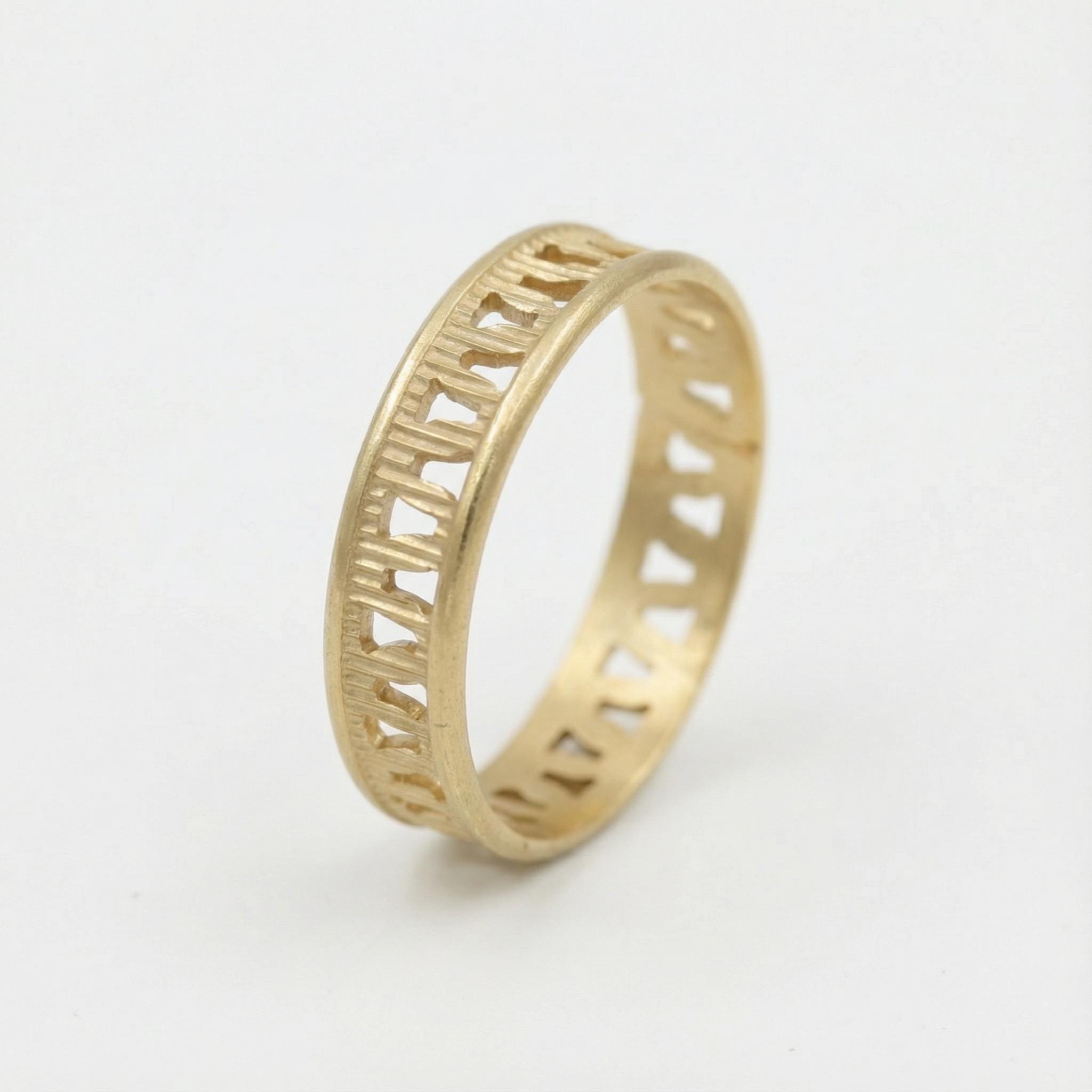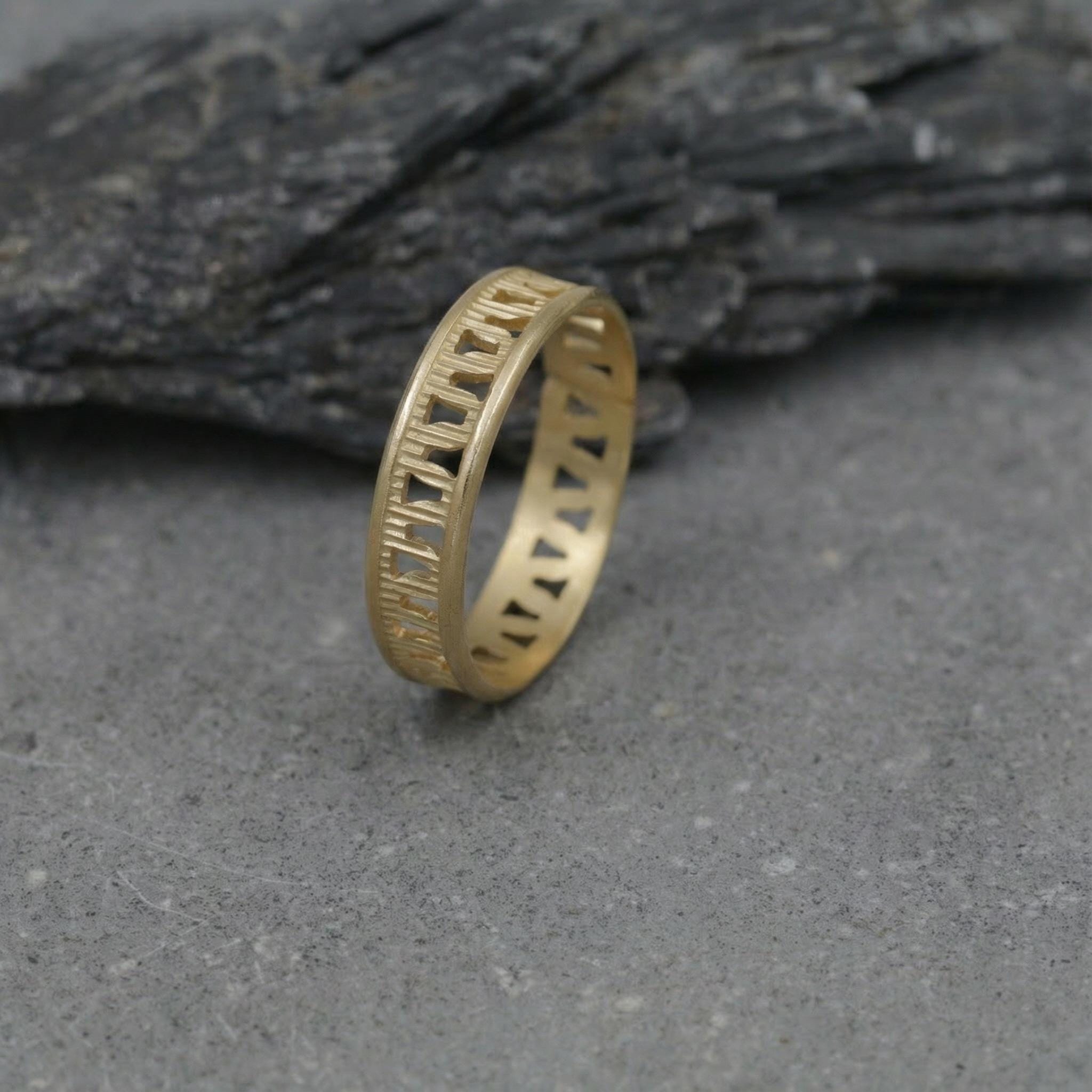 Each ring is carefully crafted by hand with a repeating geometric pattern that symbolizes strength, clarity, and personal expression. Its matte texture and airy design make it perfect for daily wear, stacking, or gifting to someone who loves refined, artistic gold jewelry.